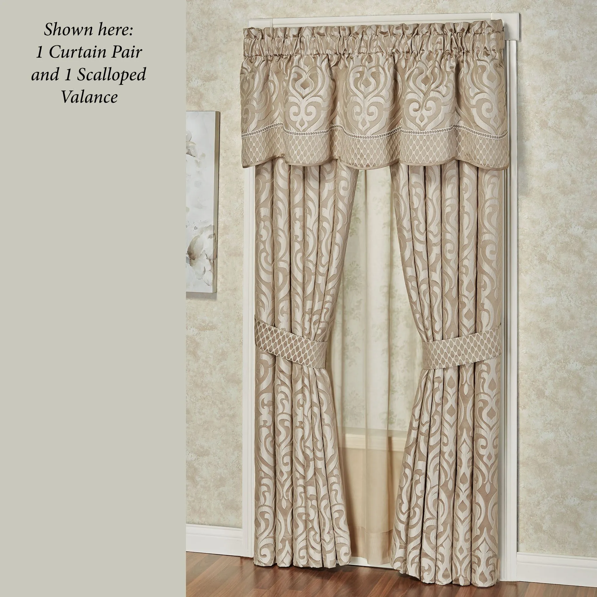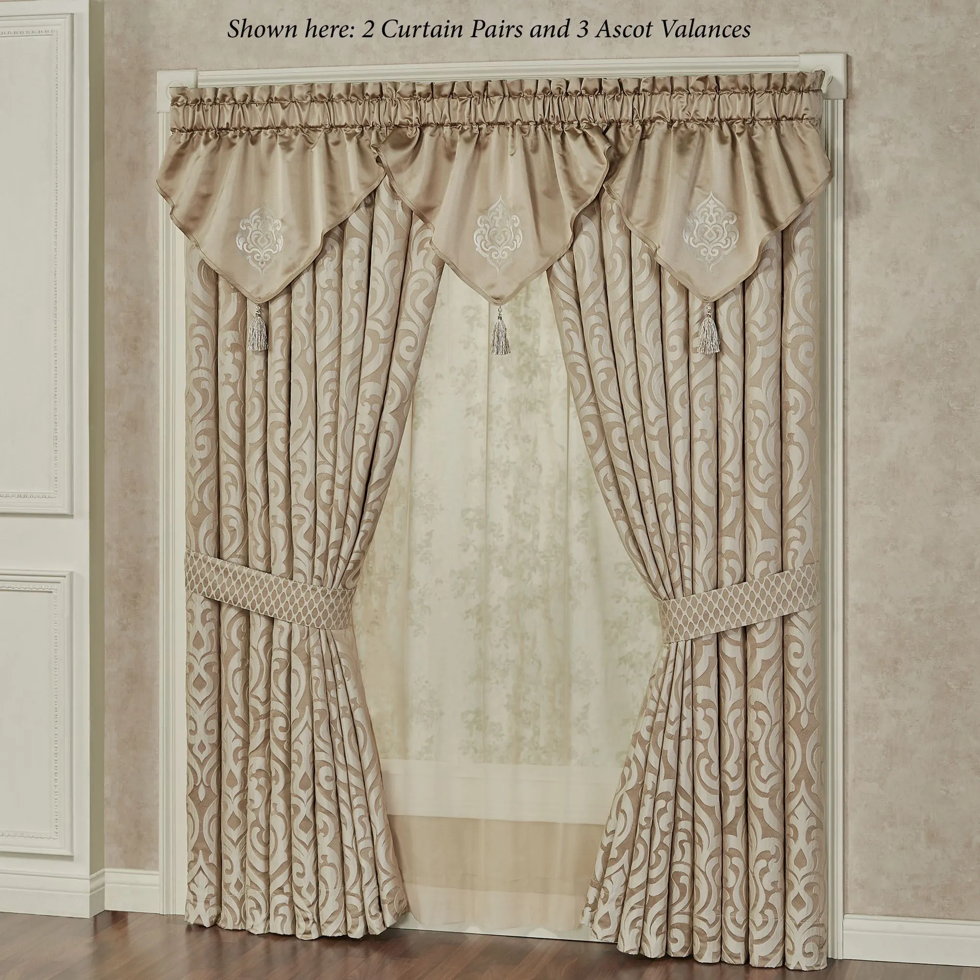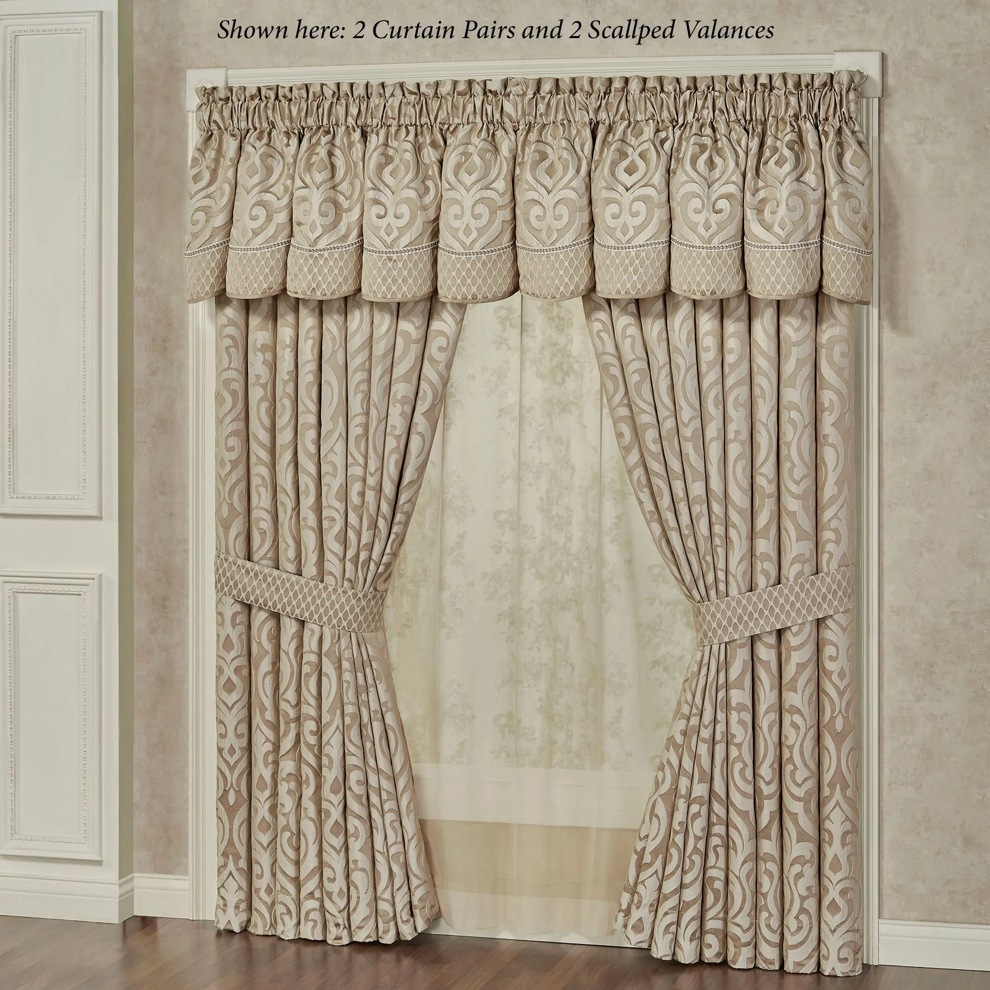Window Treatment has 3" rod pockets. The tailored, lined Wide Curtain Pair has puffed scrolls and includes tiebacks. Curtains are available in two lengths. Each Ascot Valance has damask embroidery and a tassel on the end. Lined Scalloped Valance has puffed scrolls and ovals along with gimp trim.