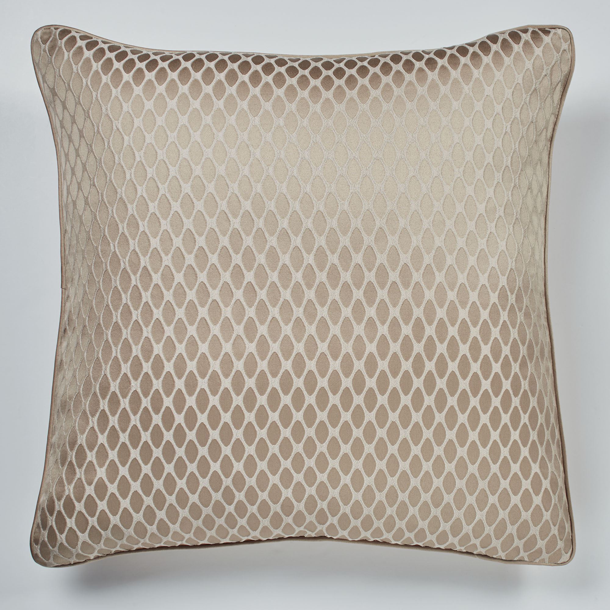Piped European Sham has puffed oval shapes on sand and a zipper closure.