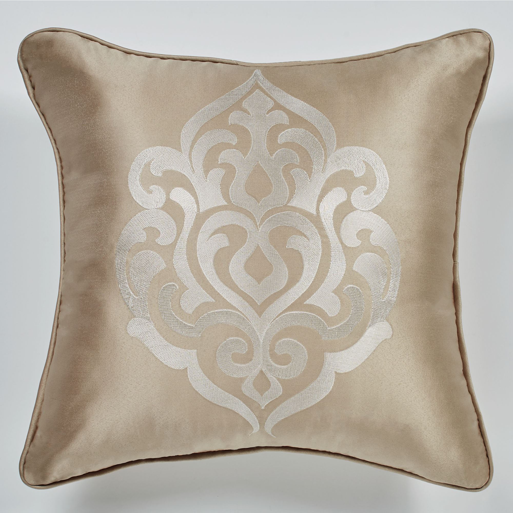 Pillows: Spot clean. Piped Square is solid sand with damask embroidery; reverse has puffed oval shapes. Piped sand Rectangle is pieced with puffed scrolls, oval shapes, and gimp trim; reverse has puffed oval shapes. Solid sand, reversible Round is pleated with a button tuft and a 3" gusset.