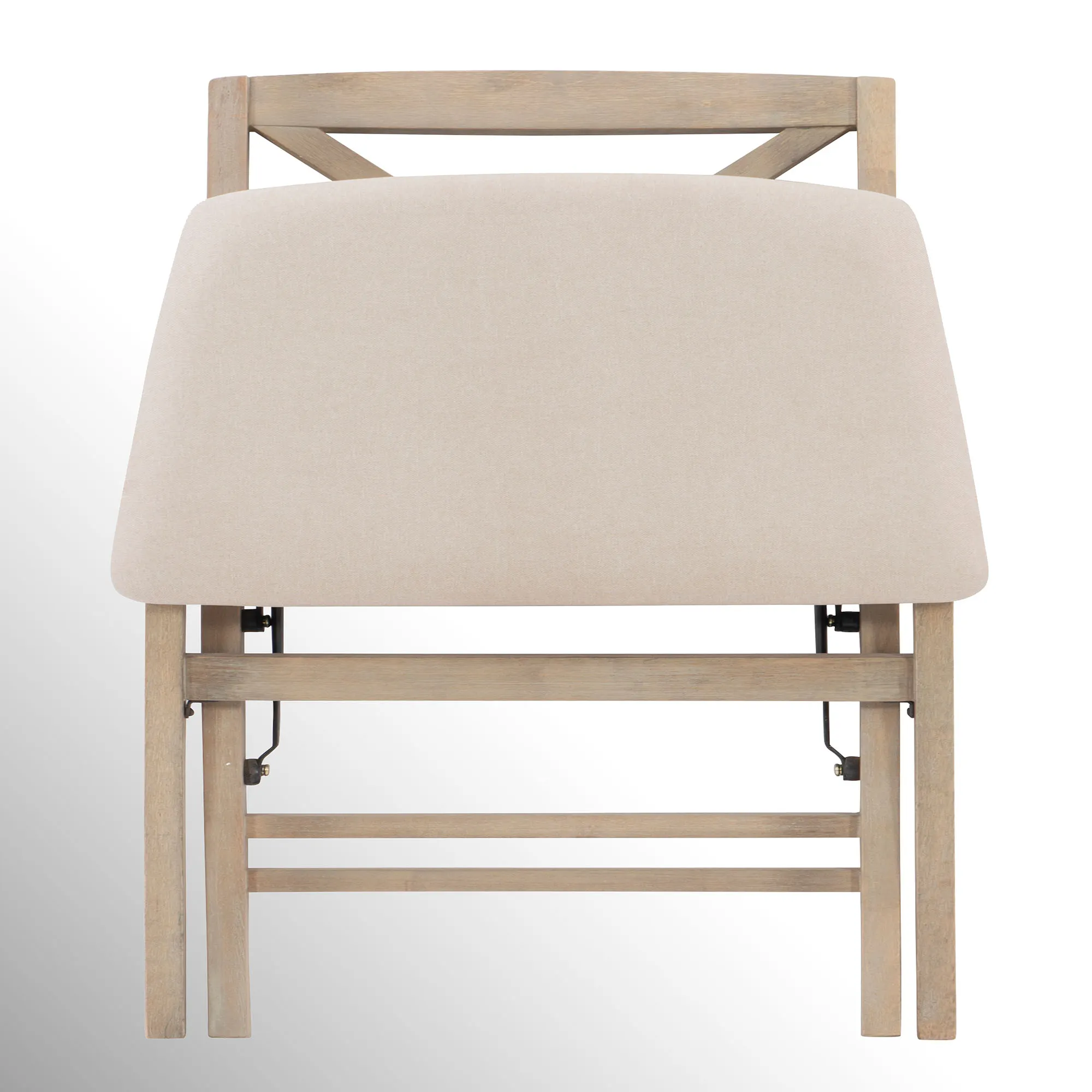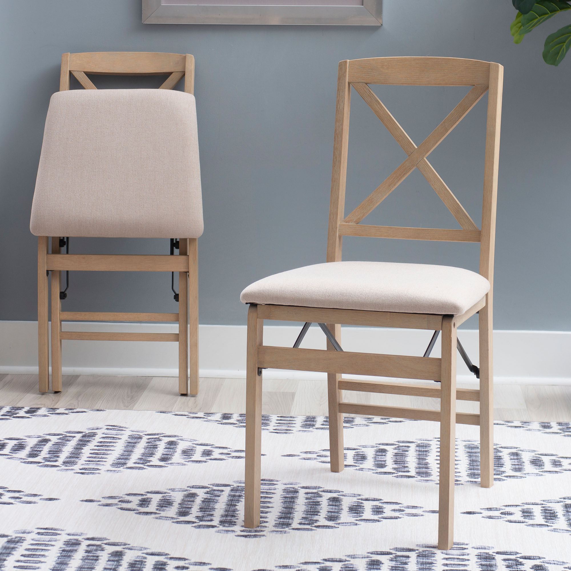 Never worry about where everyone is going to sit at family functions and dinner parties again with the Dawson Folding Chair Set. This wooden pair of folding chairs features a classic cross-back design, a natural wash finish, and a comfortable padded seat covered in a neutral beige woven fabric. Seat dimensions are 17"Wx15.5"D, and seat-to-floor height is 19". The folding chairs are fully assembled, have a steel folding mechanism, and are easy to set up and store. Cushion fill is foam. Overall, each folding chair is 17"Wx21"Dx35"H. Set weighs 26 lbs. Spot clean the fabric.