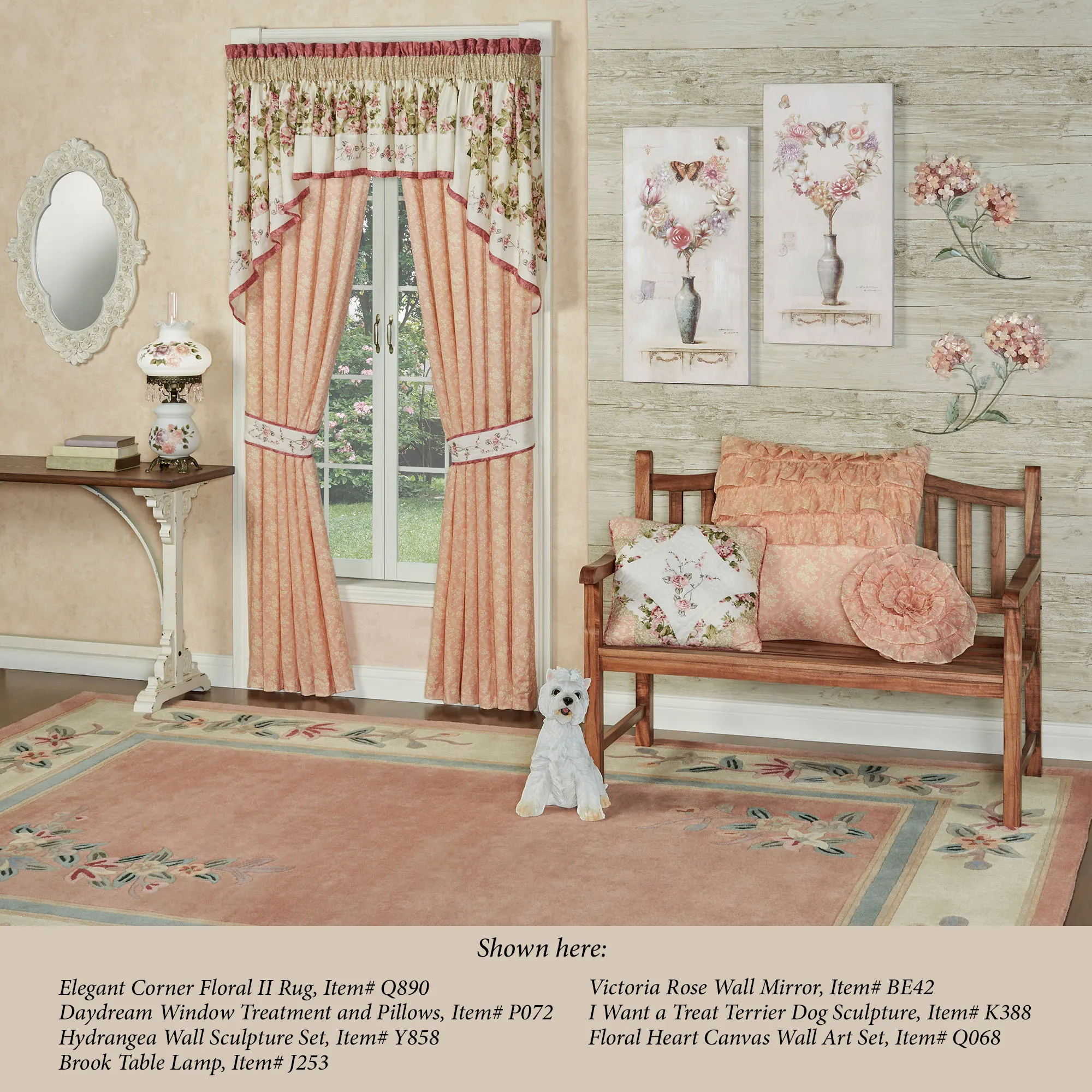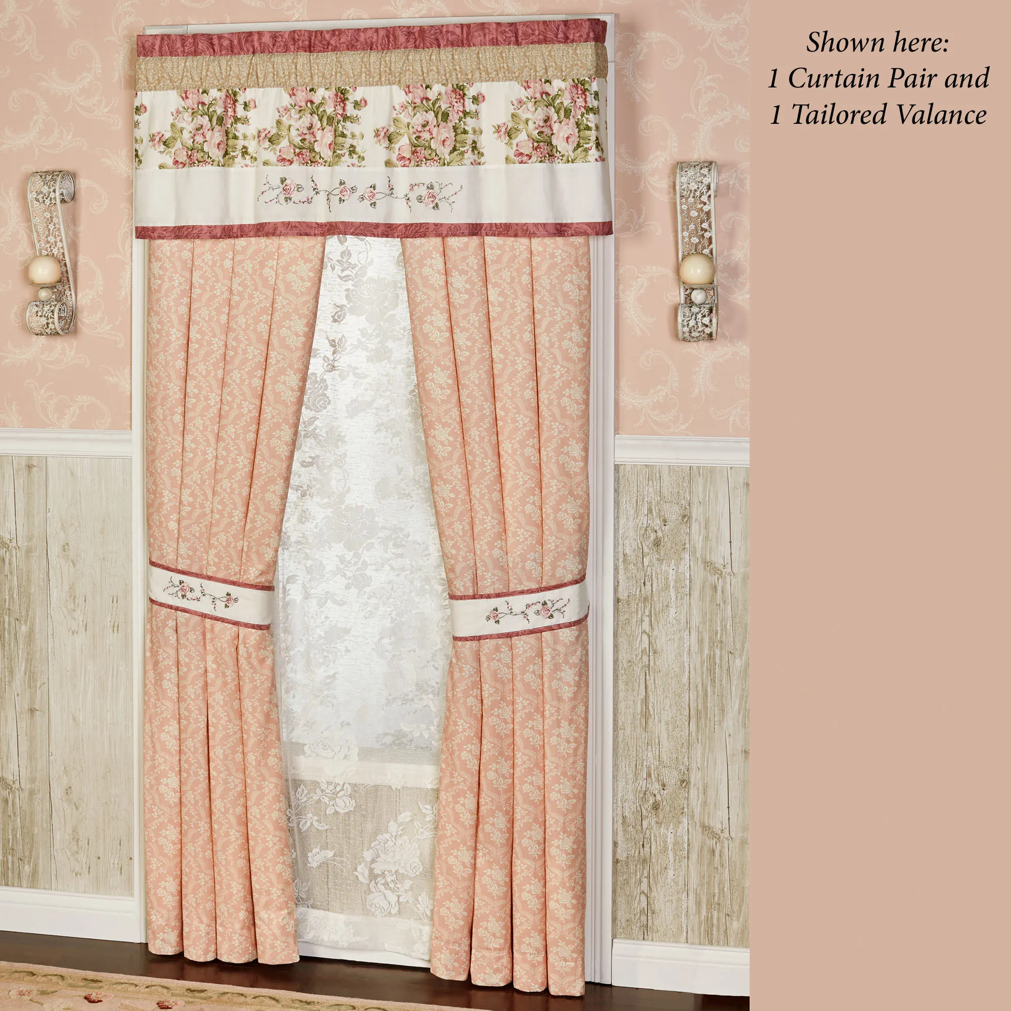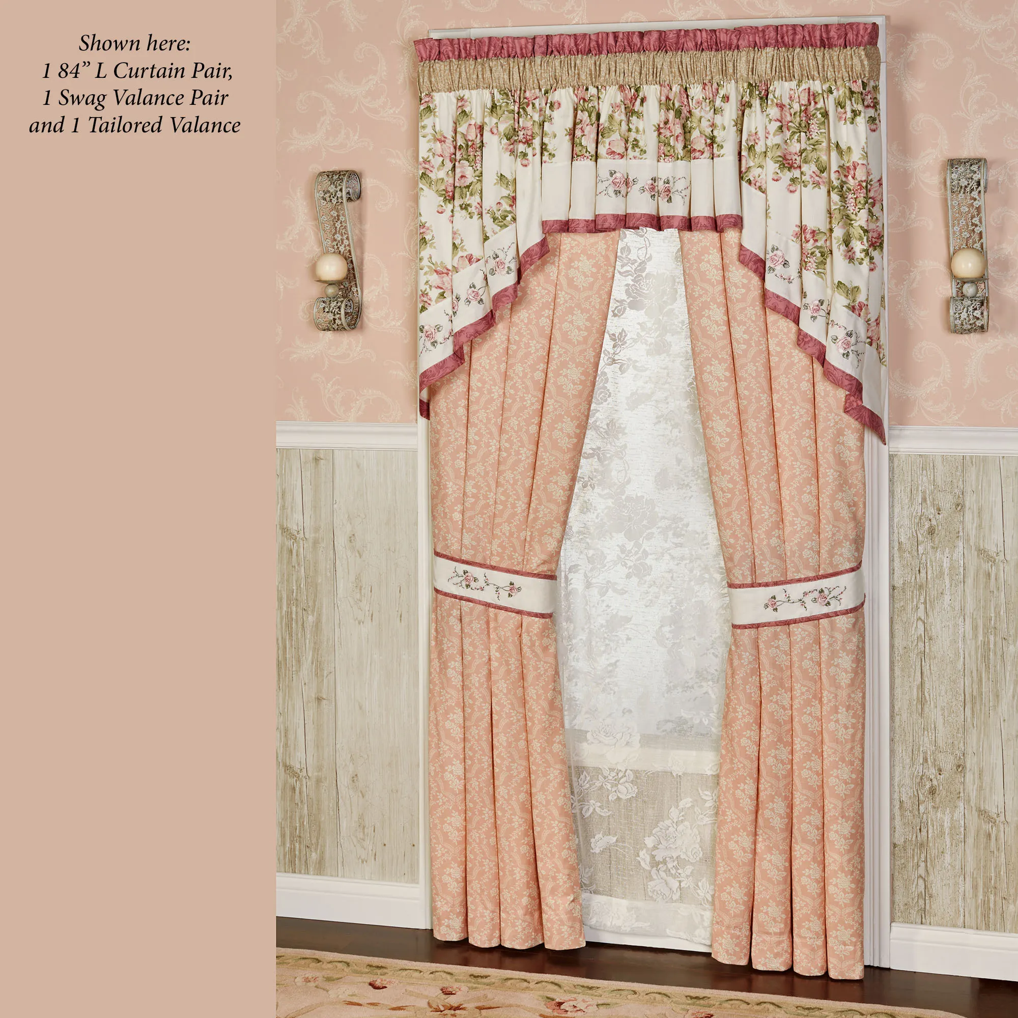 Window Treatments have a 3" rod pocket; all are lined, except the Scalloped Valance. Tailored Curtains are mellow rose with ivory bouquets and include embroidered tiebacks. Swag Valance Pair has a pieced face with an embroidered bottom. Scalloped Valance (no longer available) has alternating ruffled layers. Tailored Valance is pieced with an embroidered bottom.