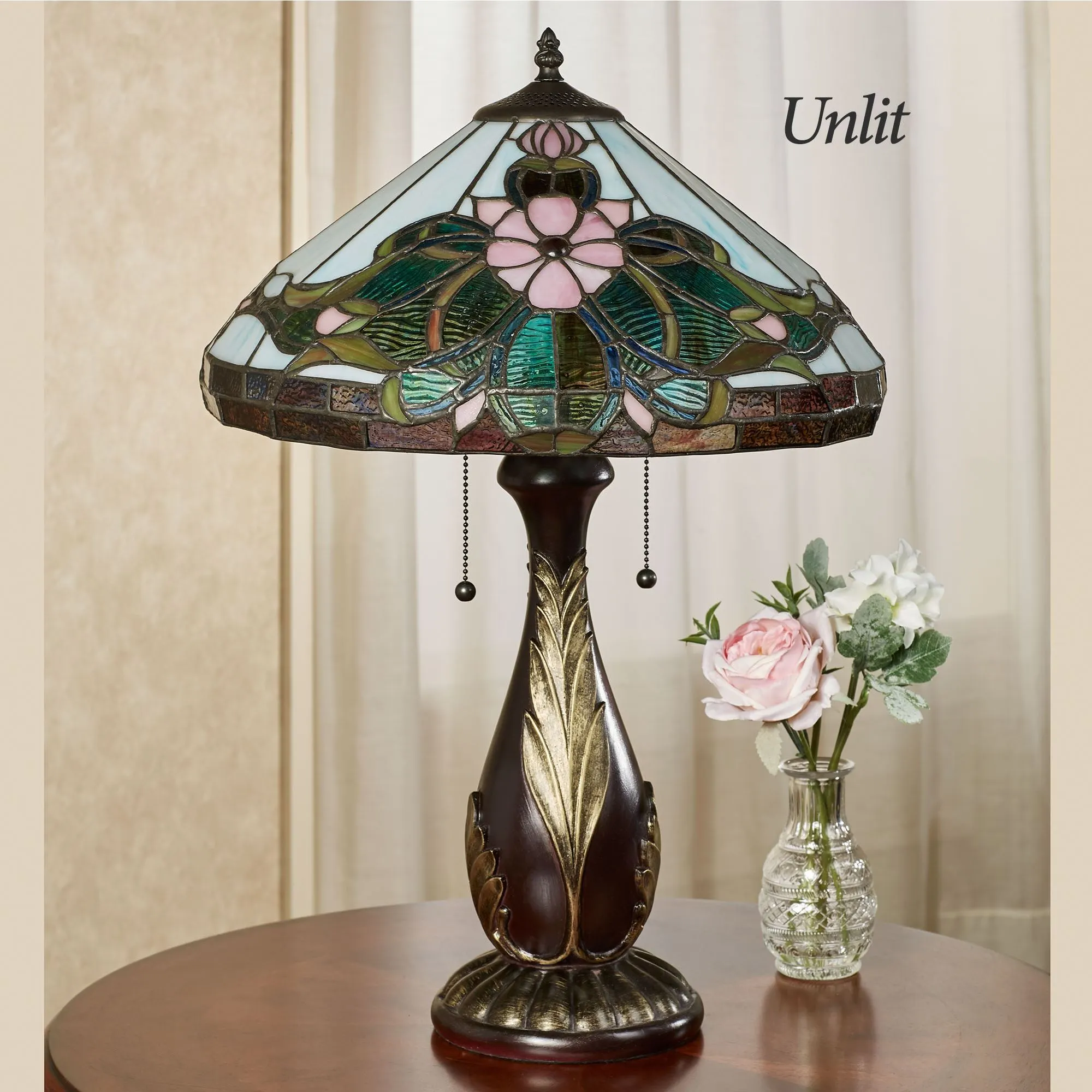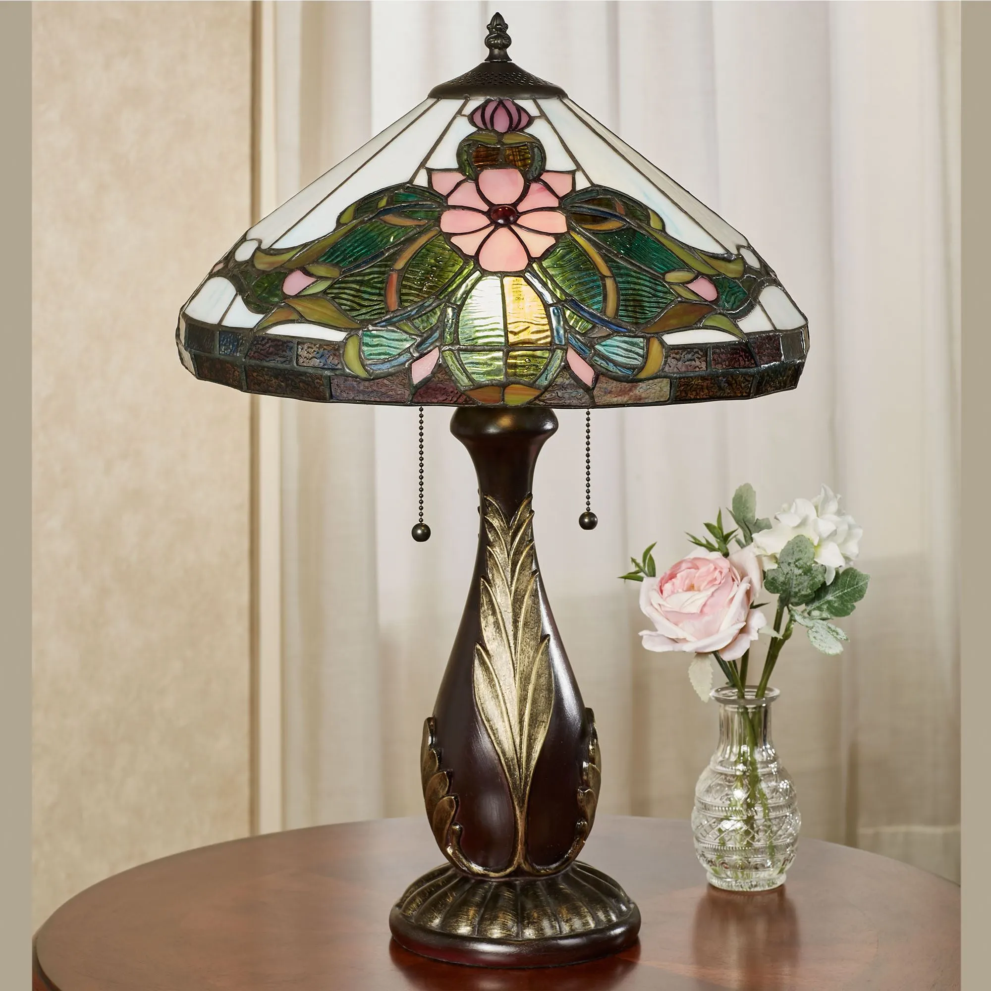 The DeAndra Stained Glass Table Lamp dazzles with timeless beauty. The hand-cut and hand-soldered stained glass shade features floral flourishes with gem accents among leaves. Approx. 250 glass panes are done in shades of ivory, light teal, green, pastel pink, and amber. The bronze resin font has raised, brushed gold acanthus leaves and a fluted round base. UL listed. Dual pull chains require two 60W max. bulbs. Measures 16"dia.x24.5"H; weighs 10 lbs.