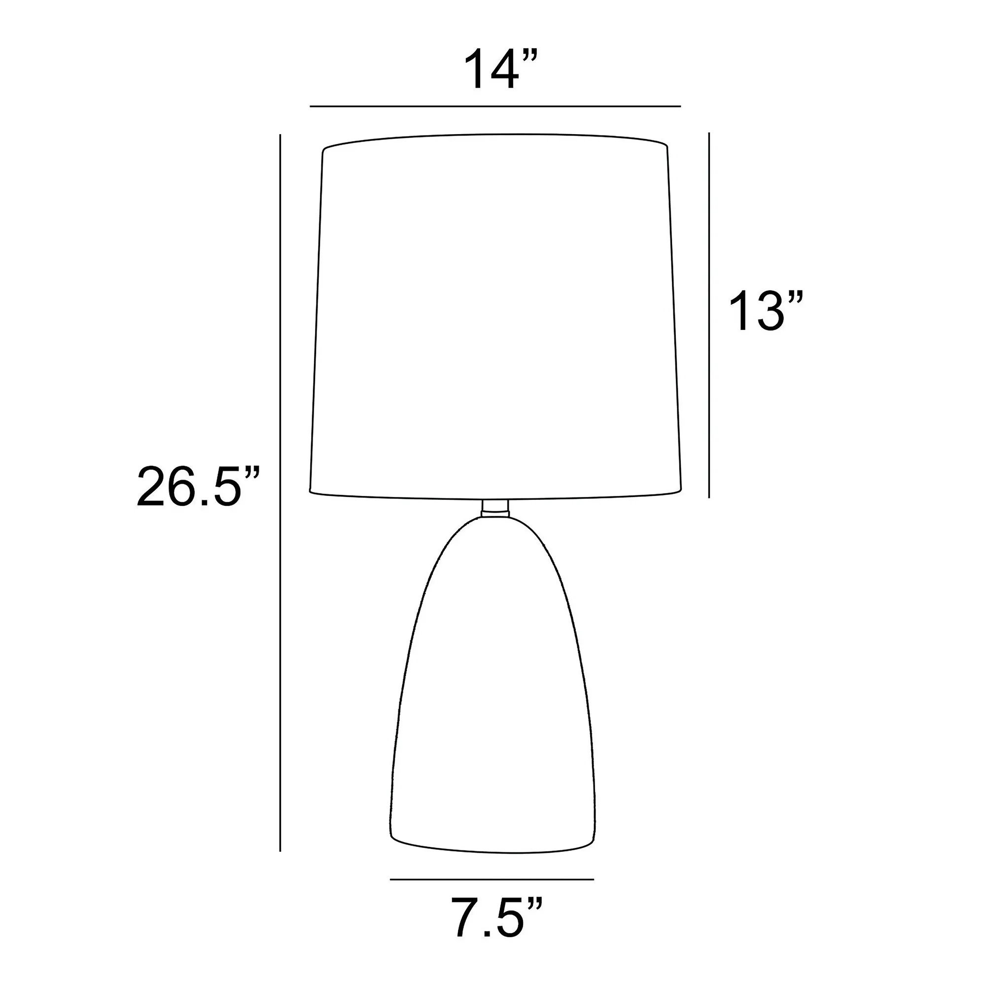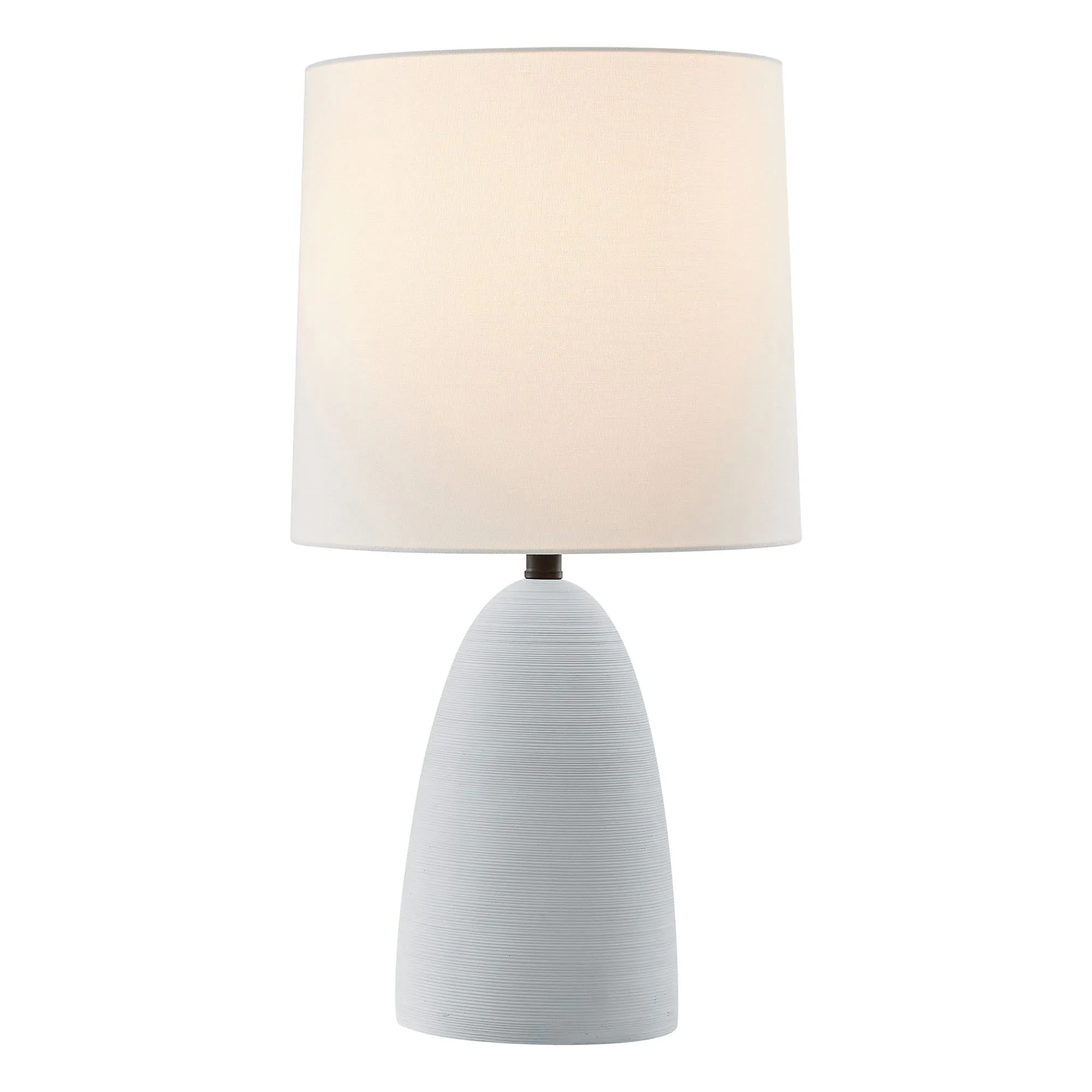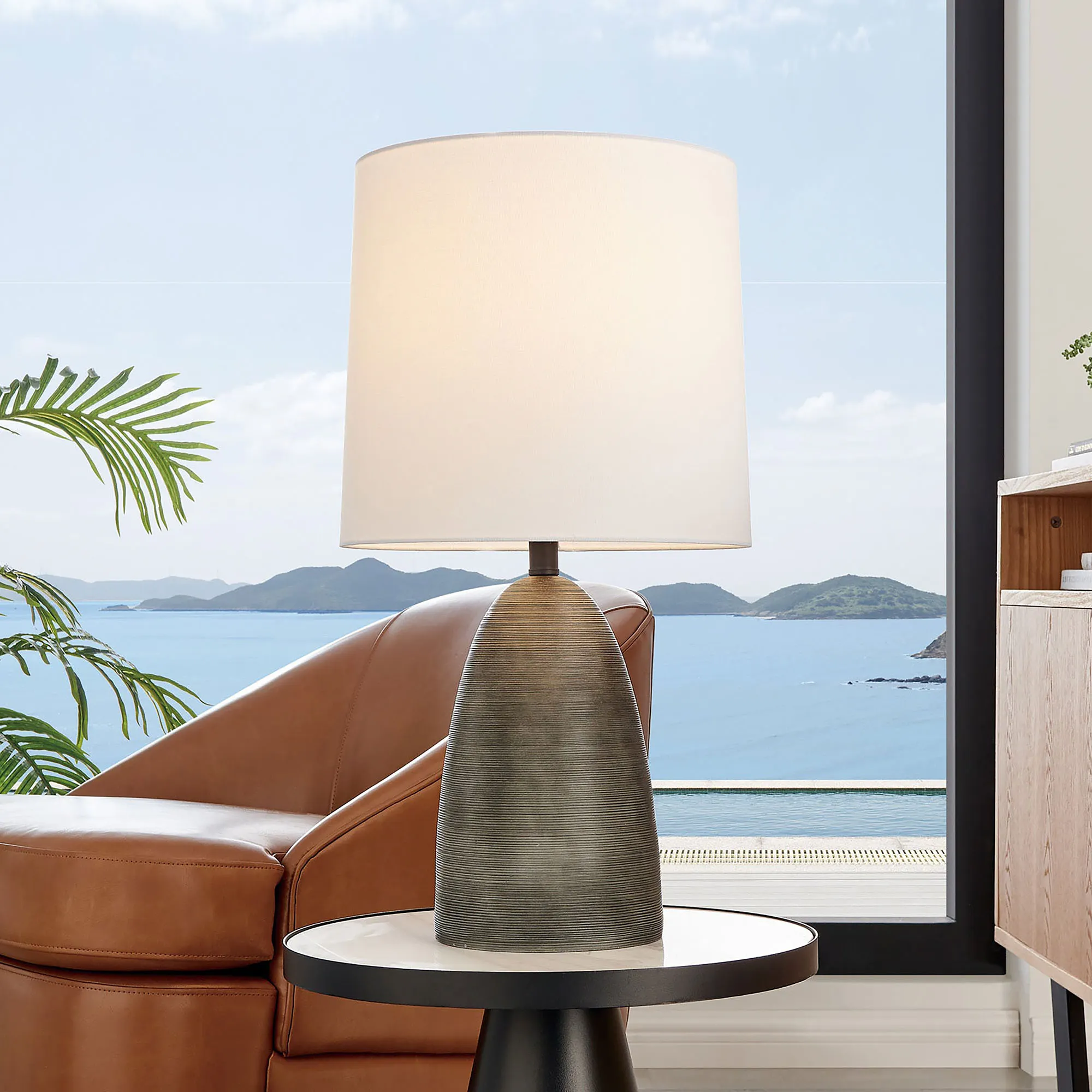 Illuminate your patio or outdoor space with the Decker Table Lamp. Made of cement, this modern table lamp has textured grooved line designs on a rounded pyramid-like font that starts small and gets larger toward the bottom. UL listed. The cordless lamp has a white, weatherproof fabric shade and requires one 5.6W LED dimmable and rechargeable bulb, included. The on/dim/off button is located on the bottom of the bulb; simply remove the bulb to adjust the light. A charging cable is included. A fully charged bulb can provide up to 24 hours of continuous light. Indoor or outdoor seasonal use; do not expose this lamp to freezing temperatures. Measures 14"dia.x26.5"H; weighs 14 lbs.