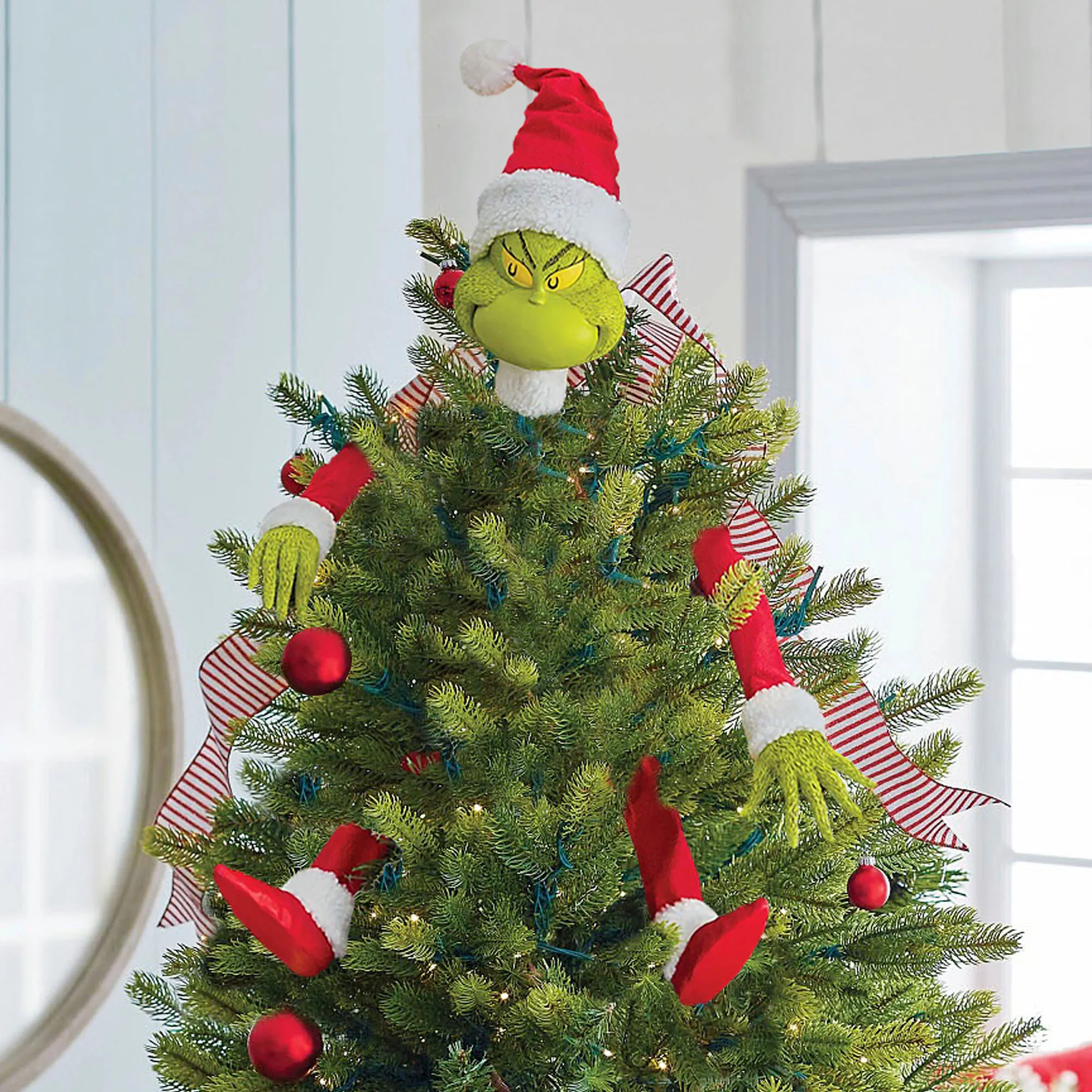 The Decorate Grinch in a Cinch Tree Topper Set makes your Christmas tree look like a grumpy visitor is stuck among the branches. Dressed in a classic red suit with furry trim, The Grinch(TM) can be posed with bendable leg and arm picks. His right hand includes a hook to recreate his classic pose with your ornament. Complete with a Santa hat, the green Grinch head tree topper has yellow eyes. Designed by Ann Dezendorf, the finely detailed Possible Dreams(R) Licensed Collection design is dressed in a hand-sewn polyester Clothtique(R) costume, which is specially stiffened to add realism. The handpainted resin face expresses the classic emotion prized by collectors. All picks are bendable to secure to your tree. The head tree topper measures 4.5"Wx5"Dx10"H on a 9"L pick. Arms are 3.5"Wx2"Dx12"L on 10.5"L picks. Legs are 2.5"Wx4.5"Dx6.5"L on 12.5"L picks. Imported.