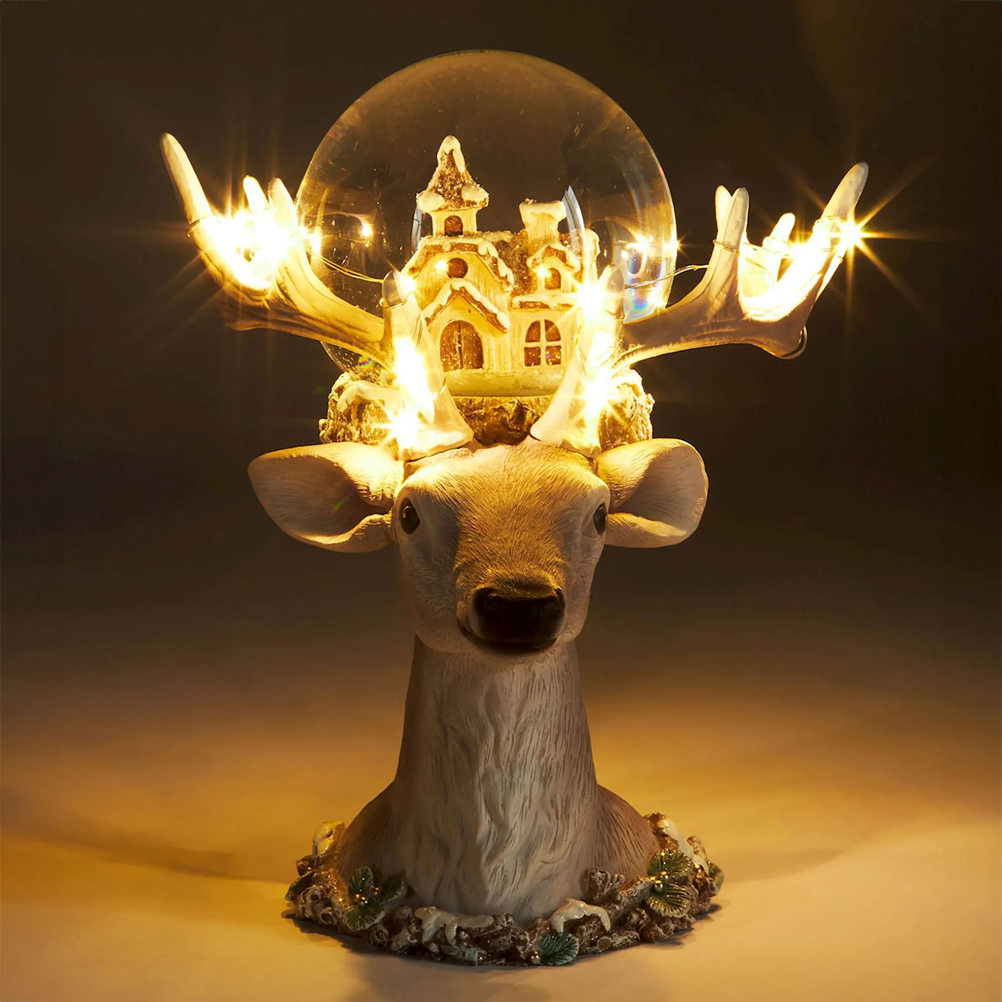 The Deer LED Water Globe exudes a rustic enchantment. Crafted from resin, the light brown deer features a realistic appearance, a woodland garland wreath, LED light-wrapped antlers, and a glass water globe accent. The liquid-filled globe holds a lovely snow-laden house. Snow swirls inside when gently turned upside down. Requires two of your AA batteries and operates from the bottom on/off switch. Overall, measures 7"Wx8"Dx9"H.