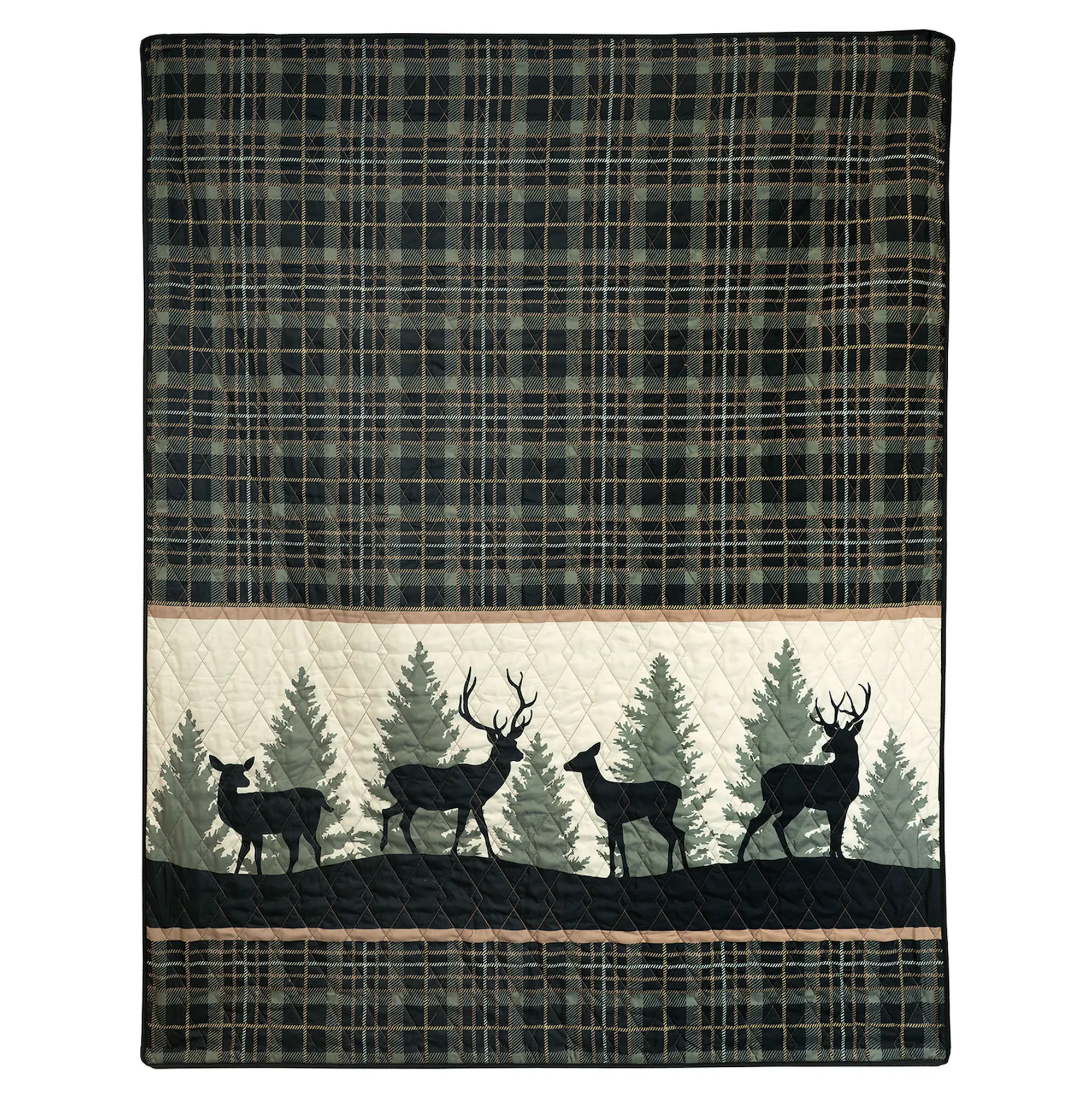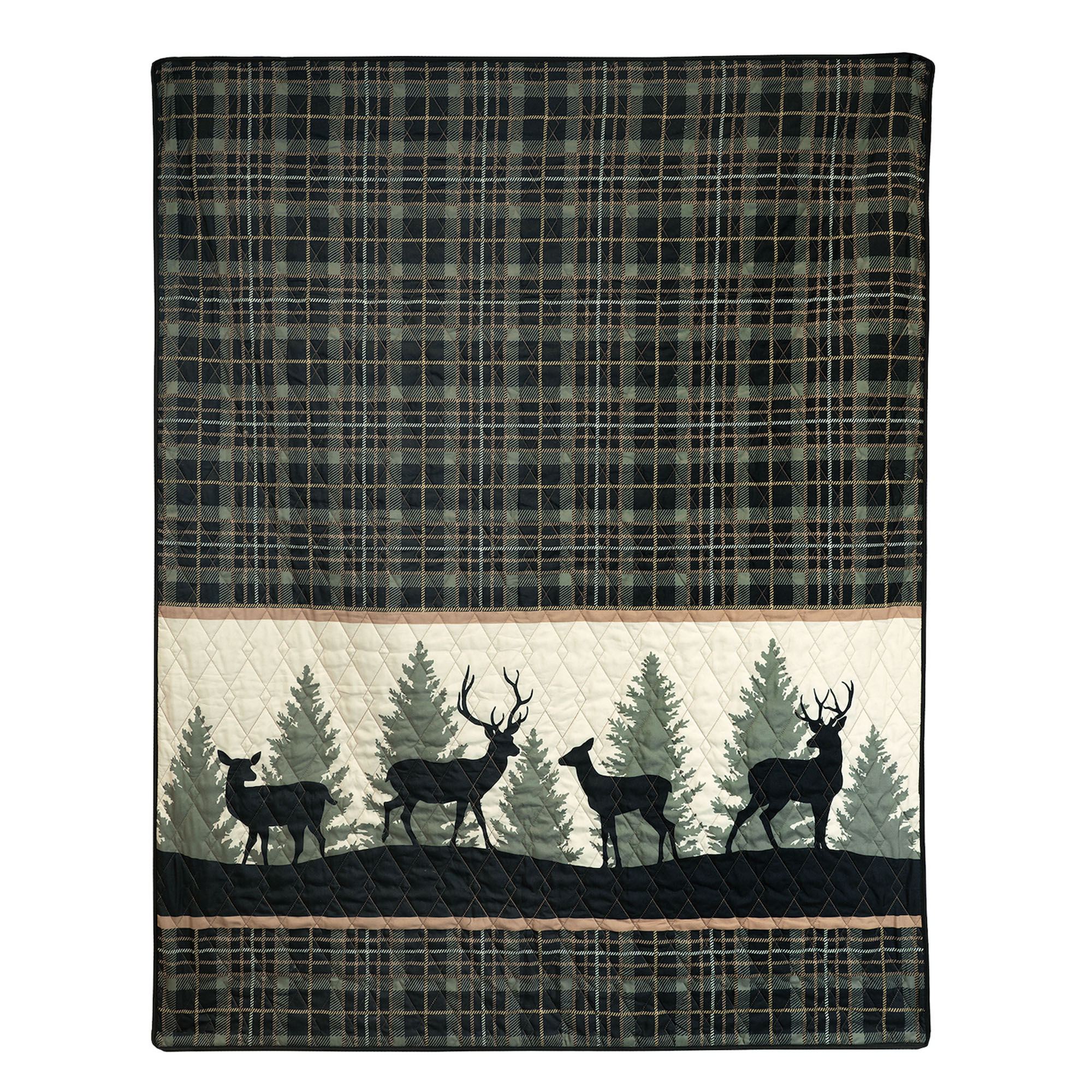 Evoke a rustic nature retreat with the Deer Walk Bedding from Your Lifestyle(R) by Donna Sharp(R). The Mini Quilt Set includes a quilt and sham(s). The pre-washed and preshrunk polyester quilt features printed deer, pine tree, and plaid designs. Colors include shades of black, green, cream, tan, and ivory. Quilt also has diamond quilting and a solid black backing with diamond quilting. Fill is cotton/polyester. Machine washable. Imported.