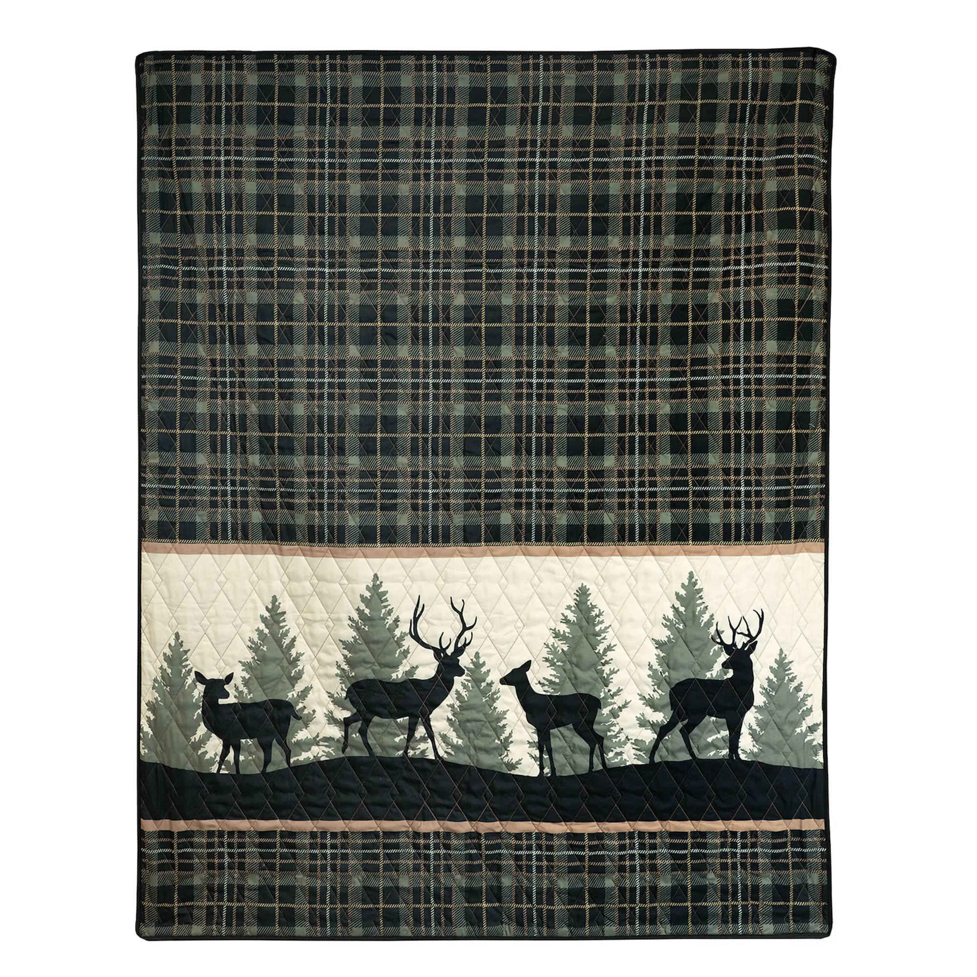 • Quilt features deer, pine trees, and plaid