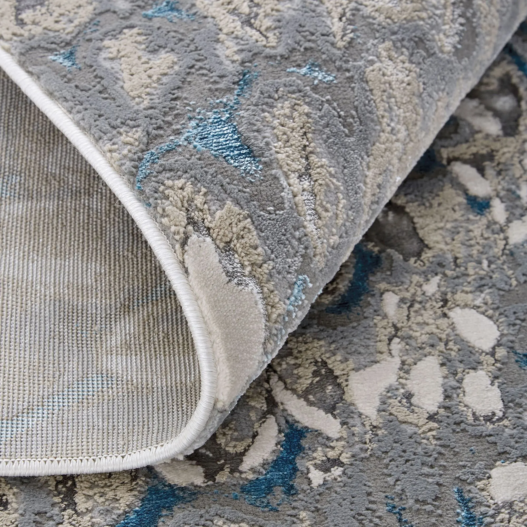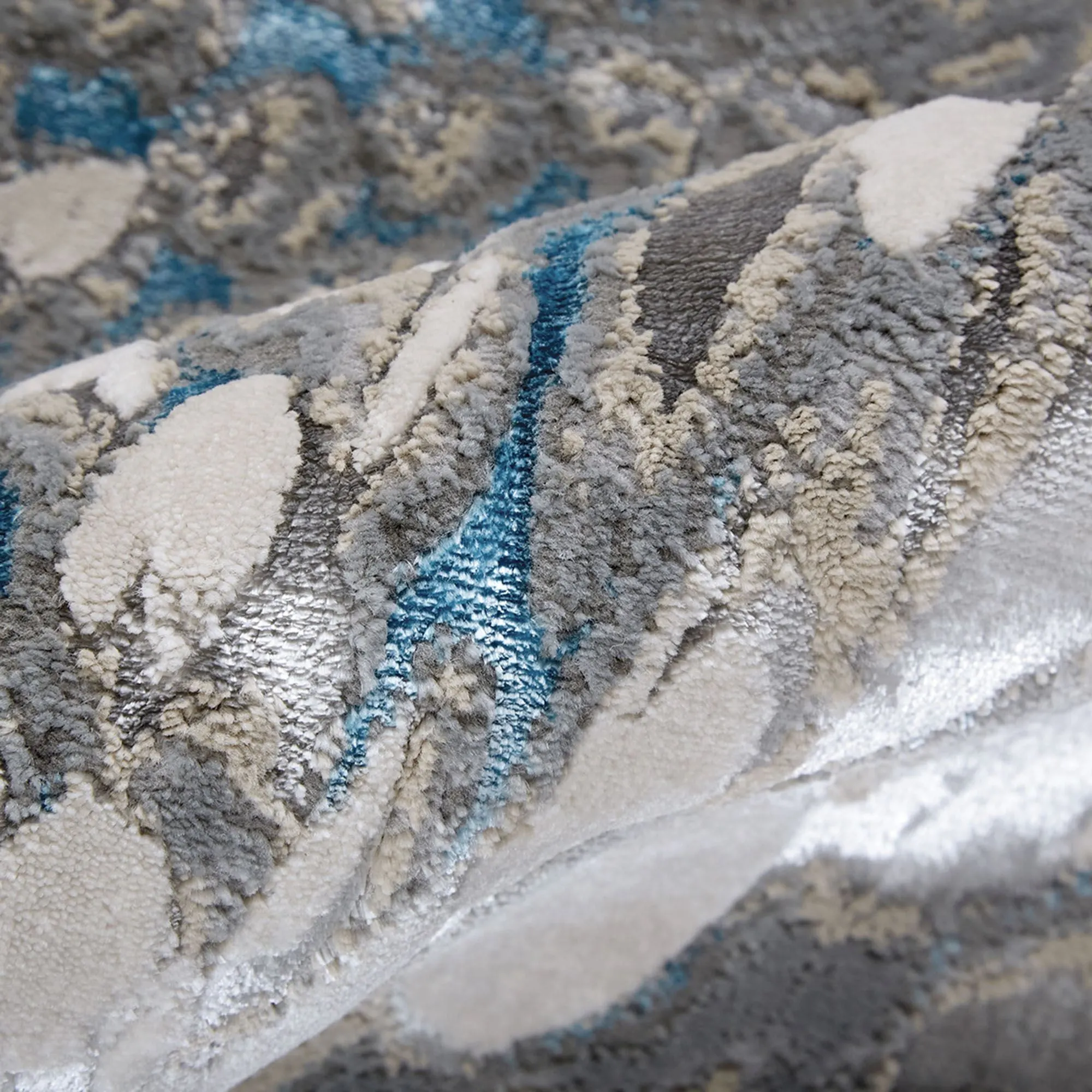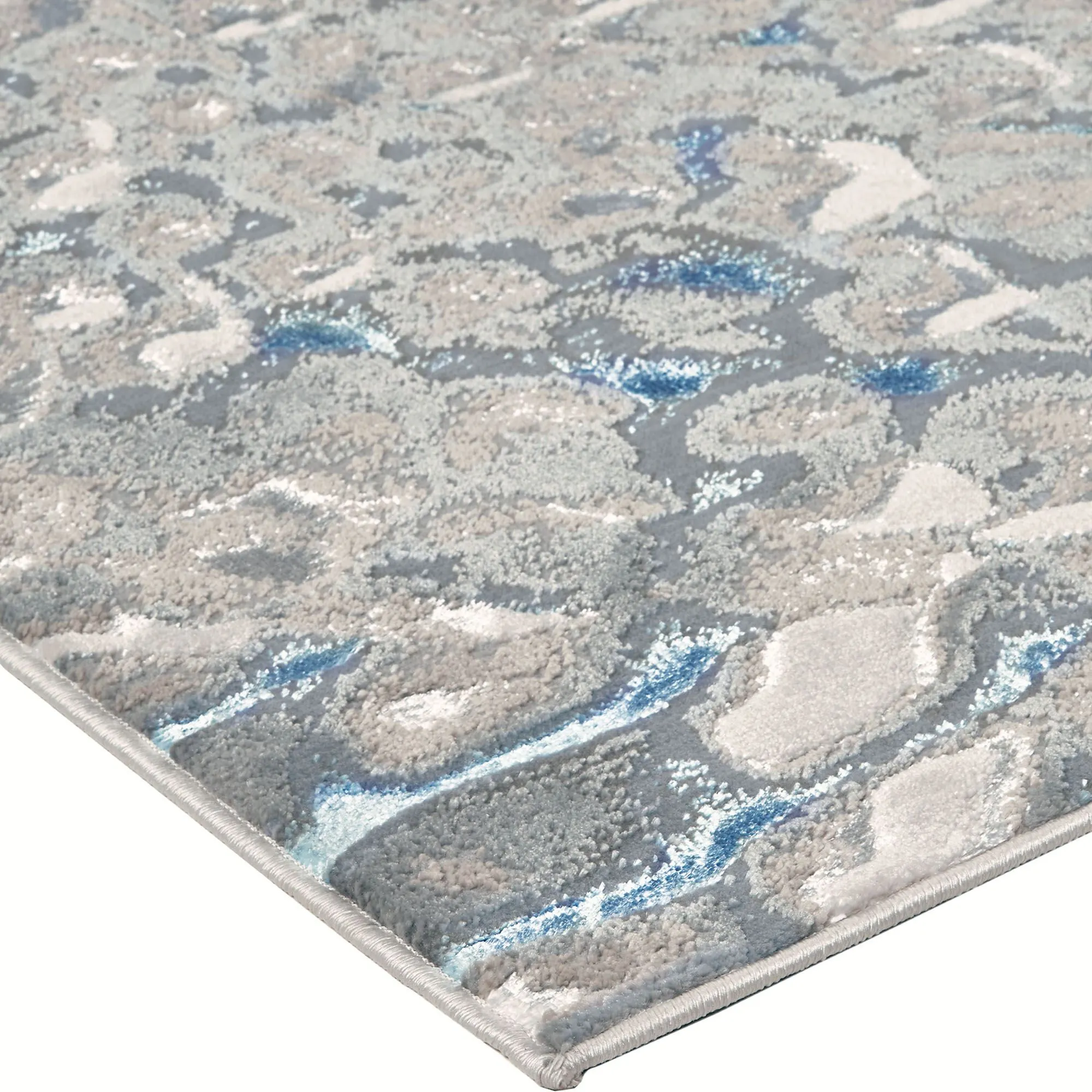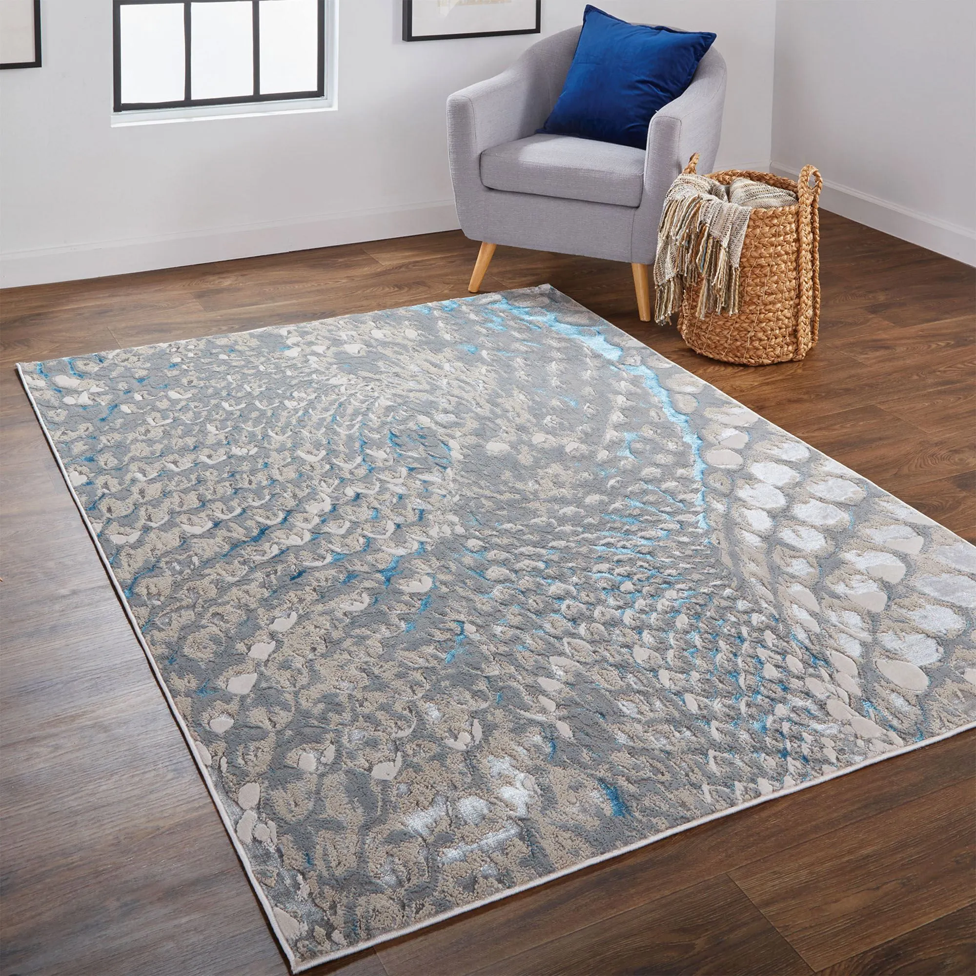 The Delaney Rug has an exotic look with its peacock plumage design. Power-loomed of polypropylene/polyester, this area rug, .394" thick, features a swirling abstract motif with metallic yarns that add texture and depth to the rug. Colors include shades of charcoal, silver, and glacier blue. We recommend professional cleaning by a rug cleaner. Imported.