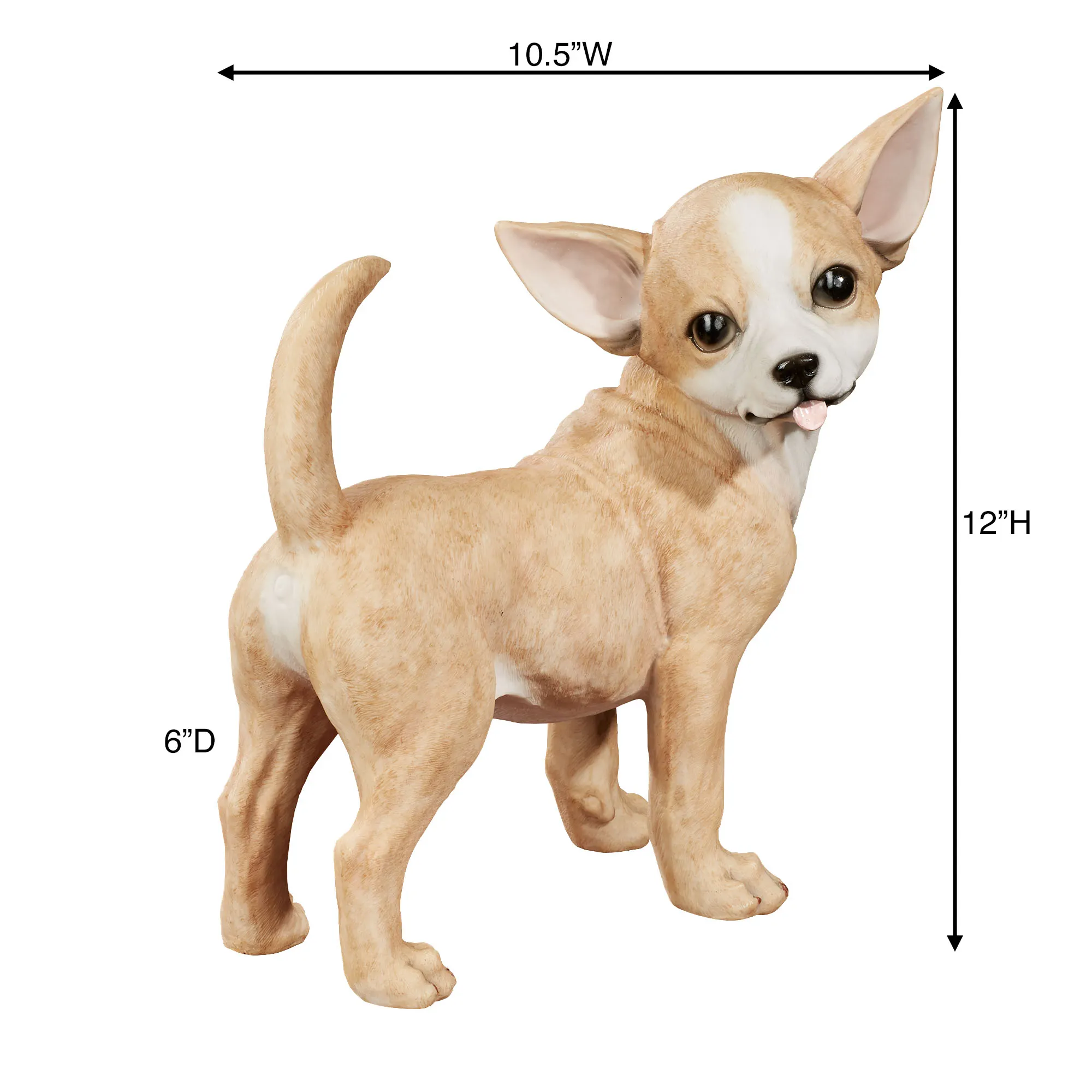 Anxious to see its owner, the Delighted Chihuahua is ready to play. Made of resin, this tawny and white dog sculpture has an adorable face and realistic details. Measures 10.5"Wx6"Dx12"H.