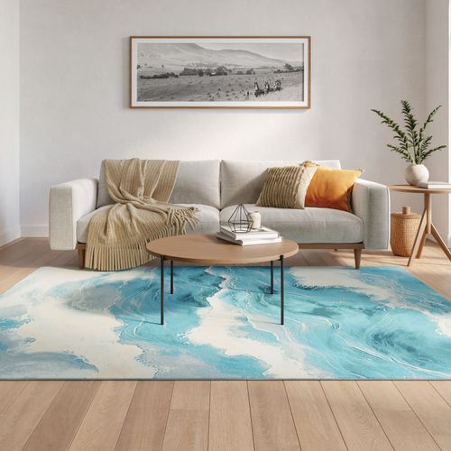 Delmar Aqua Blue Abstract Ocean Wave Design Stain Resistant Indoor Outdoor Rugs