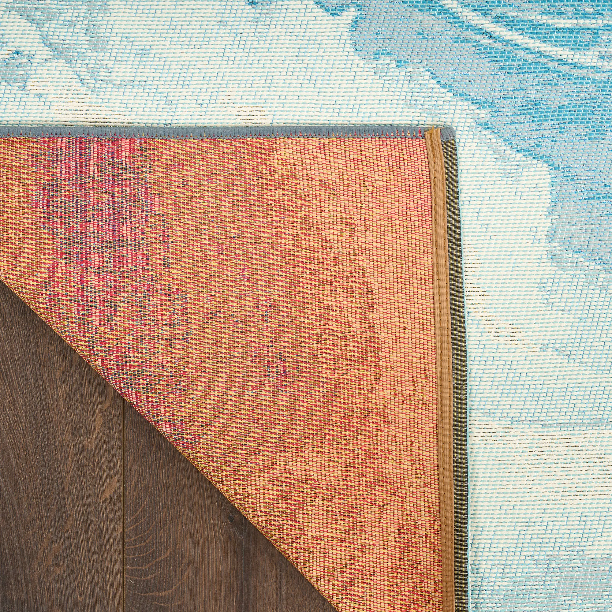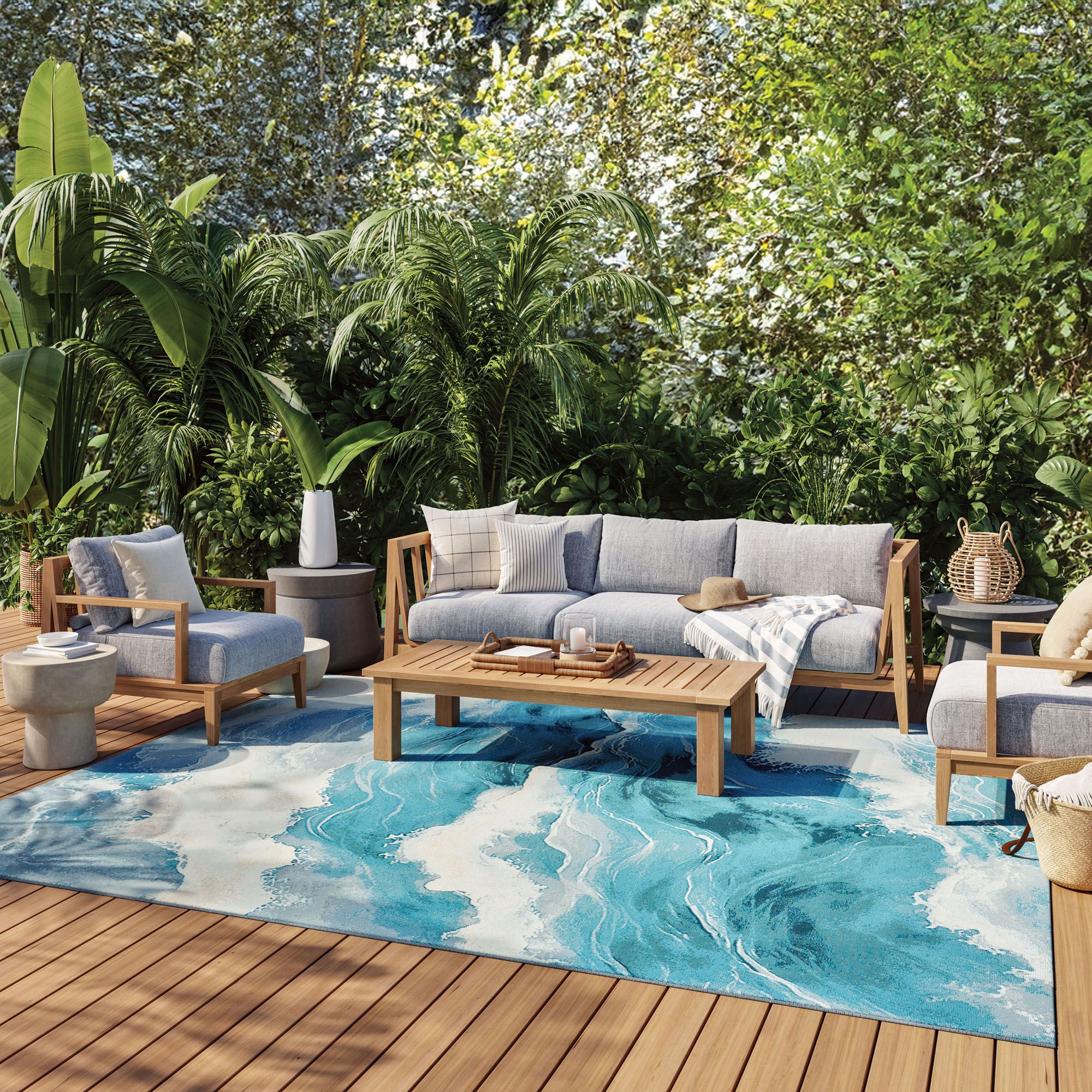 Relax seaside in your indoor or outdoor space with the Delmar Rug. Power-loomed from a polypropylene/polyester blend, the .25" thick jacquard-woven flat-weave rug is filled with crashing aqua blue, gray, and ivory abstract waves. The vivid, cool tones are fade-, stain-, and water-resistant in a fray-resistant and non-pilling durable design. Backing is a polyester/latex blend. Outdoor seasonal use; do not expose this rug to freezing temperatures. Spot clean and rinse with a garden hose; for stubborn stains, we recommend professional cleaning by a rug cleaner. Imported.