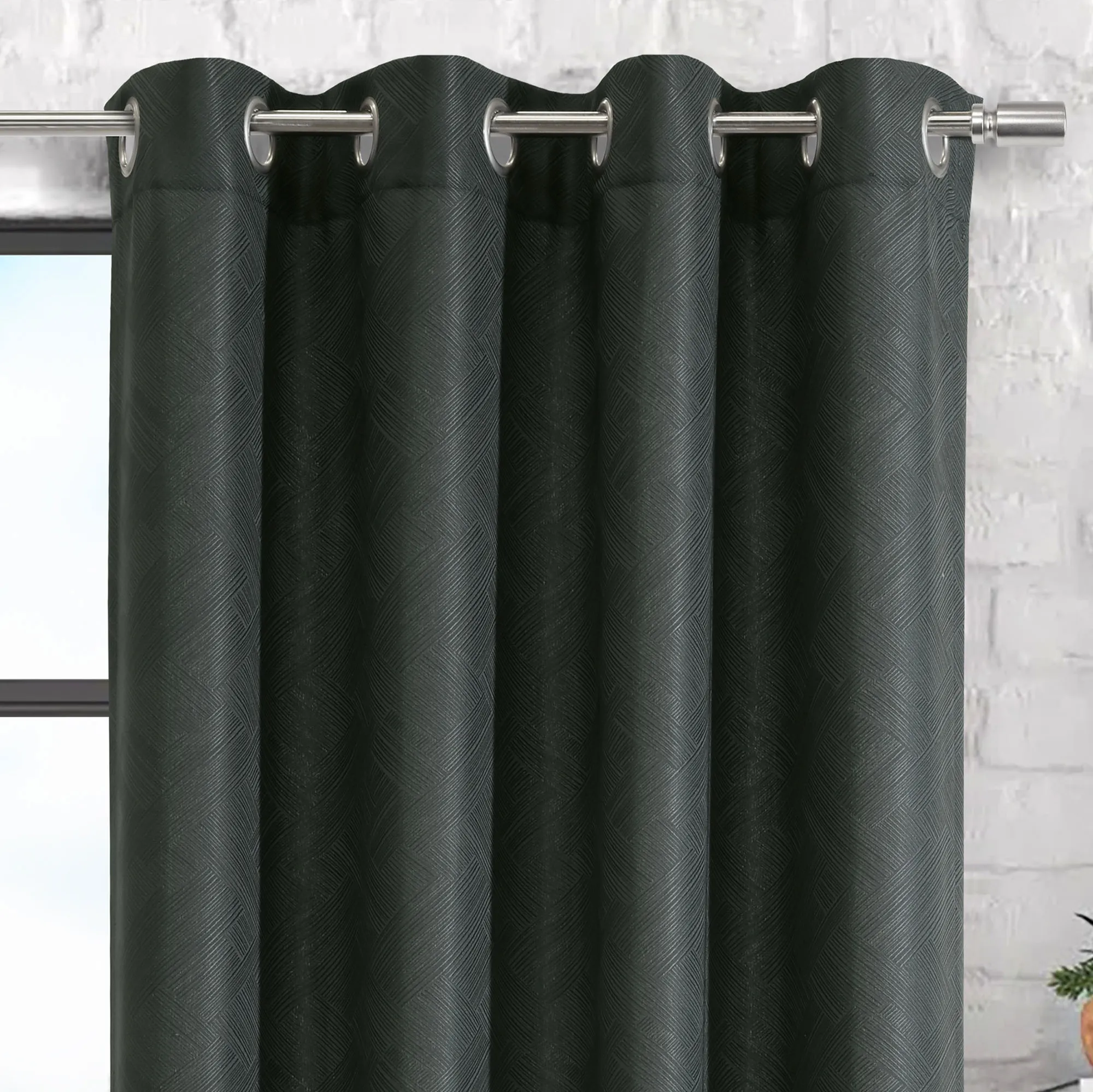 Geometric linear abstract designs pattern the Delphina Grommet Curtain Panel with a modern allure. With a subtle motif, the window panel features a charcoal polyester fabric that hangs via 1.5" dia. brushed silver metal grommets. Sold individually, each window panel measures 52"W. Machine washable. Imported.