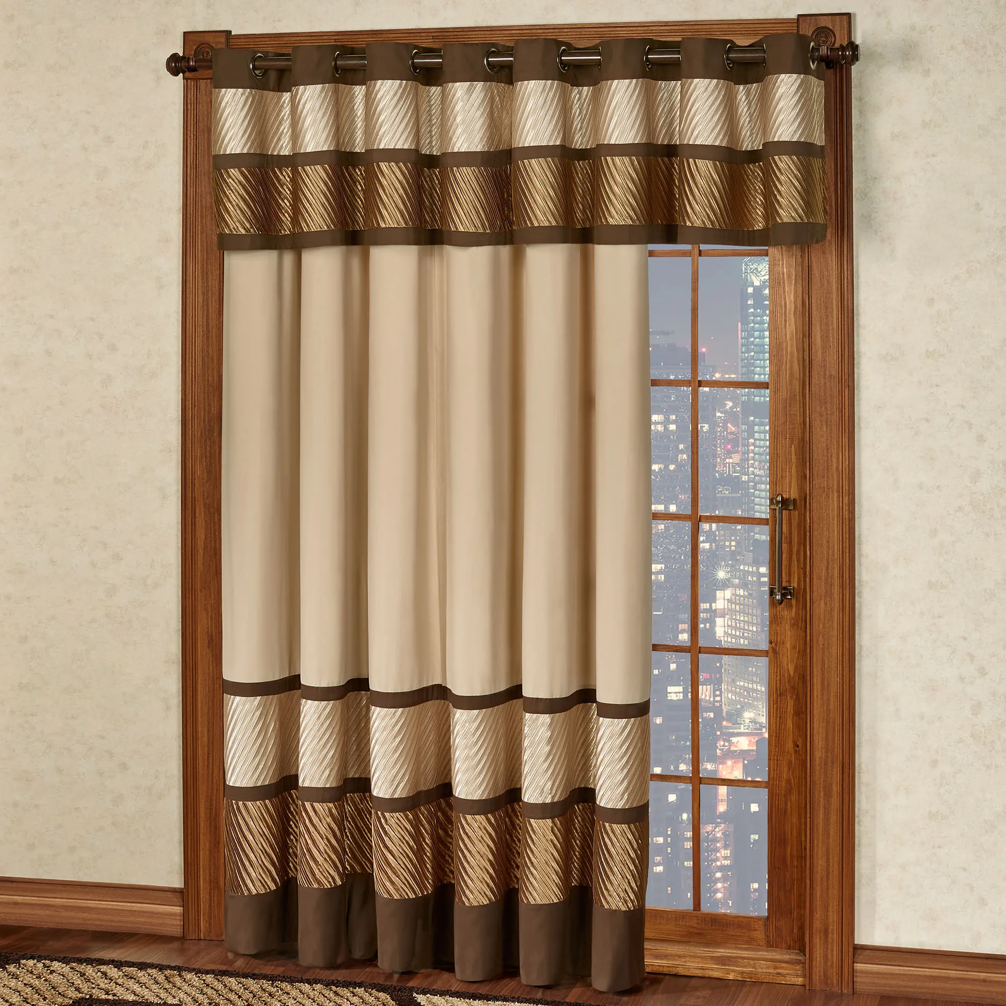 Cosmopolitan allure sweeps through the stylish Delta Grommet Patio Window Treatment. Specify Grommet Patio Panel or Wide Grommet Valance. The Grommet Patio Panel has a light champagne gold brushed microfiber top with a bottom of champagne gold and golden bronze diagonally-pleated poly satin lined with bands of dark bronze. Wide Grommet Valance is pieced with champagne gold and golden bronze diagonally-pleated poly satin and brushed dark bronze microfiber borders. Lined, polyester window treatments have 1.5" dia. light champagne gold metal grommets. Machine washable. Imported.