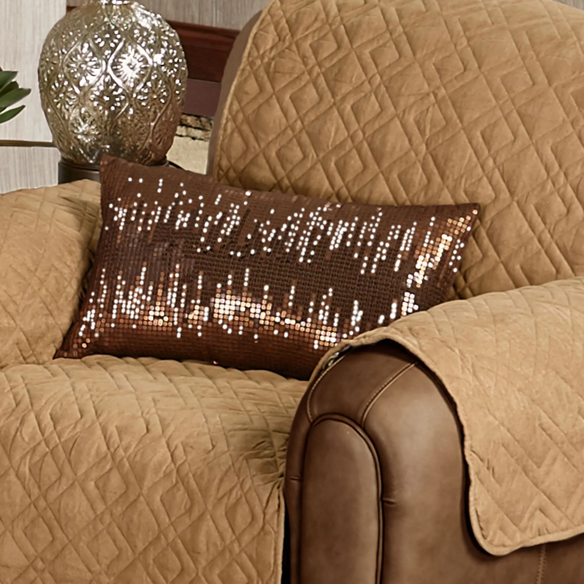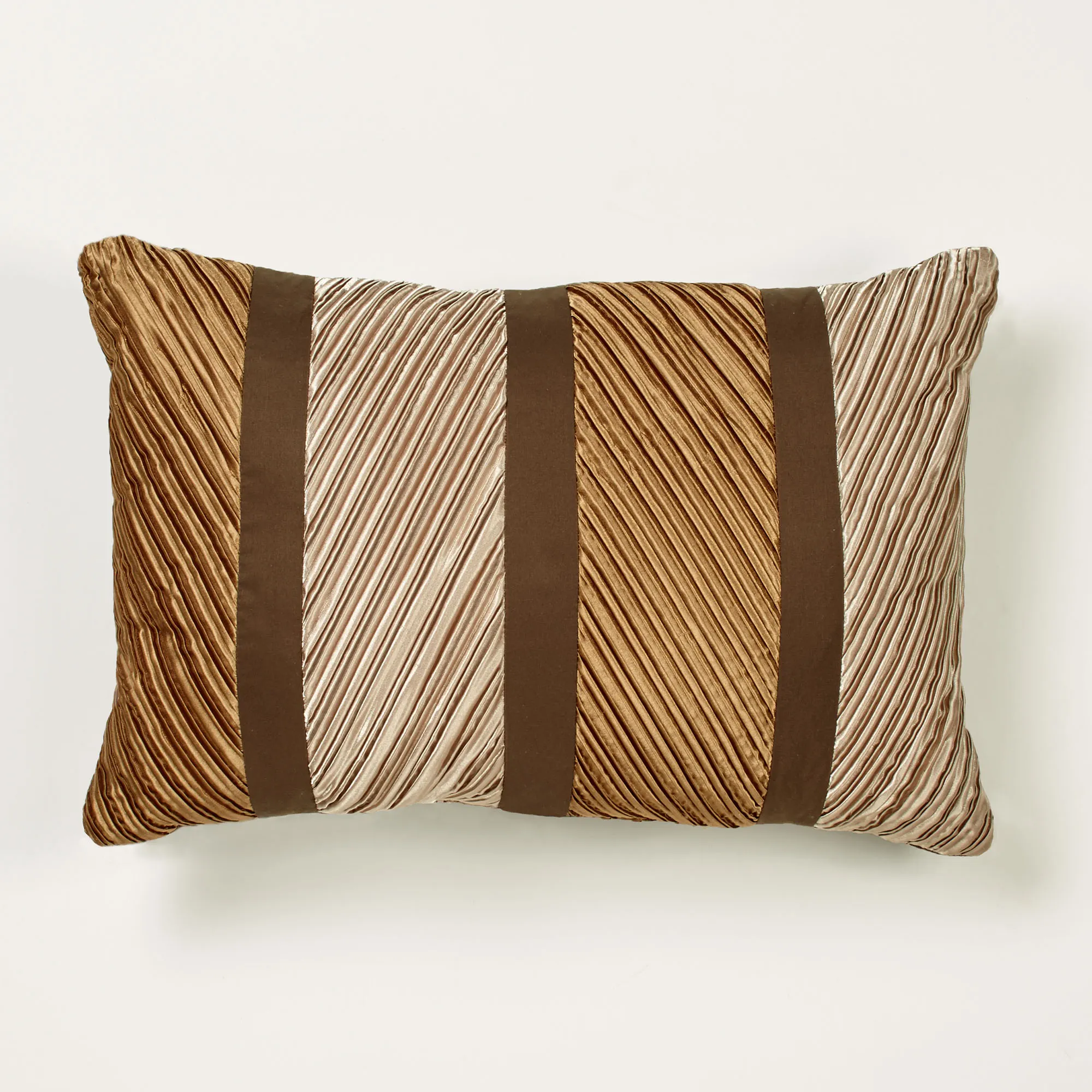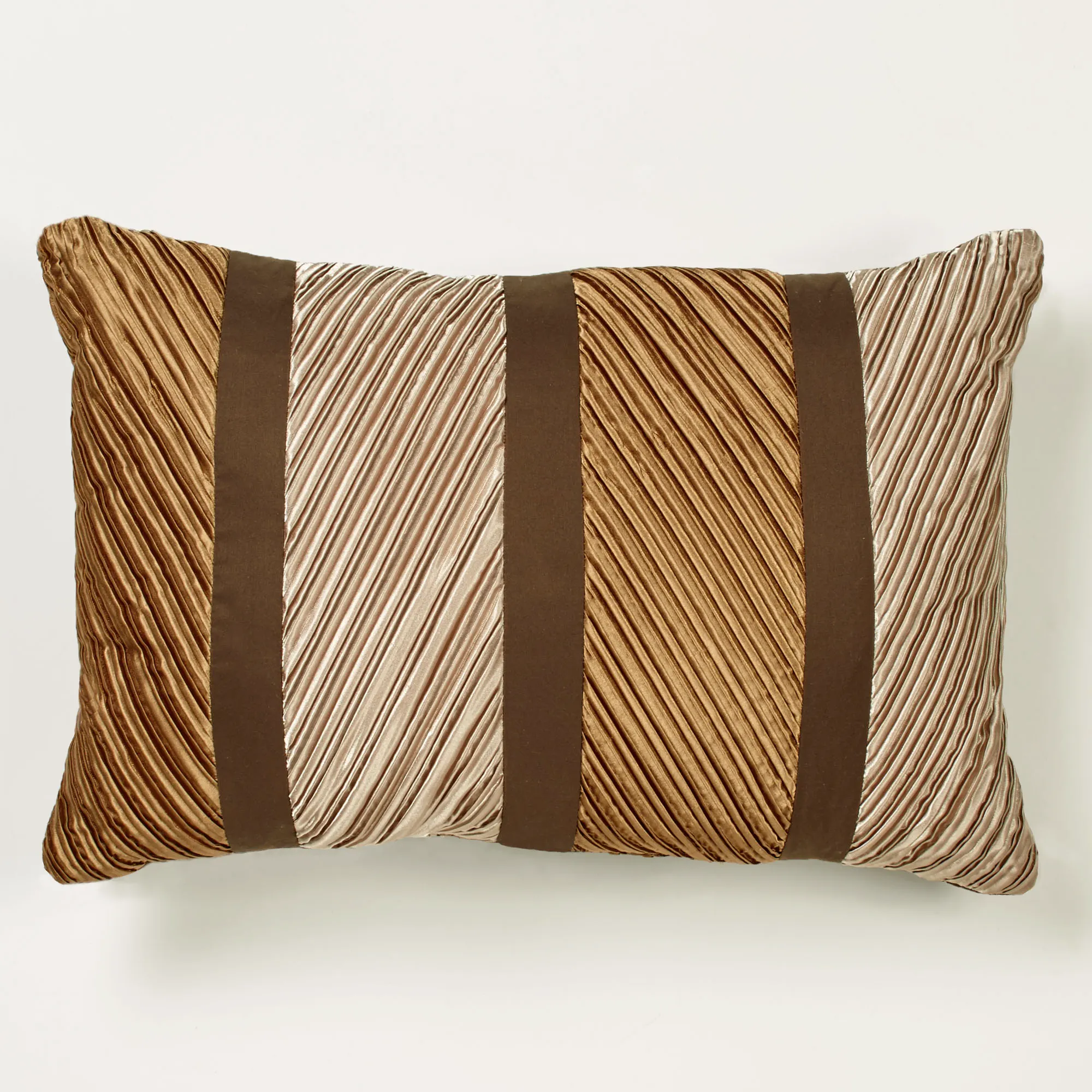 The contemporary, polyester Delta Decorative Pillows exude cosmopolitan allure. Pleated Rectangle Pillow, 14"x21", contains alternating vertical bands of champagne gold and golden bronze diagonally-pleated poly satin bordered with brushed dark bronze microfiber. Tailored Rectangle, 12"x20", is solid dark bronze accented with coordinating sequins. The 20" Square Pillow has a smooth light champagne gold microfiber center bordered by brushed dark bronze microfiber and golden bronze diagonal poly satin pleats with mitred corners; zipper closure. Pillow fill is polyester. Spot clean pillows only with cool water; air dry. Imported.