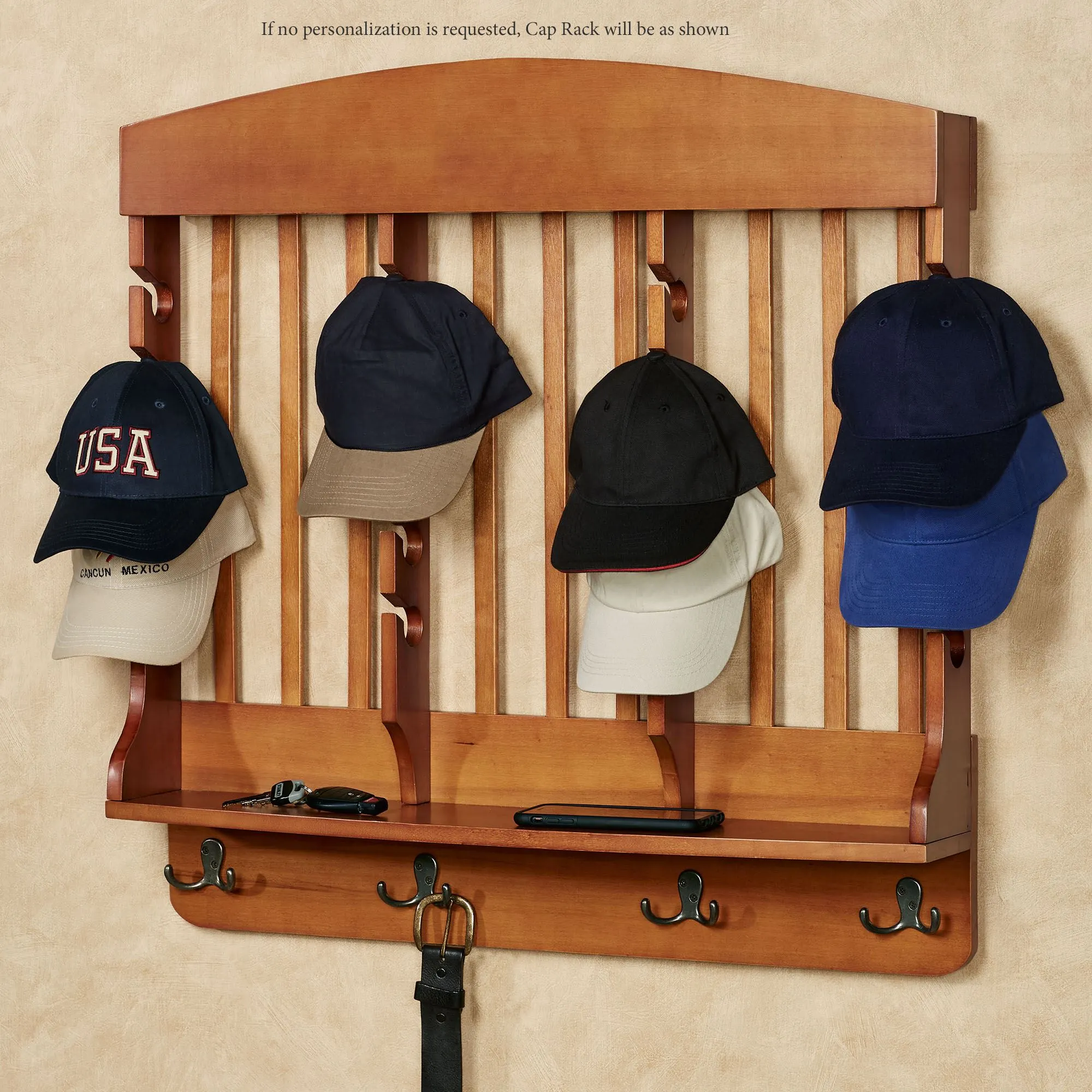 Proudly display caps and keep accessories neatly organized with the Horizontal Deluxe Cap Wall Rack. Finished in windsor oak, this solid wood rack has antique bronze metal hooks to hang belts, bags, or jackets. Simply toss loose change or keys on the shelf. The horizontal rack will hold up to 20 caps. The top may be personalized with an uppercase metal initial. Horizontal 20-cap rack measures 30"Wx7"Dx30"H.