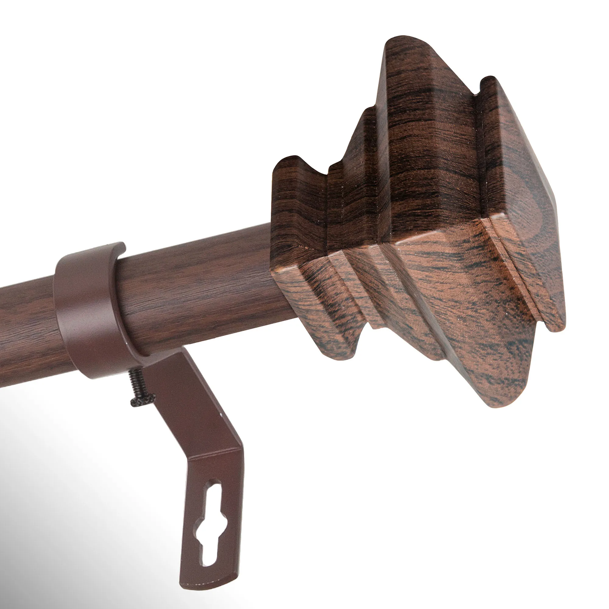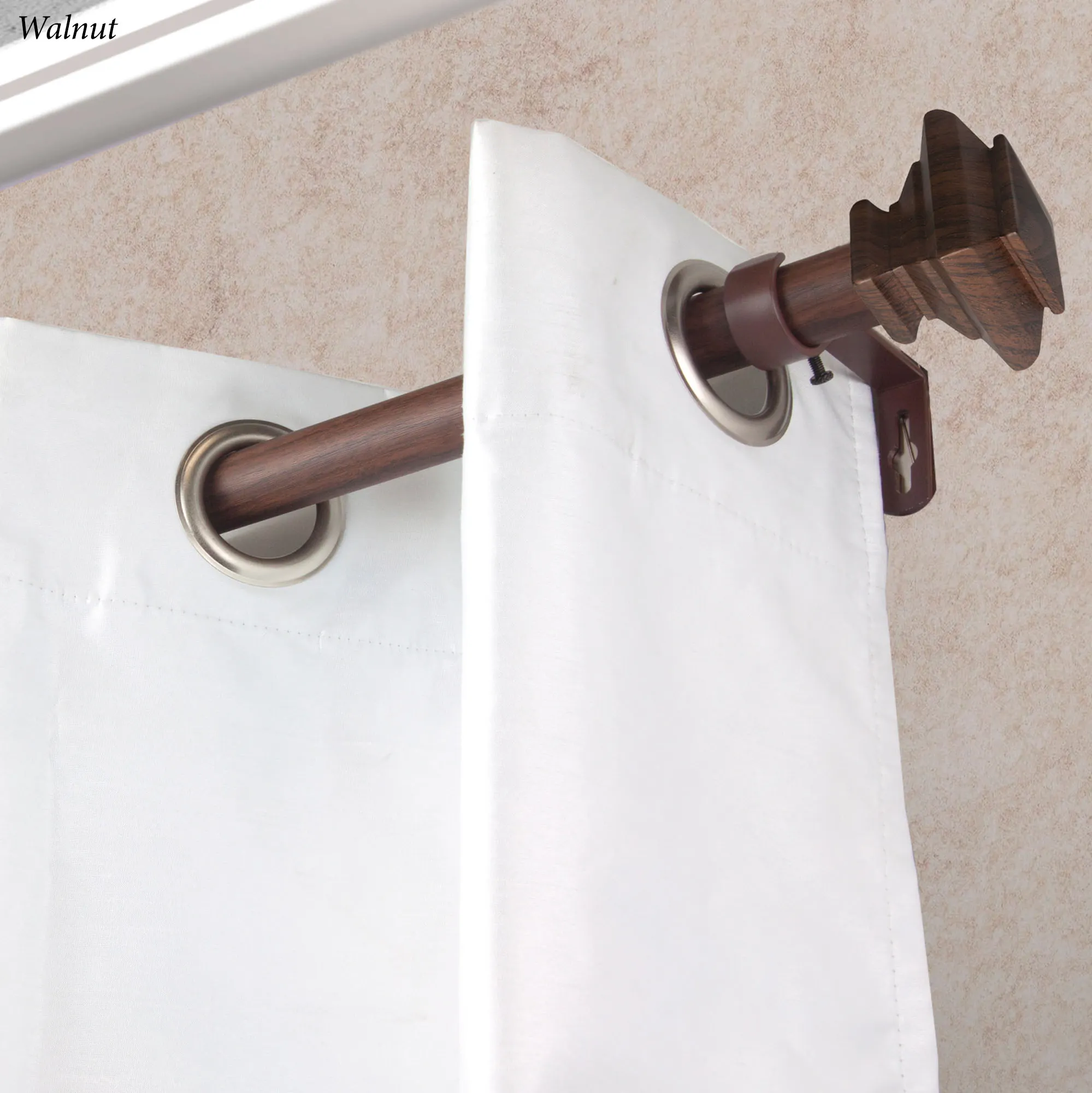 The Delway Curtain Rod and Finial Set updates any window with a modern look. The telescopic steel rod has two square finials with a faux wood appearance. Set includes the 1" adjustable rod, brackets that project 3.625" from the wall, and two resin finials, 2.25"Wx1.25"Dx2.375"H each. The 28"-48" size has two brackets; the 48"-84" and 66"-120" sizes have three brackets; the 120"-170" size has four brackets; and the 160"-240" size has five brackets.