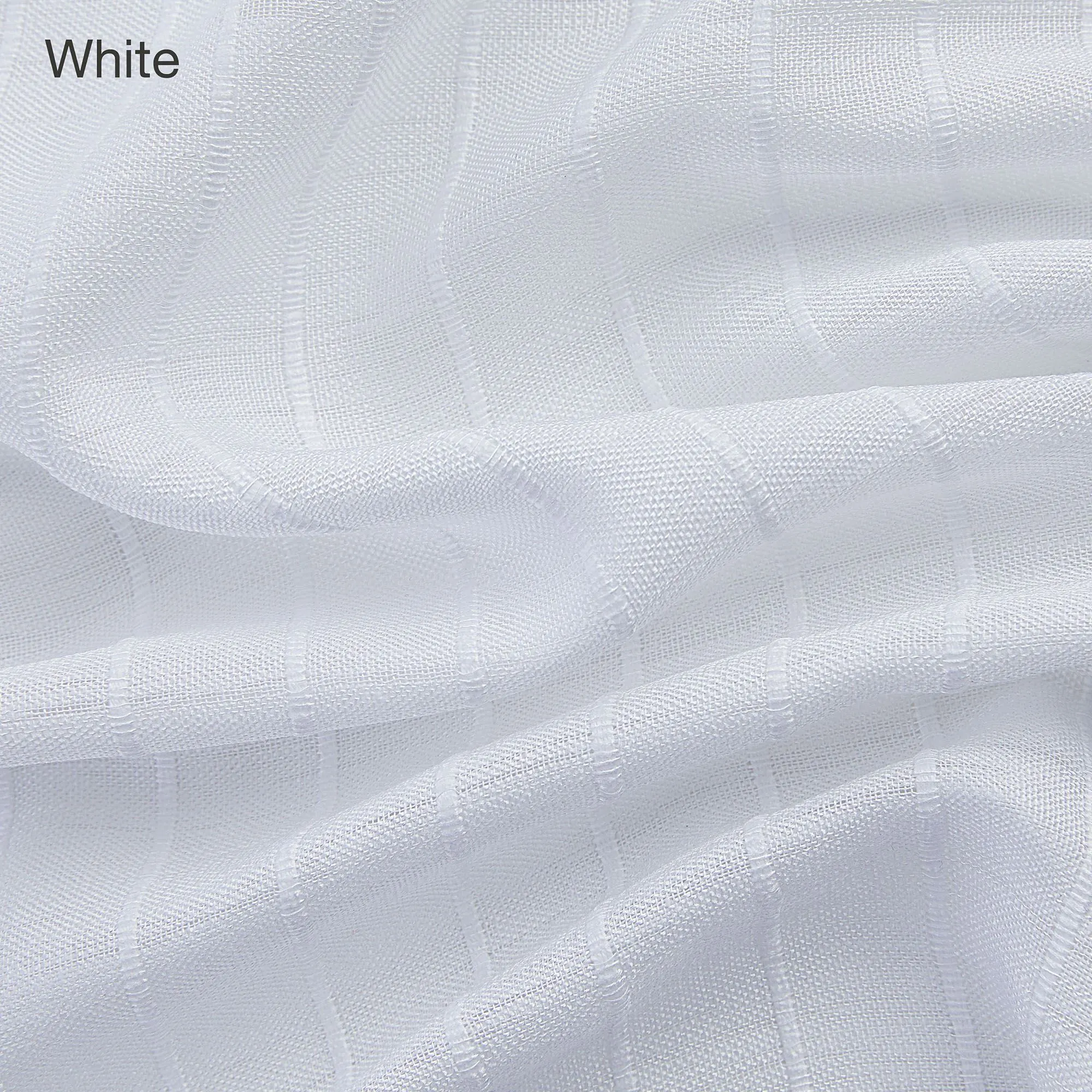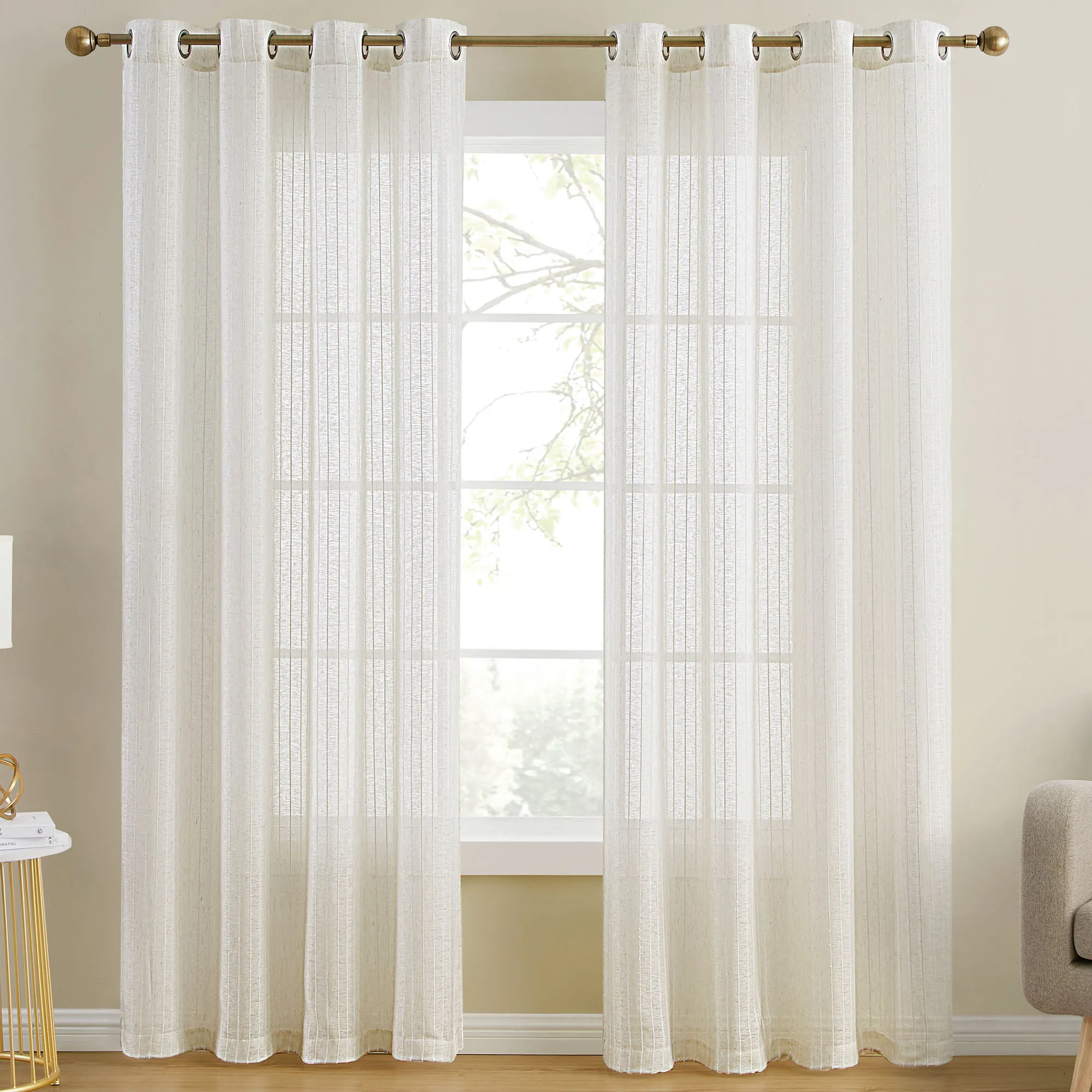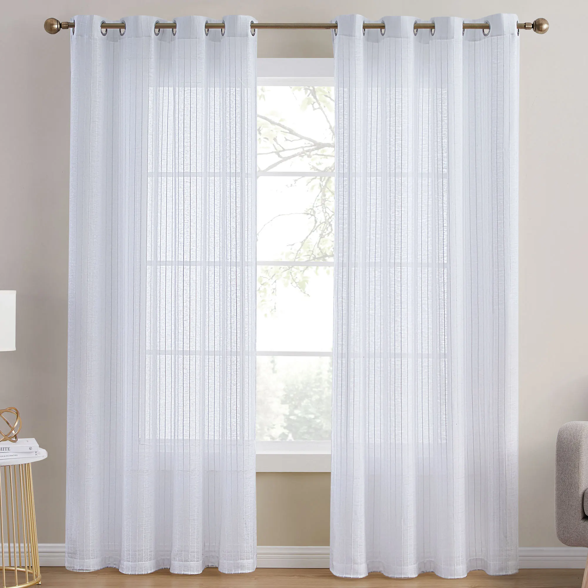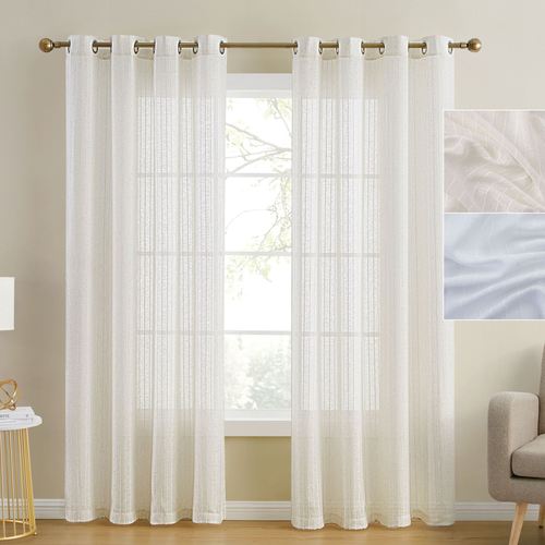 Subtly accent your space with the Delythe Grommet Curtain Pair. Patterned with vertical dobby woven stripes, this semi-sheer window treatment hangs via 1.5" dia. silver metal grommets. Eggshell is polyester/linen. White is polyester. Wide curtain pair is 104"W. Machine washable. Imported. The curtain pair width is the total width of two panels together.