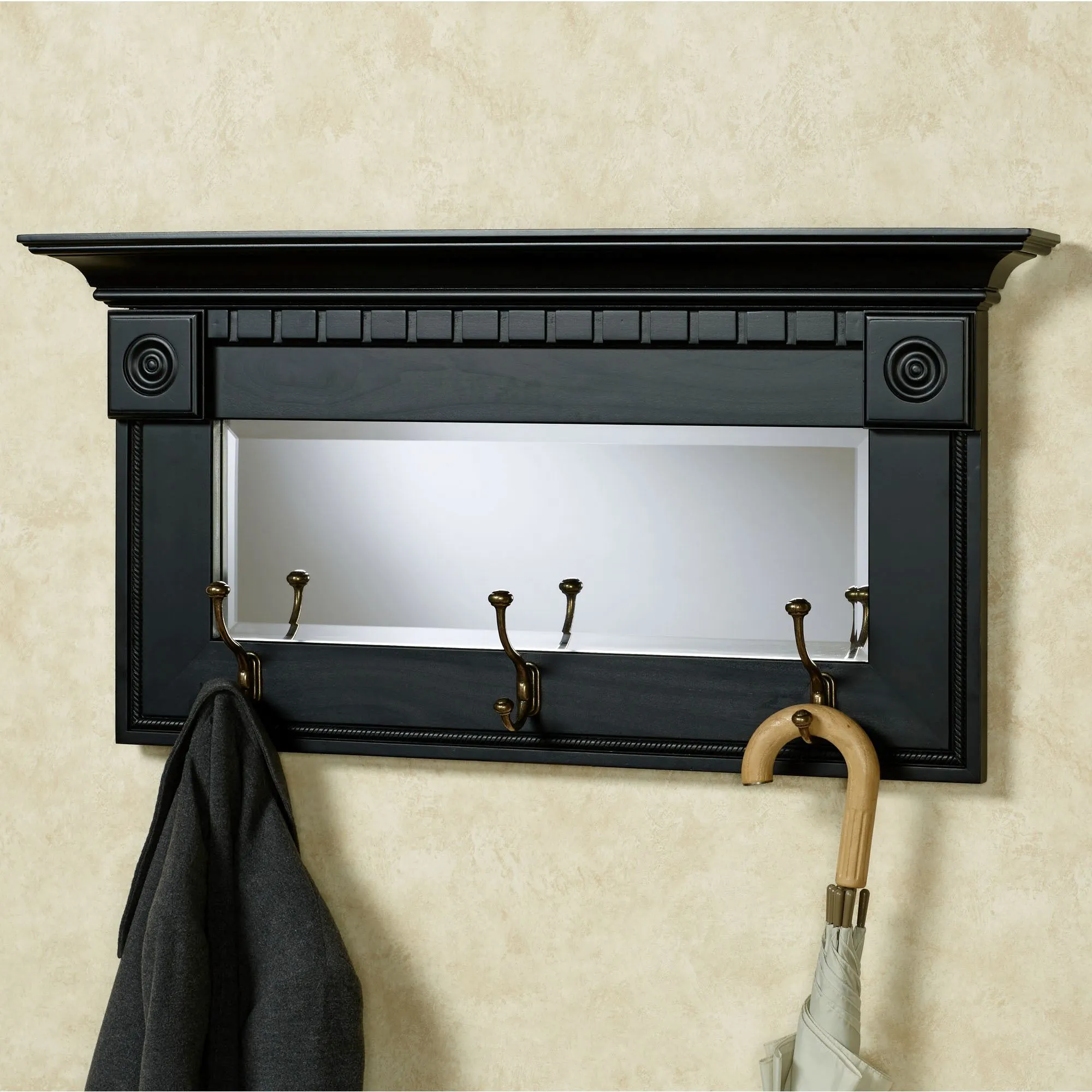 The handcrafted Dentil Pediment Black Wall Mirror has the mark of quality craftsmanship. Sturdy, hand-stained, hardwood frame has beautiful woodgrain detail and a black finish; the mirror has beveled edges. Three antique brass hooks are a bonus. Wall mirror is ideal for a foyer or any spot that could use some depth and accent. 36"Wx4"Dx18"H, 15 lbs.