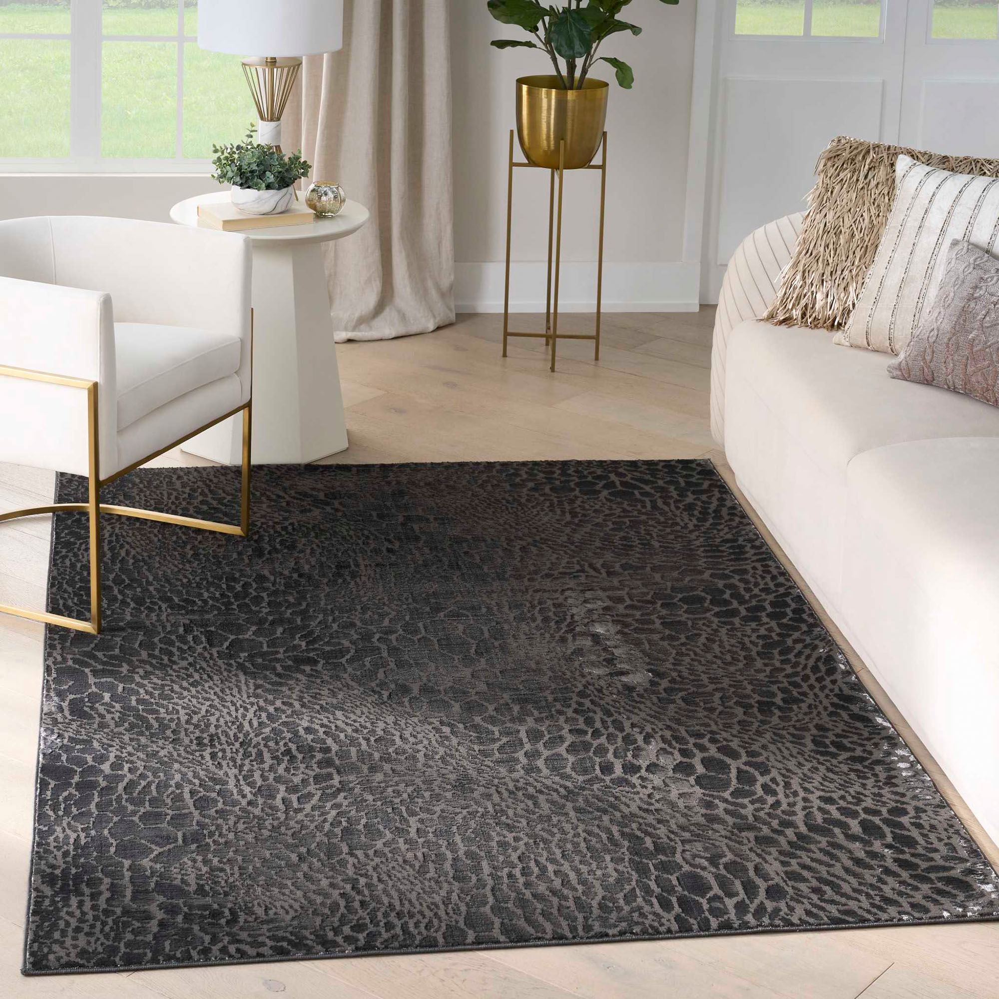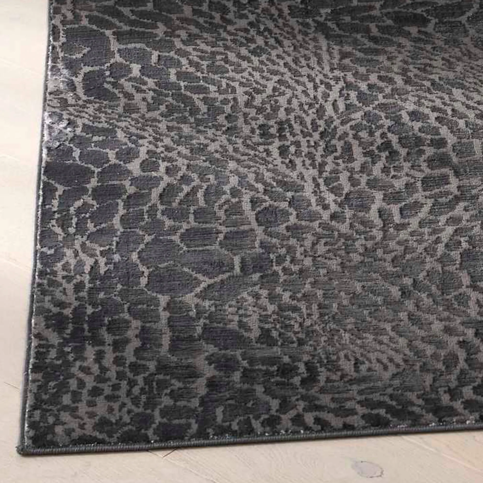 The exotic animal print design on the Denzel Charcoal Rug adds intrigue to any living space. This power-loomed polyester area rug, .5" thick, features a hi-lo abstract motif and a silver sheen with a slight shimmer that captures and reflects light. The charcoal coloration has black spots on a dark gray background. Backing is latex. We recommend professional cleaning by a rug cleaner. Imported.