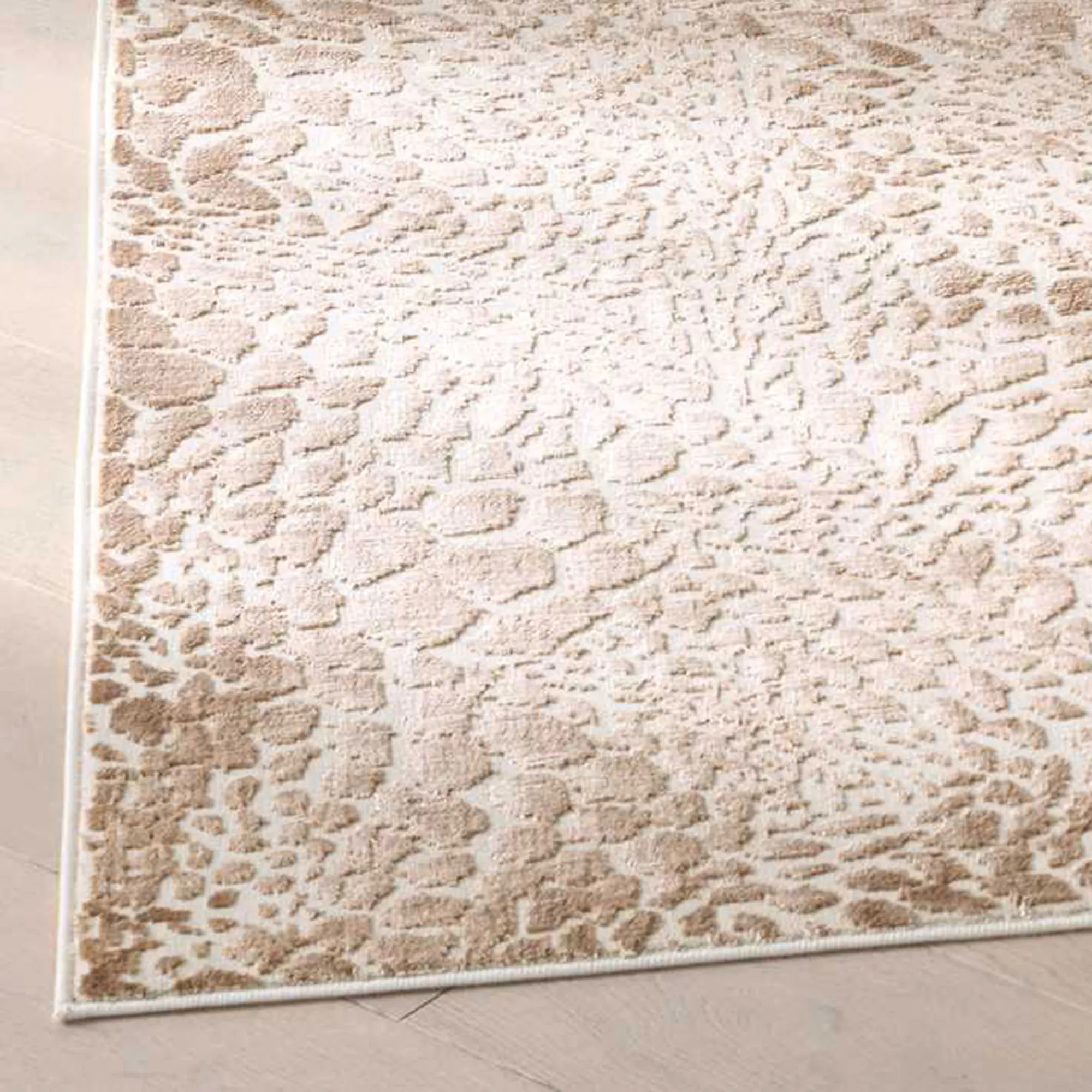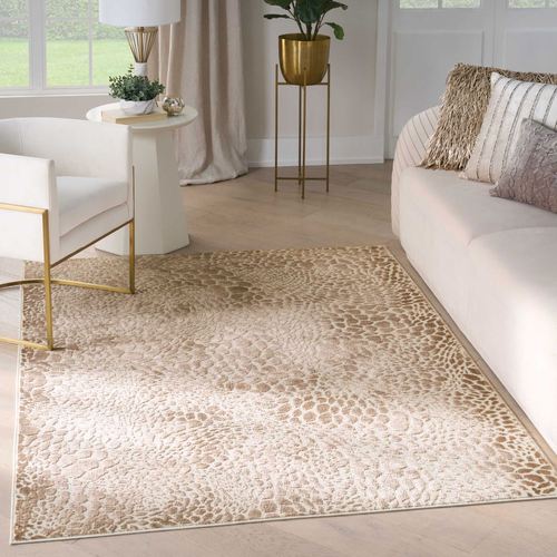 The exotic animal print design on the Denzel Taupe Rug adds intrigue to any living space. This power-loomed polyester area rug, .5" thick, features a hi-lo abstract motif and a silver sheen with a slight shimmer that captures and reflects light. The taupe coloration has taupe spots on an ivory background. Backing is latex. We recommend professional cleaning by a rug cleaner. Imported.