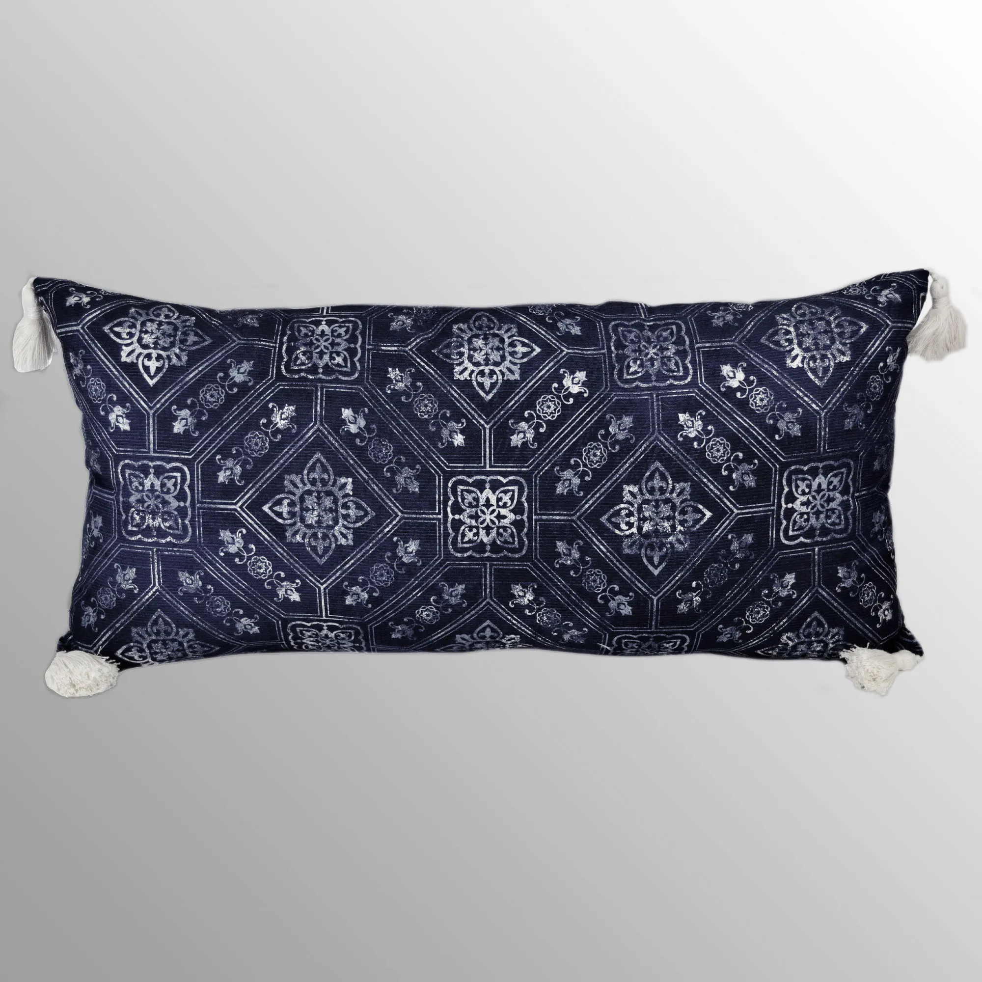 Printed polyester Pillows have zipper closures and polyester inserts. Triangle-Design Square is eggshell with triangle-motif stripes and piped edges. Striped Square has color-coordinating stripes and piped edges. Reversible Rectangle is textured dark blue with ivory medallion designs, tailored edges, and tassel corners. Spot clean.