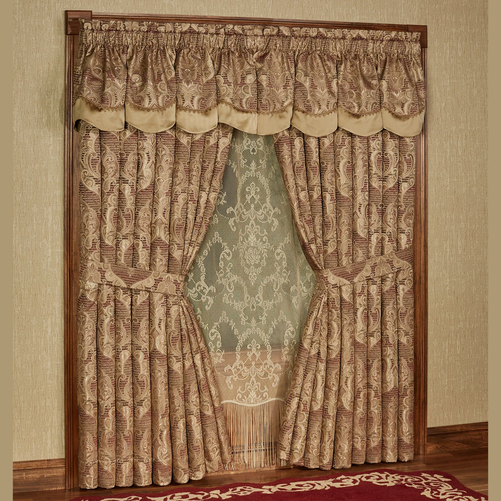 The Devonshire Damask Window Treatment provides a grand respite from the outside world. Jacquard-woven polyester window treatment features rich shades of ruby and antique gold throughout exquisite chenille scrolling damask. Window treatment has 3" rod pockets. Specify Scalloped Valance or Wide Curtain Pair. Scalloped Valance features a gimp trim accent and antique gold edge. The lined Wide Curtain Pair has tailored edges and includes tiebacks. Dry clean. Imported. The curtain pair width is the total width of two panels together.