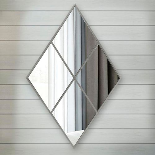 The Diamond Wall Mirror creates a bold focal point in your space. Finished in antique silver, the metal framework divides four diamond glass mirrors to create a large diamond mirrored shape. Each diamond mirror panel measures 10.5"Wx16.5"H. With a vertical design, the wall mirror measures 24"Wx1"Dx36"H overall and weighs 14 lbs.