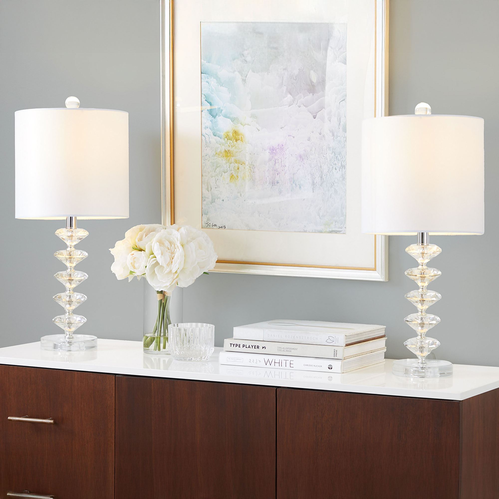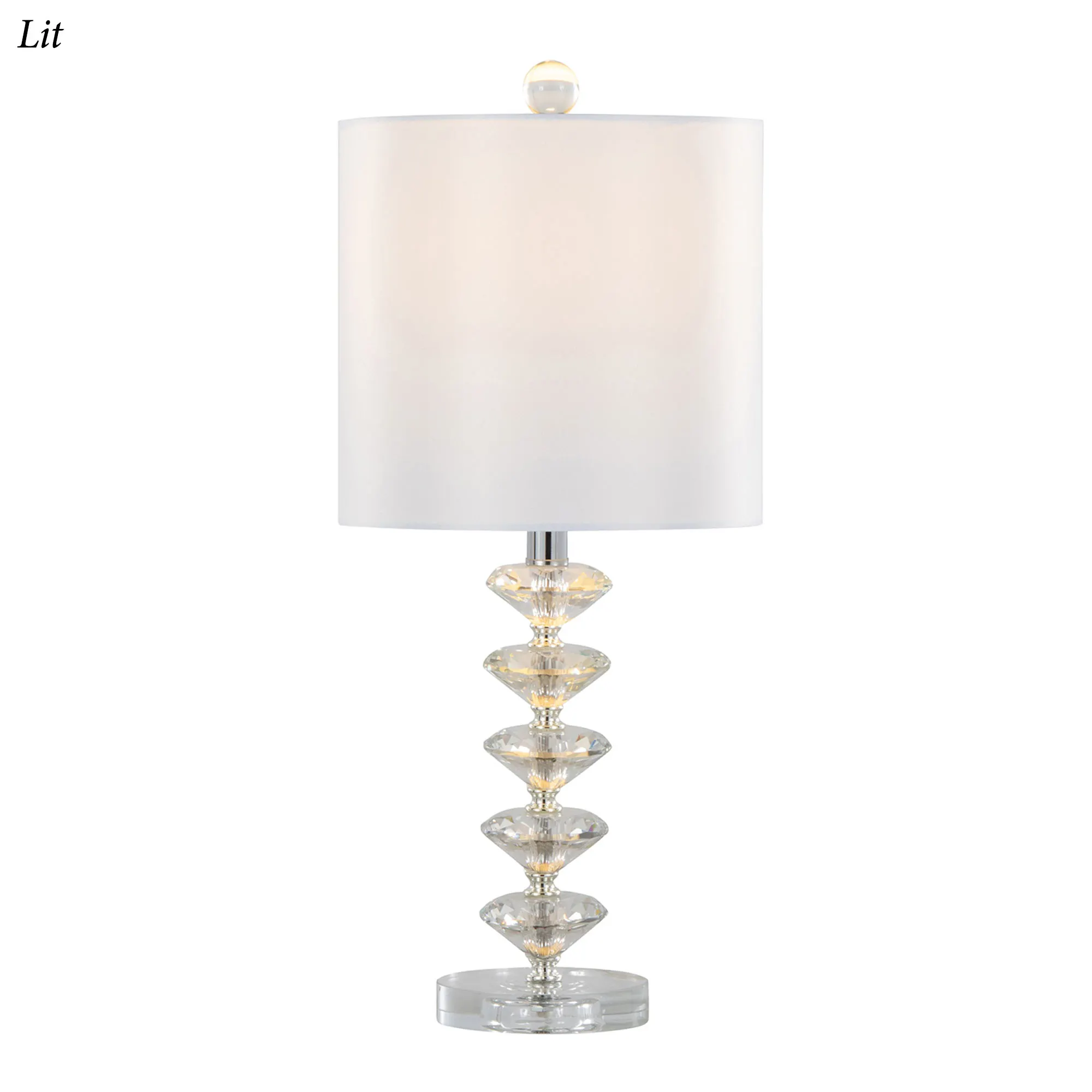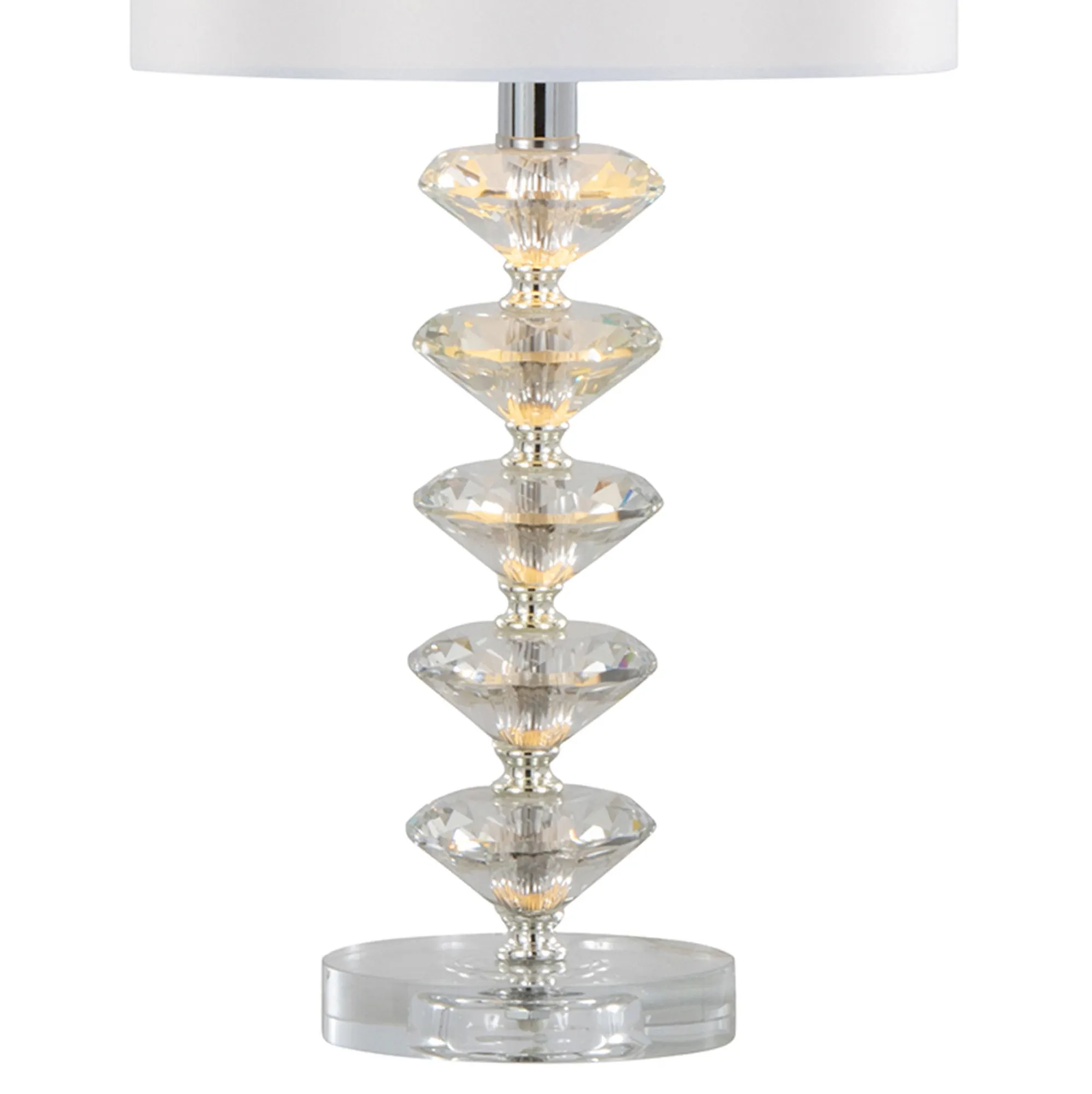 The Diana Crystal Table Lamp Pair sparkles with glitz and glam. Accented with chrome metal, each clear crystal font features a disc base topped with stacked, faceted diamond-shaped designs that reflect a high-class allure. The off-white silk lamp shades add a chic finishing touch beneath the 1.75" dia. orb finials. UL listed. Each requires one 60W max. bulb. Overall, each dazzling table lamp measures 10"dia.x23.5"H; the pair weighs approx. 12 lbs.