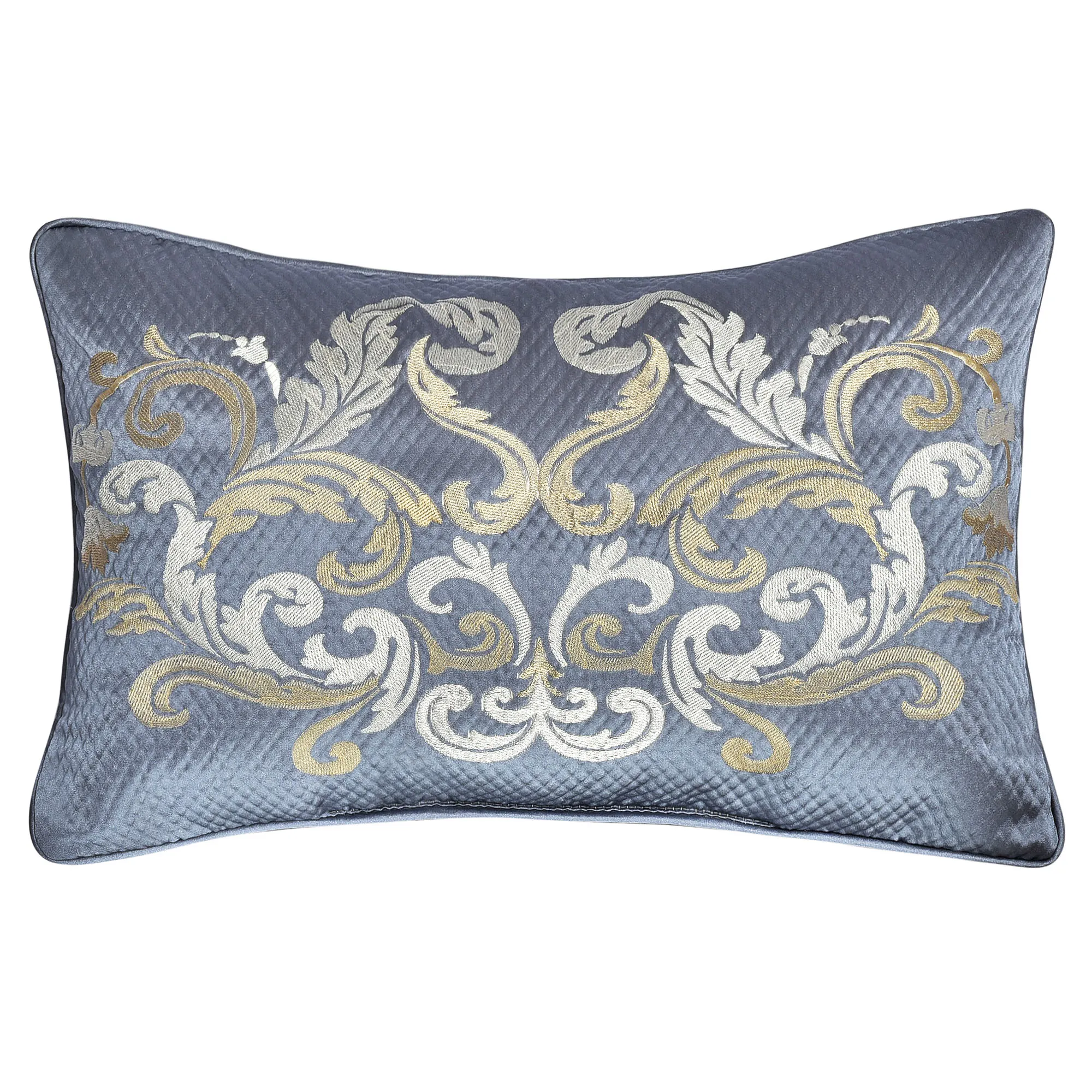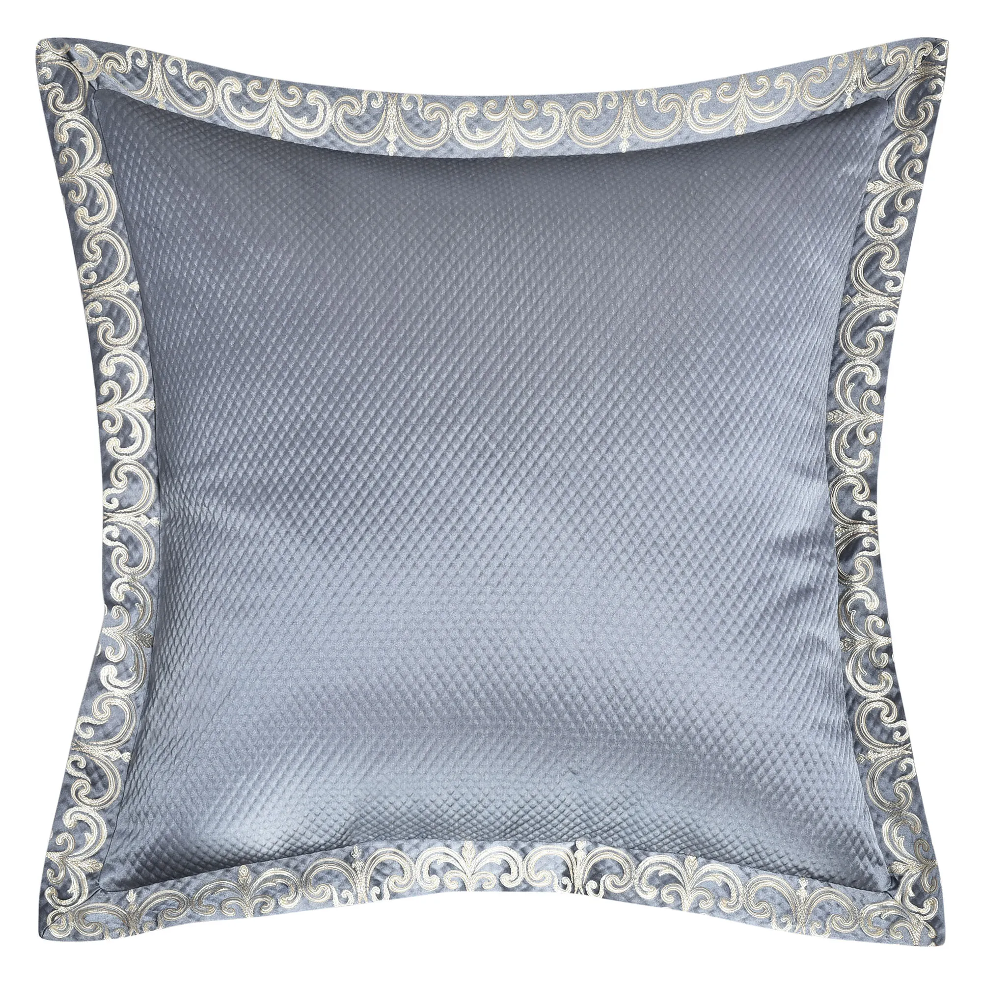 Reversible European Sham is textured powder blue with flanged edges patterned with coordinating scrollwork trim; zipper closure.