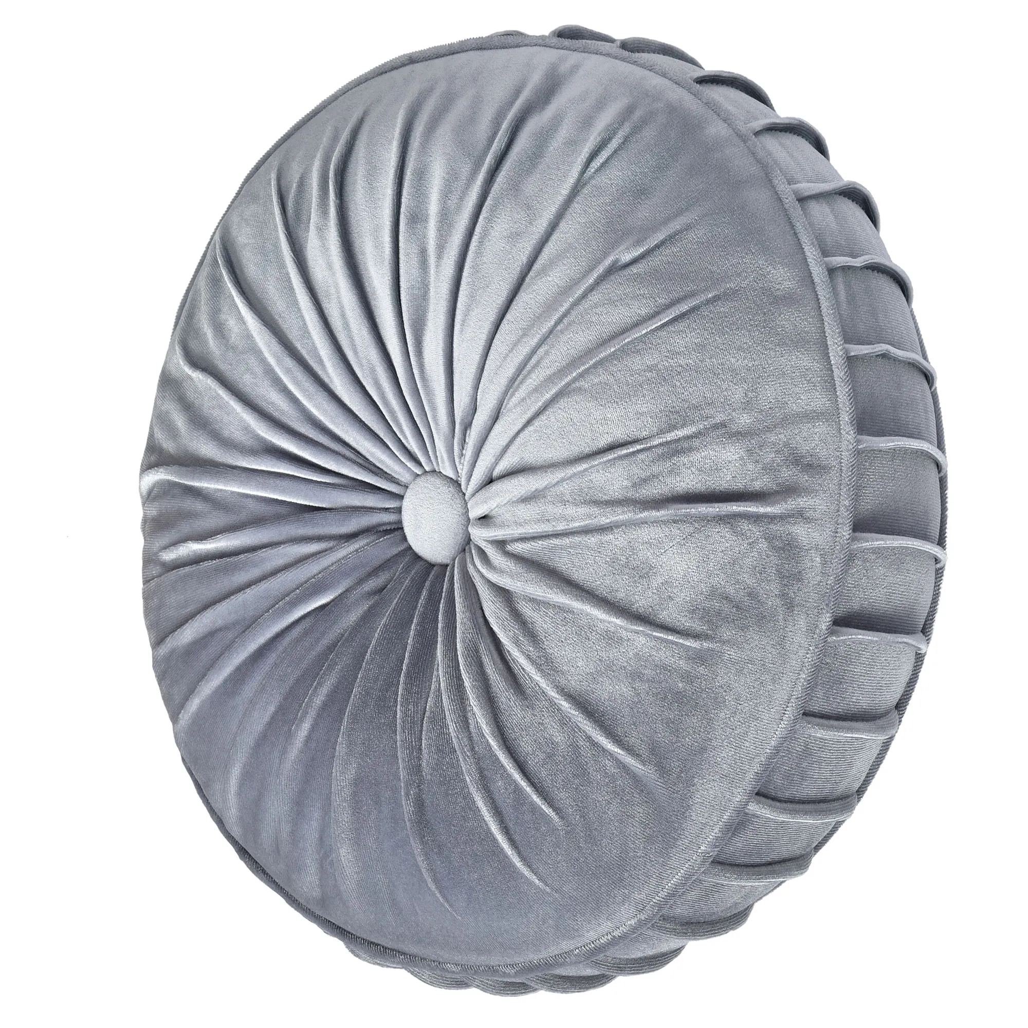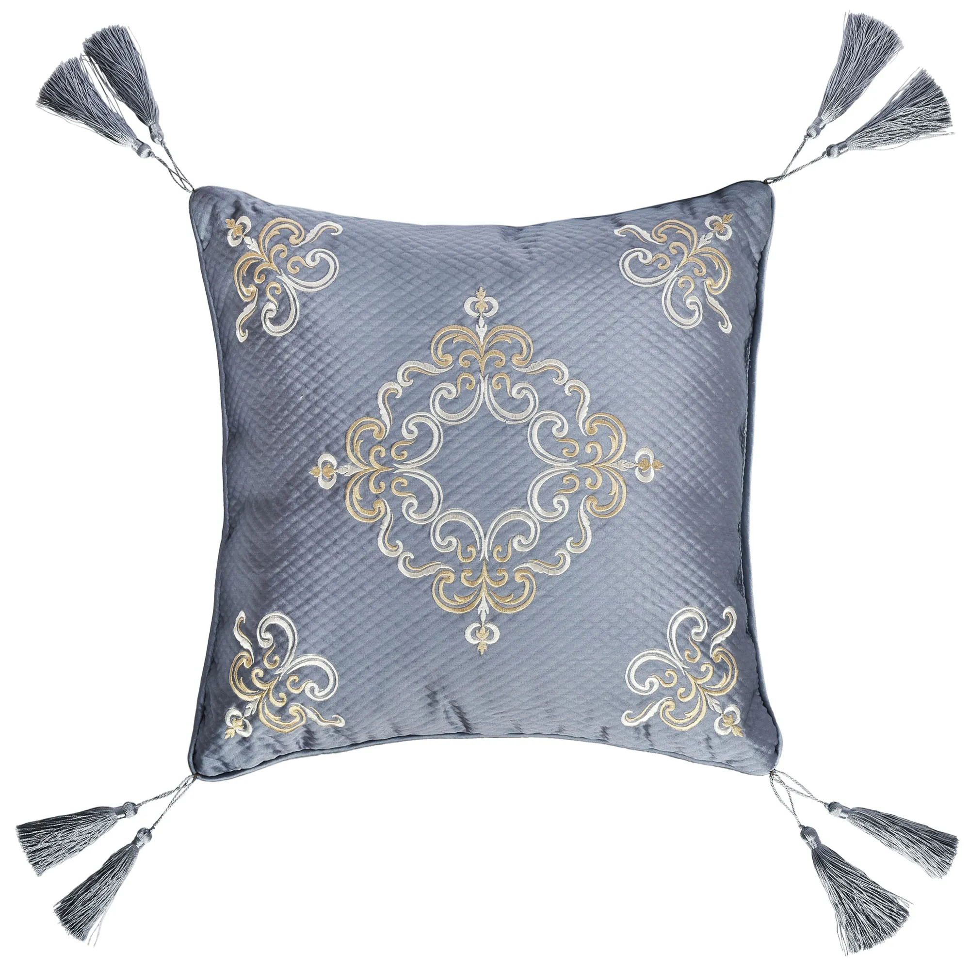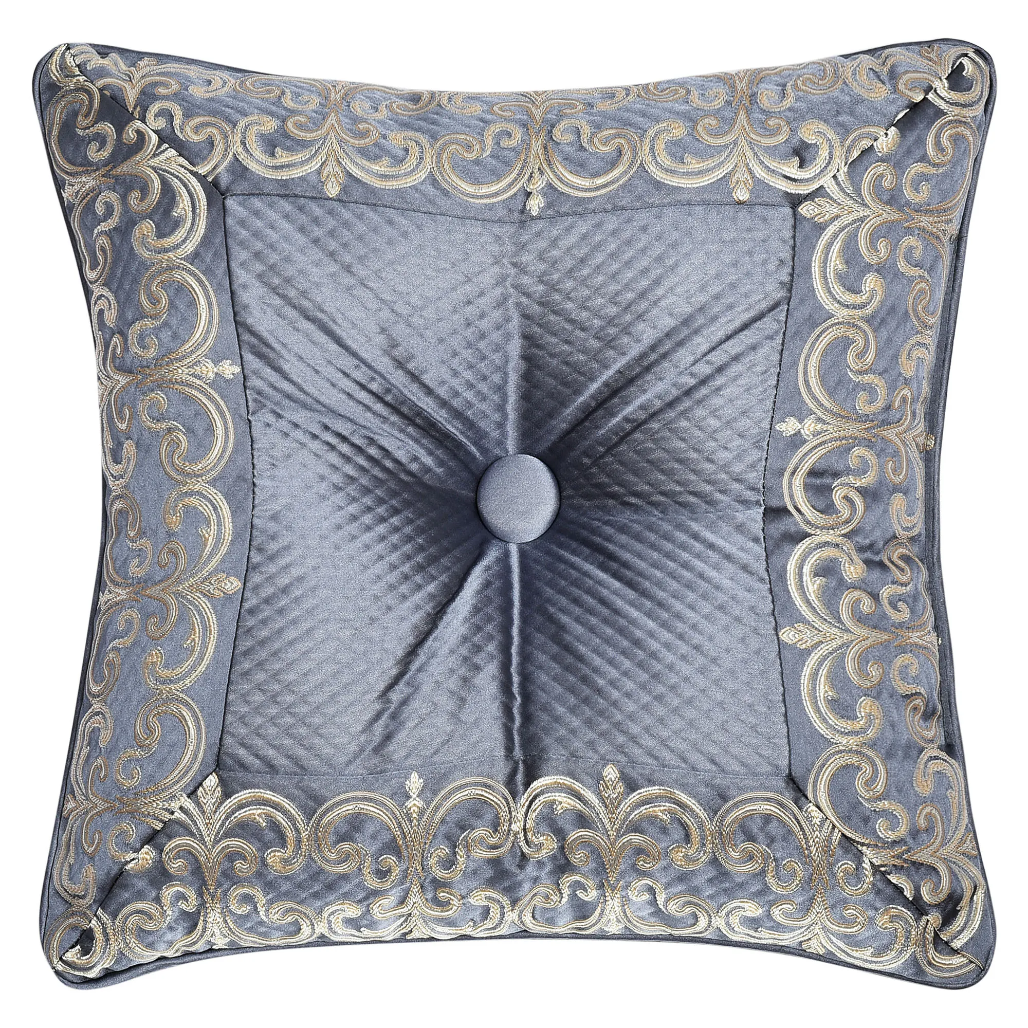 Pillows have piped edges, except the Neckroll. Spot clean. Embroidered Square is textured powder blue with a scrollwork center, corners, and tasseled corners. Tufted Square is textured powder blue framed in a pieced, mitred coordinating scrollwork frame. Rectangle is textured powder blue with scrollwork. Reversible, handmade Round is shirred powder blue velvet with a center button tuft and a 3" side gusset. Neckroll is pinch-pleated powder blue velvet with button-tufted ends.