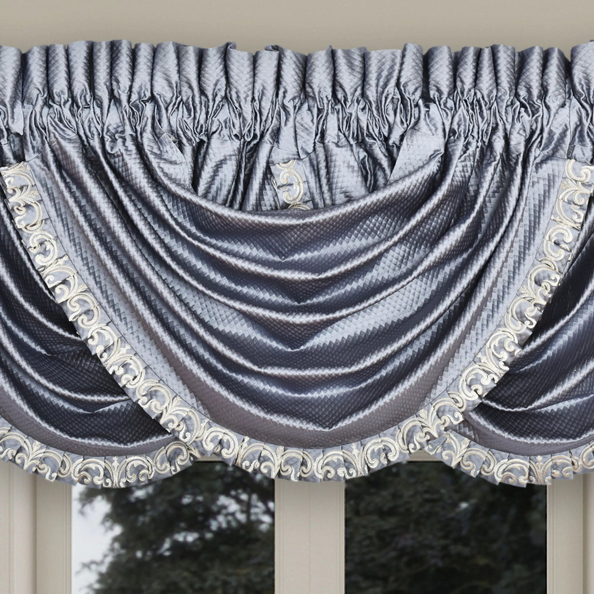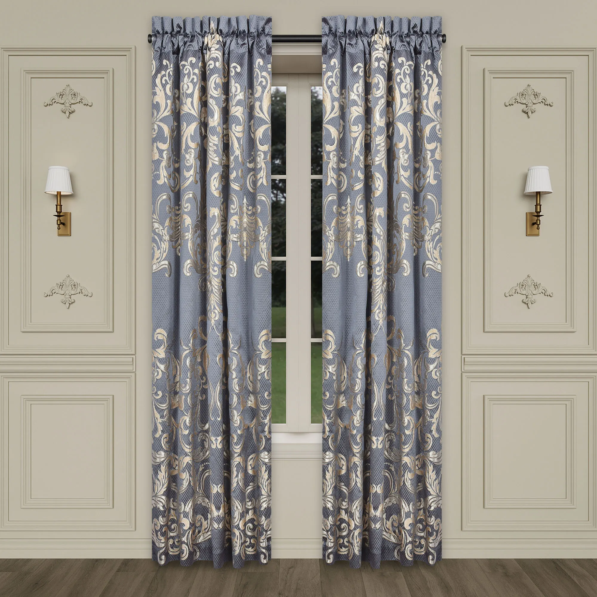 Lined Window Treatment is textured powder blue with 3" rod pockets. Wide Curtain Pair features overscale scrollwork and tailored edges. Tiebacks are included. Curtains are available in two lengths. Each Waterfall Valance has a pleated flange edge with coordinating scrollwork trim. We recommend one valance for every 12"-15" of window width.