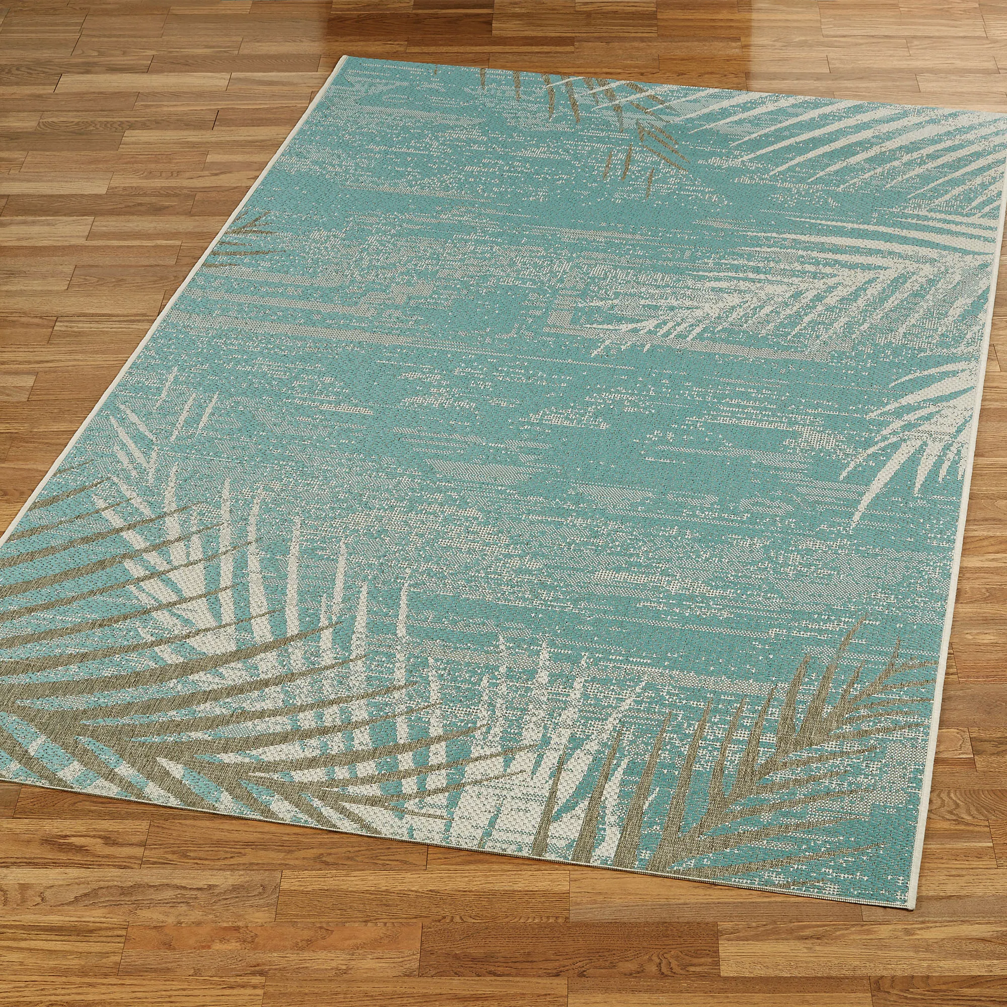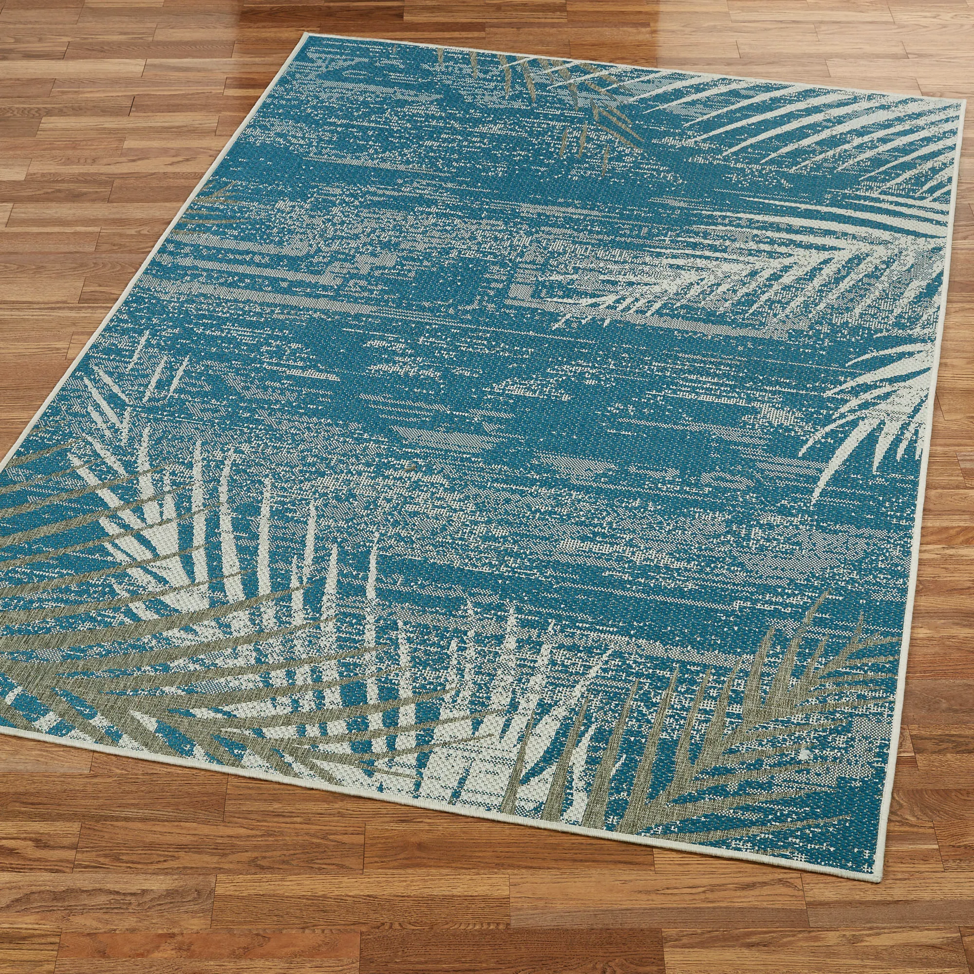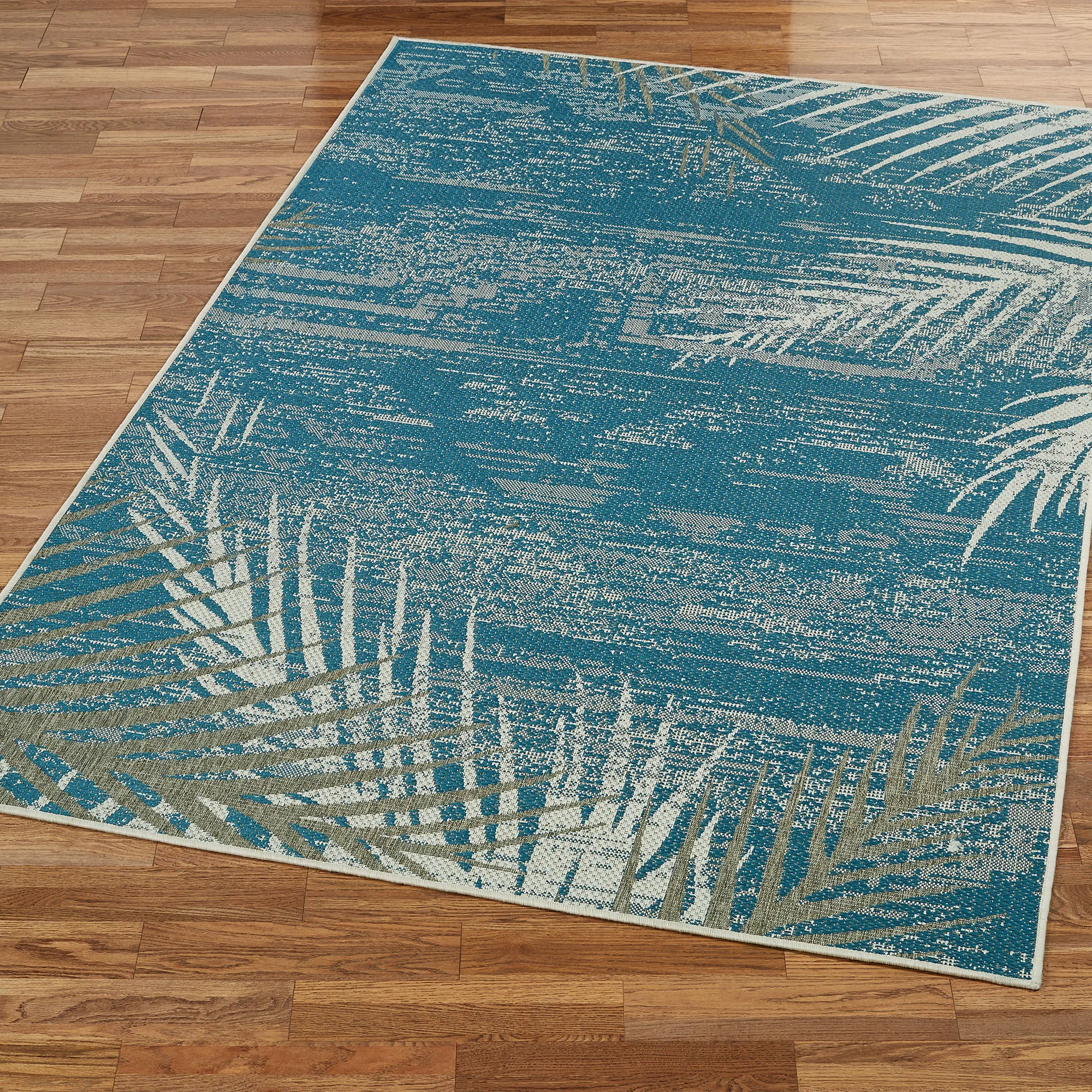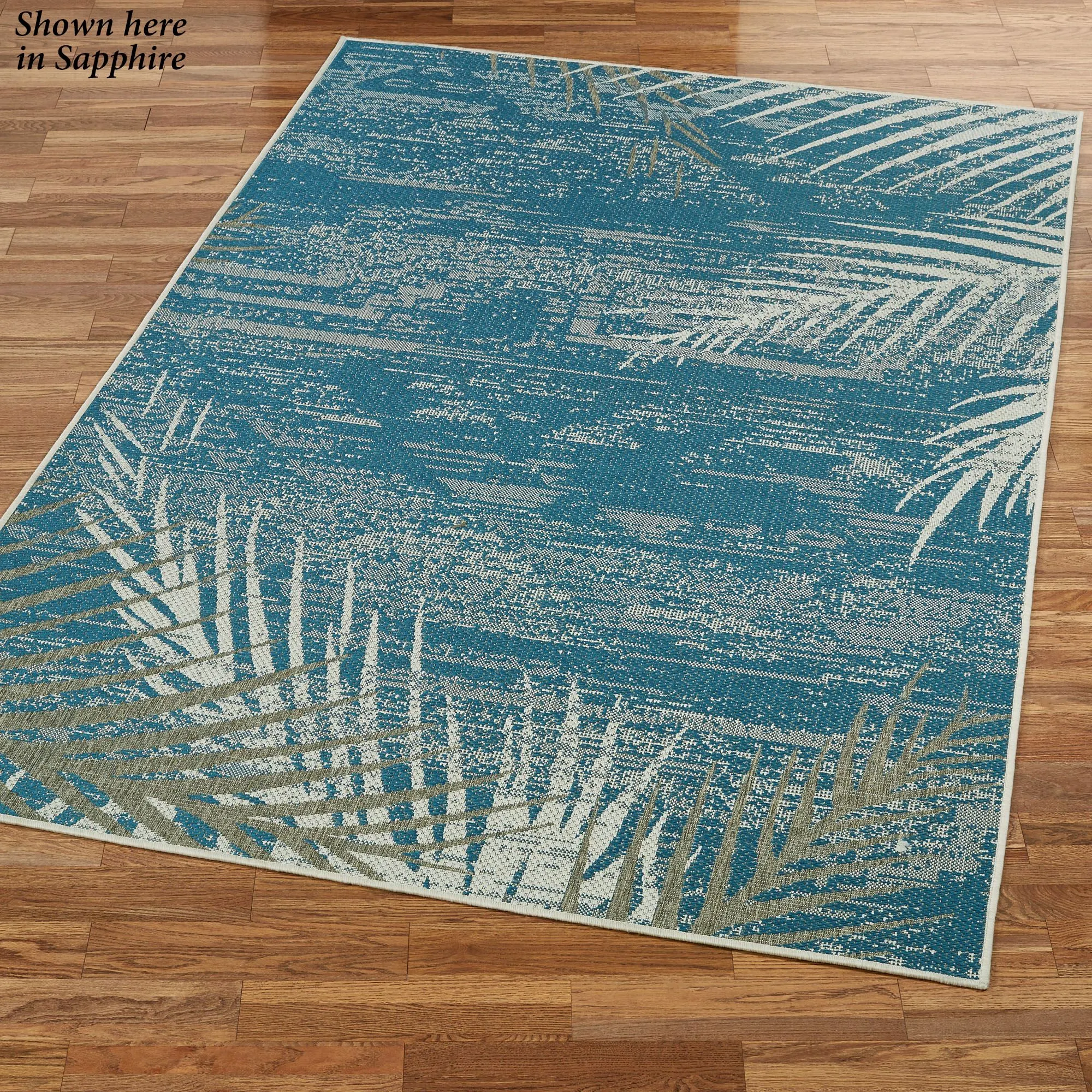 As if glimpsed through the haze of a sunset mirage, the Distressed Palm motifs upon this tropical rug add a vision of paradise to your indoor or outdoor space. Machine-made in a flat-weave, the .125" thick, fiber-enhanced Courtron(TM) polypropylene rug, from Couristan(R), features a variegated aqua or dark sapphire field embellished along the edges with faded light taupe and eggshell palm fronds. Spot clean and rinse with a garden hose; for stubborn stains, we recommend professional cleaning by a rug cleaner. Outdoor seasonal use; do not expose this rug to freezing temperatures. Imported.