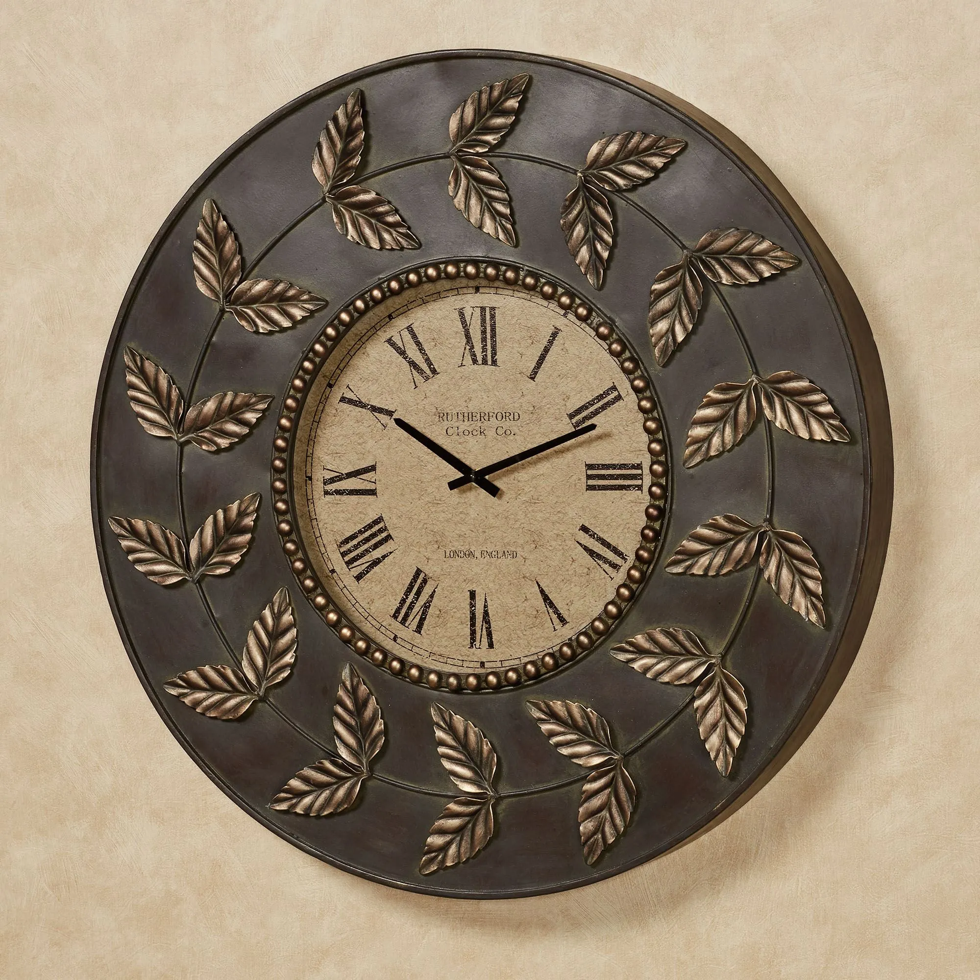 Leaves and an inner bead border circle the Dixon Wall Clock with elegance. Made of metal, this stunning, nature-inspired wall clock has gold designs on a dark brown/bronze background. The antique ivory clock face has black hands and numerals. The clock face has a protective cover. Quartz movement requires one AA battery, not included. Measures 29"dia.x2.5"D; weighs 10 lbs.