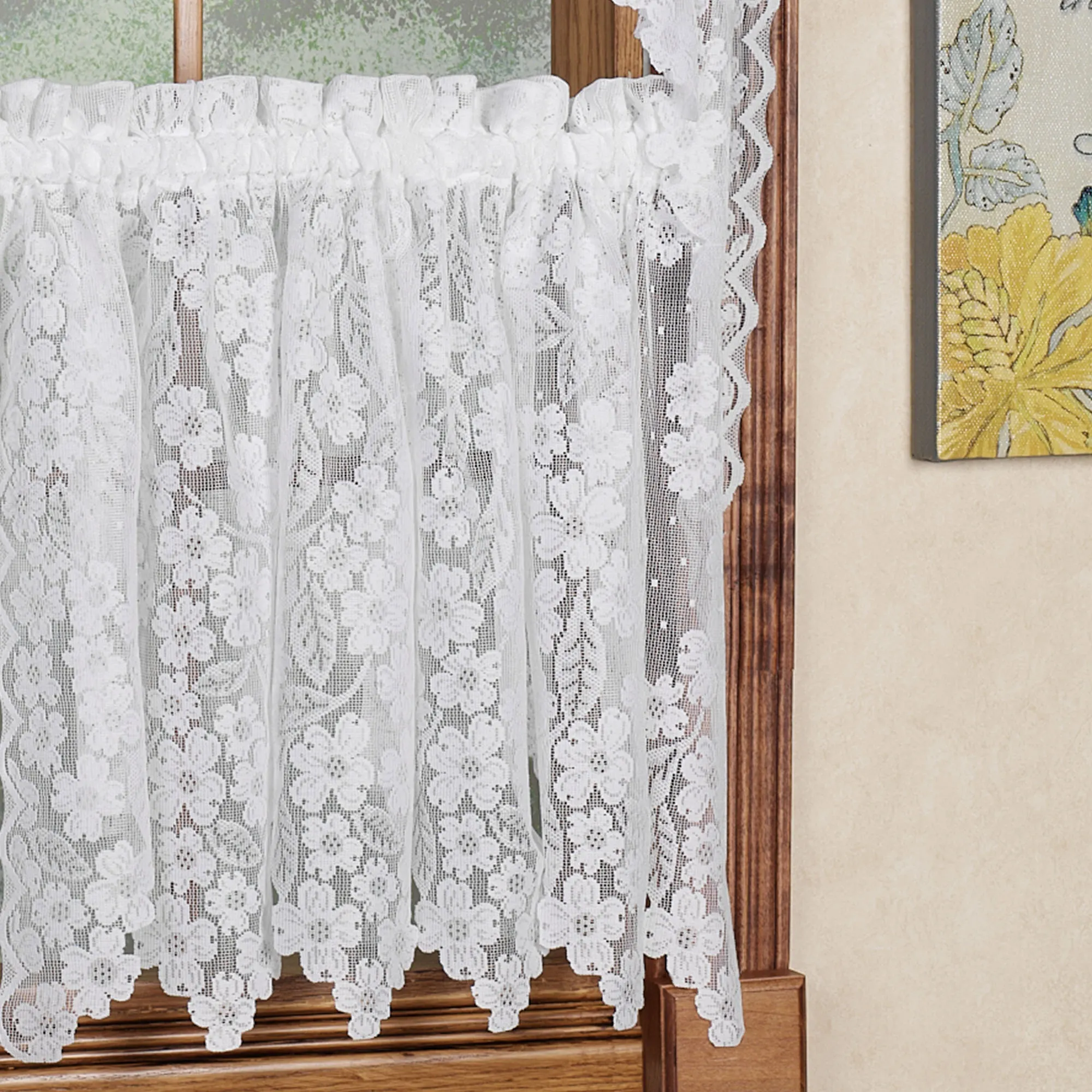 Use the Dogwood Lace Tier Window Treatment to achieve a pretty, yet sophisticated style. Polyester lace tiers and valances have an allover floral design, hand-cut edges, and 1.5" rod pockets. Specify Tier or Insert Valance; sorry, the Swag Valance Pair is no longer available. Machine wash.