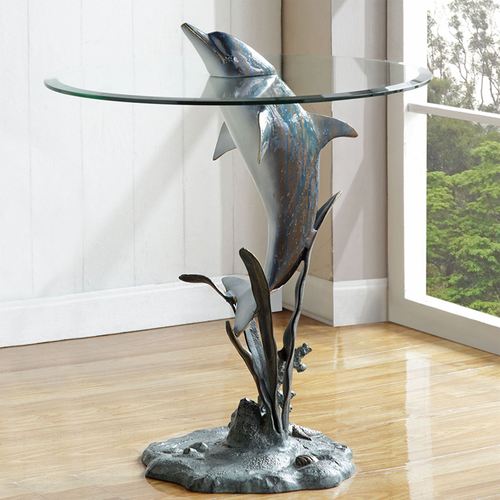 The Dolphin Art Round Accent Table resembles a friend surfacing to say hello. Hand-cast from aluminum, the sculpture features a magnificent dolphin breaking through the clear glass surface of the table top. A hand-rubbed blue and bronze finish details the dolphin, while the seafloor and grasses are verdi and gold. Overall, the dolphin accent table measures 22"dia.x26"H and weighs approx. 13 lbs.