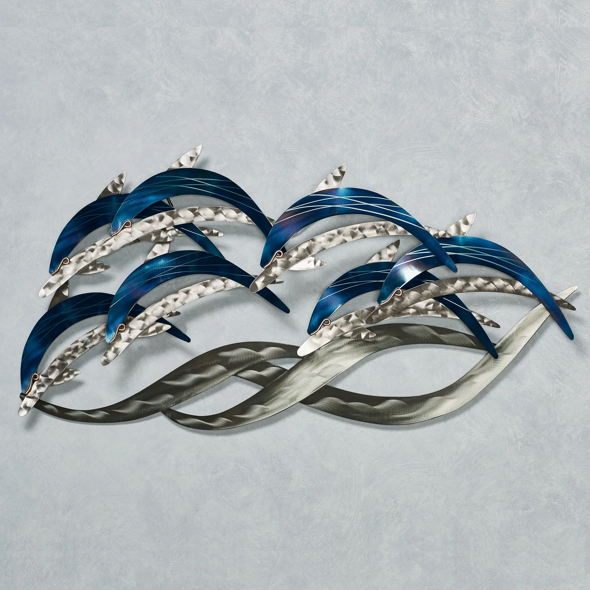 Decorate your wall with one of the sea's most adorable and gregarious creatures. The Dolphin Wave Dancers Wall Sculpture depicts these lively animals as they swim and leap through the ocean waves. Handcrafted from stainless steel, this dolphin wall art is finished with a heat-flamed technique to give it a range of colors, including deep blues and purples. A protective clear lacquer coat gives it a brilliant pearlized shine. 39"Wx4"Dx20"H.
