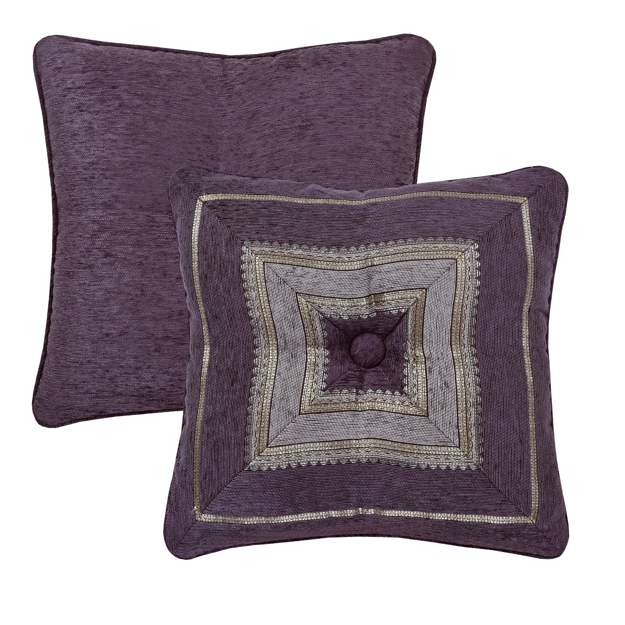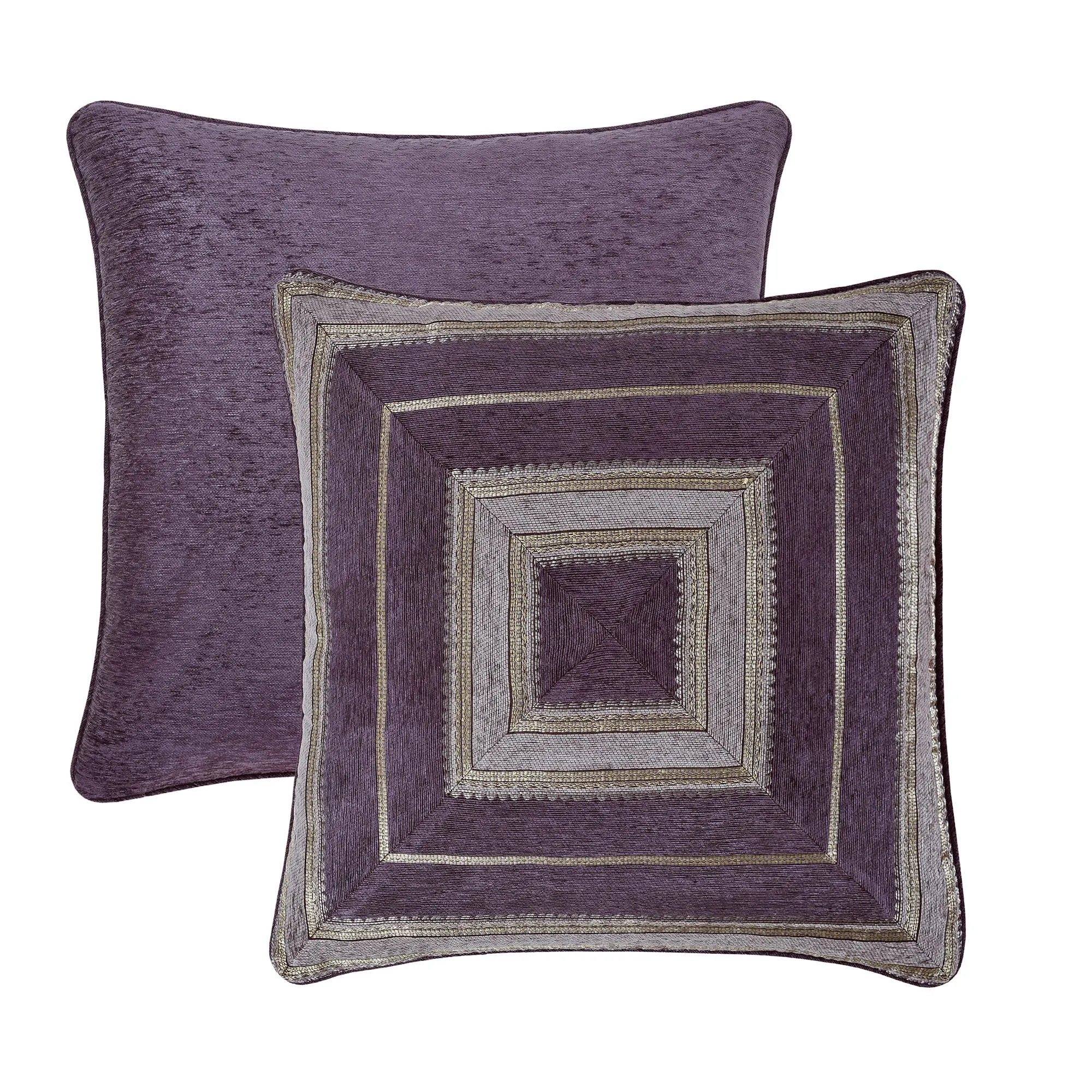The piped European Sham has a mitred face with chenille and gold stripes and a zipper closure; reverse is grape chenille.