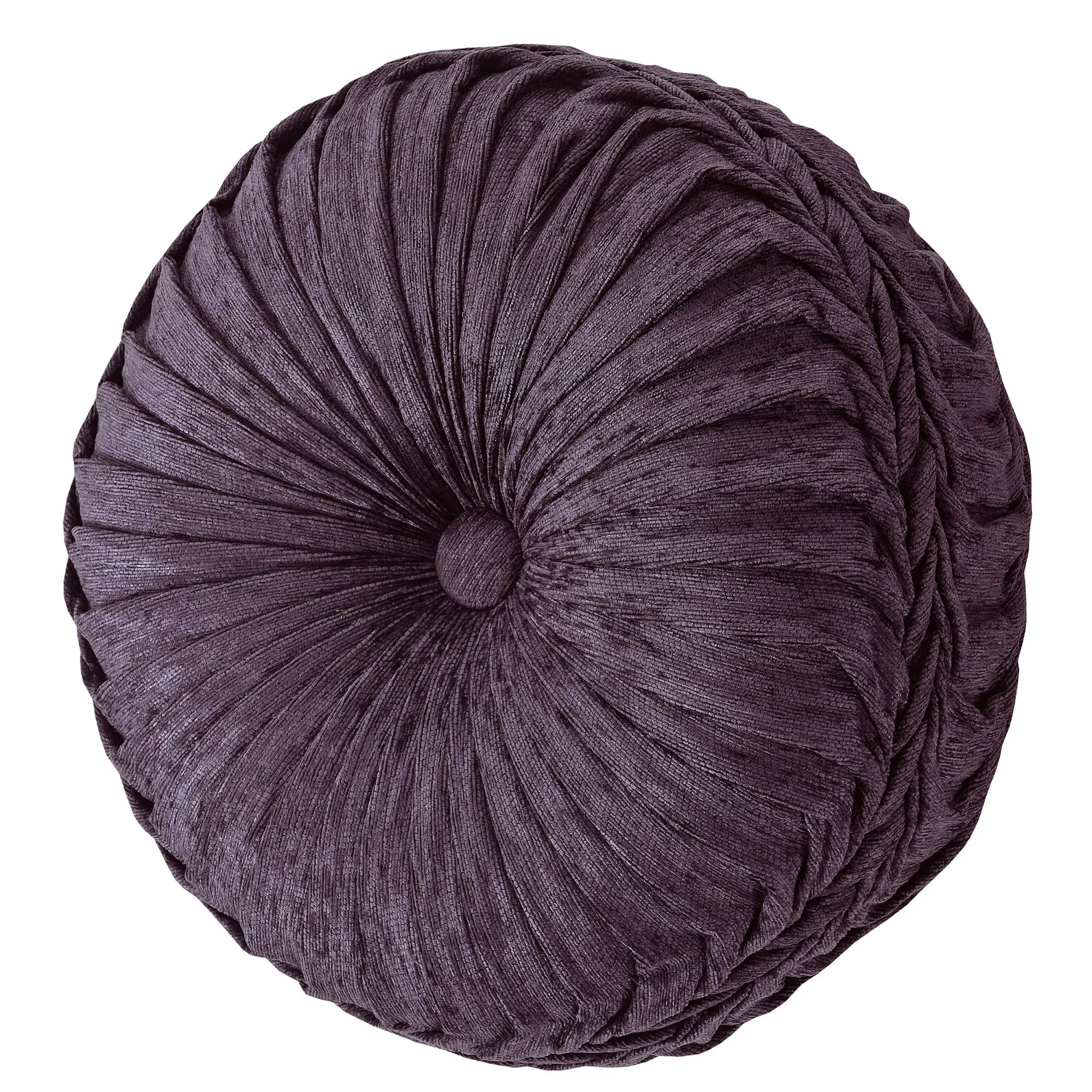 Pillows: Spot clean. The pieced Rectangle has damask jacquard, chenille and gold stripes, gimp trim, and a pleated flange on the length ends; reverse has chenille and gold stripes. The piped Tufted 18" Square has a mitred face with stripes and a central button tuft; reverse is solid grape chenille. The piped 20" Square has damask jacquard and chenille; reverse has chenille and gold stripes. The reversible, handmade grape Round has chenille pleats, a central button tuft, and a 3" side gusset.
