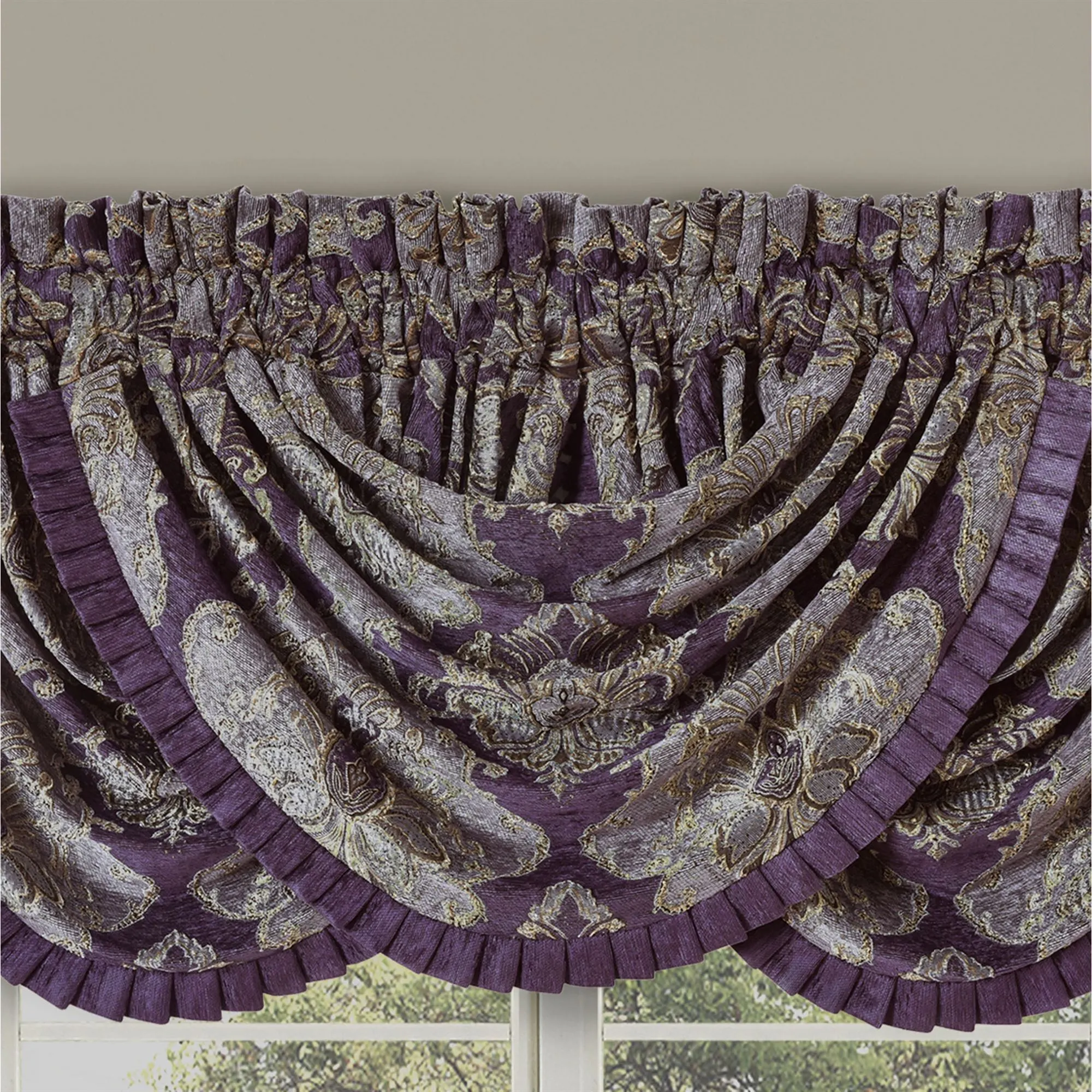 Lined Window Treatment has damask jacquard, chenille, and 3" rod pockets. The tailored Wide Curtain Pair includes tiebacks. Curtains are available in two lengths. Each Waterfall Valance has a chenille pleated flange on the ends. We recommend one valance for every 12"-15" of window width.