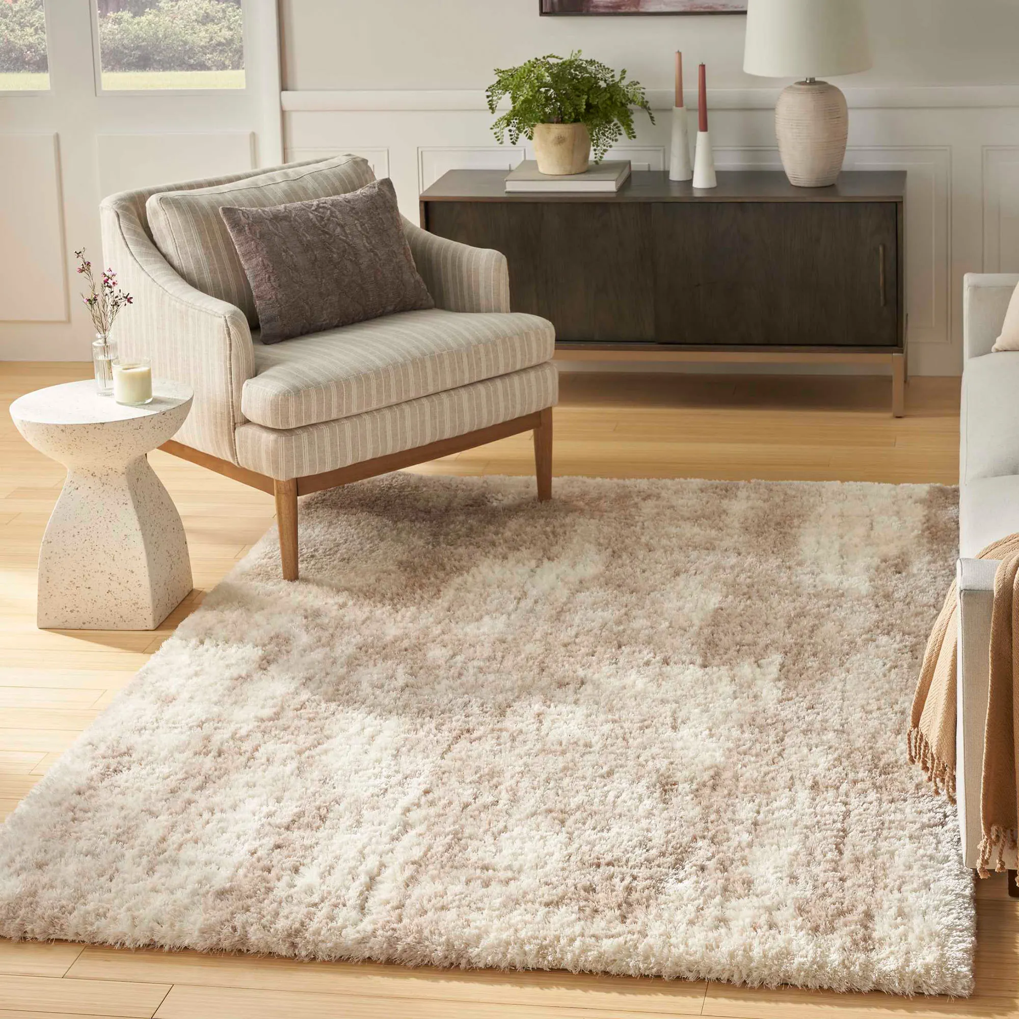 Sink into the dream-like plushness of the Donatella Rug. Power-loomed from polyester, the 1.58" thick, shag-style area rug features soothing ivory and beige neutral hues in an abstract, marbled, ultra-plush design with serged edges. Backing is jute. We recommend professional cleaning by a rug cleaner. Imported.