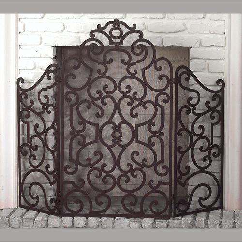 Swirling scrolls beautifully accentuate the Donovan Fireplace Screen. Made of metal with an antique dark brown finish, this trifold panel fireplace screen, by Dr. Livingstone, I Presume, was forged by master craftsmen, hand-finished with a multistep process, and features a stately design. Backing is mesh. Measures 48"Wx0.5"Dx41"H; weighs 18 lbs.