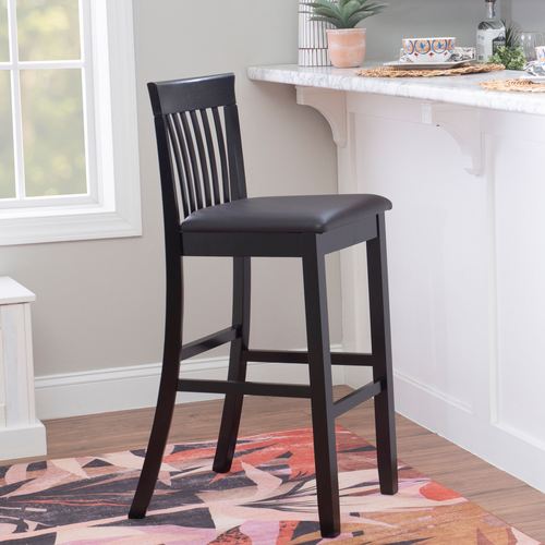 Add comfortable, chic seating to your eating area with the Dorian Kitchen Stool. Finished in black, the wood stool features classic Mission styling, sleek lines, an openwork slatted back, a convenient footrest, and a foam-cushioned, black faux leather upholstered seat. Perfect for bar heights of 41"-43", each Bar Stool has a 31" seat height, measures 17"Wx21"Dx42.5"H, and weighs approx. 18 lbs. Perfect for counter heights of 35"-39", each Counter Stool has a 24" seat height, measures 17"Wx19.5"Dx37"H, and weighs approx. 16 lbs. Wipe the seat clean.