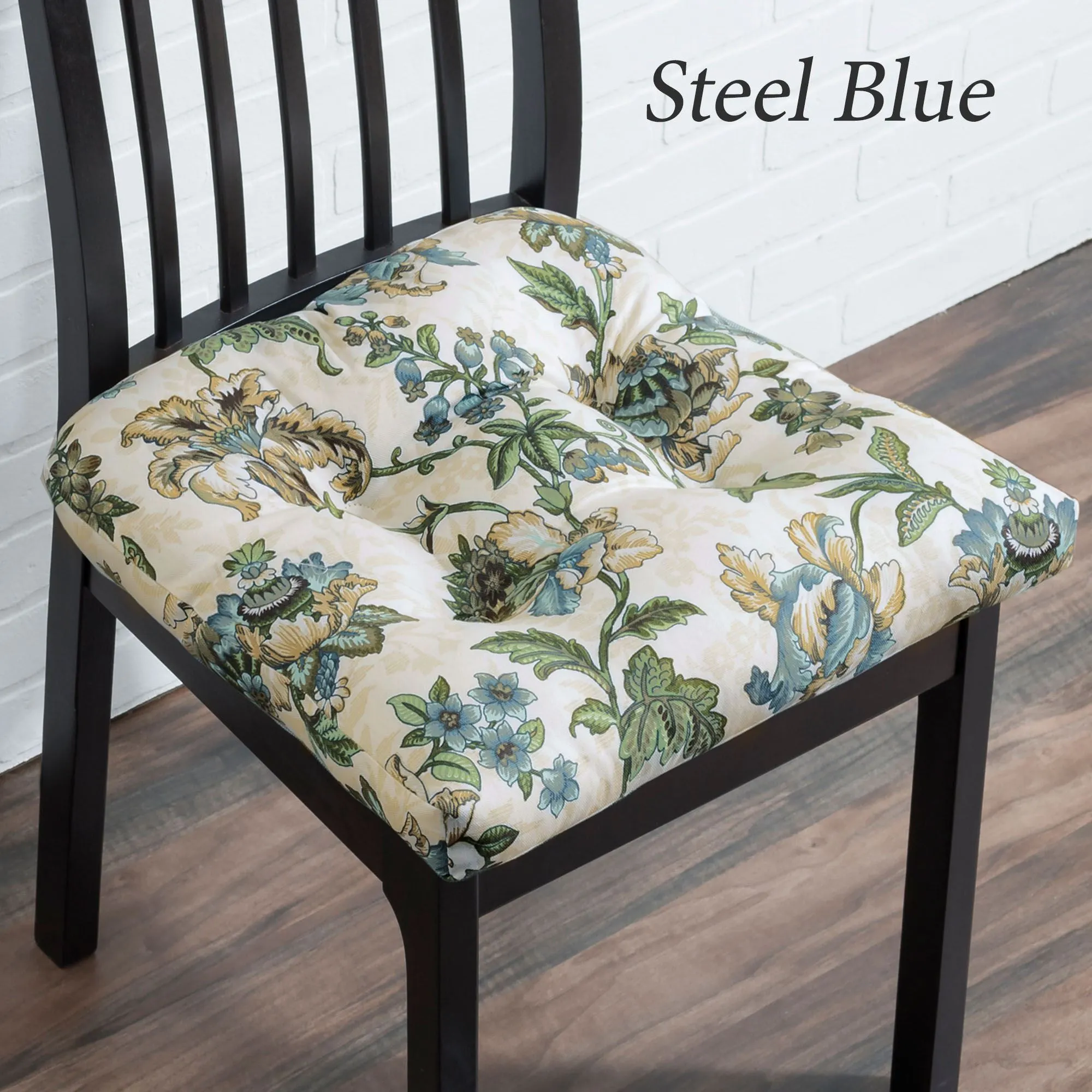 The Dorset Chair Pad exudes timeless charm. Jacobean florals bloom and vine across the off-white cotton/polyester blend design. Crimson has shades of pink, antique gold, green, and brown. Steel Blue contains hues of seafoam, antique gold, gray, brown, and green. Chair pad has a tufted design with a nonskid bottom. Fill is viscoelastic. Sold individually, each measures 18" sq. Spot clean. Made in Pakistan.