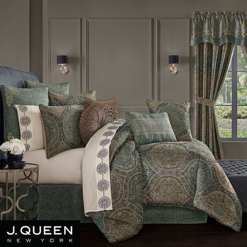 Adorn your bedroom with the elaborate beauty of the Dorset Comforter Bedding from J. Queen New York. Oversized, jacquard-woven polyester comforter features floral ogee medallions in soothing shades of almond, ivory, and black upon rich chenille grounds of soft teal and almond. Comforter is finished with piped edges and an almond polyester back. Bedding fill is polyester. Dry clean only. Imported.