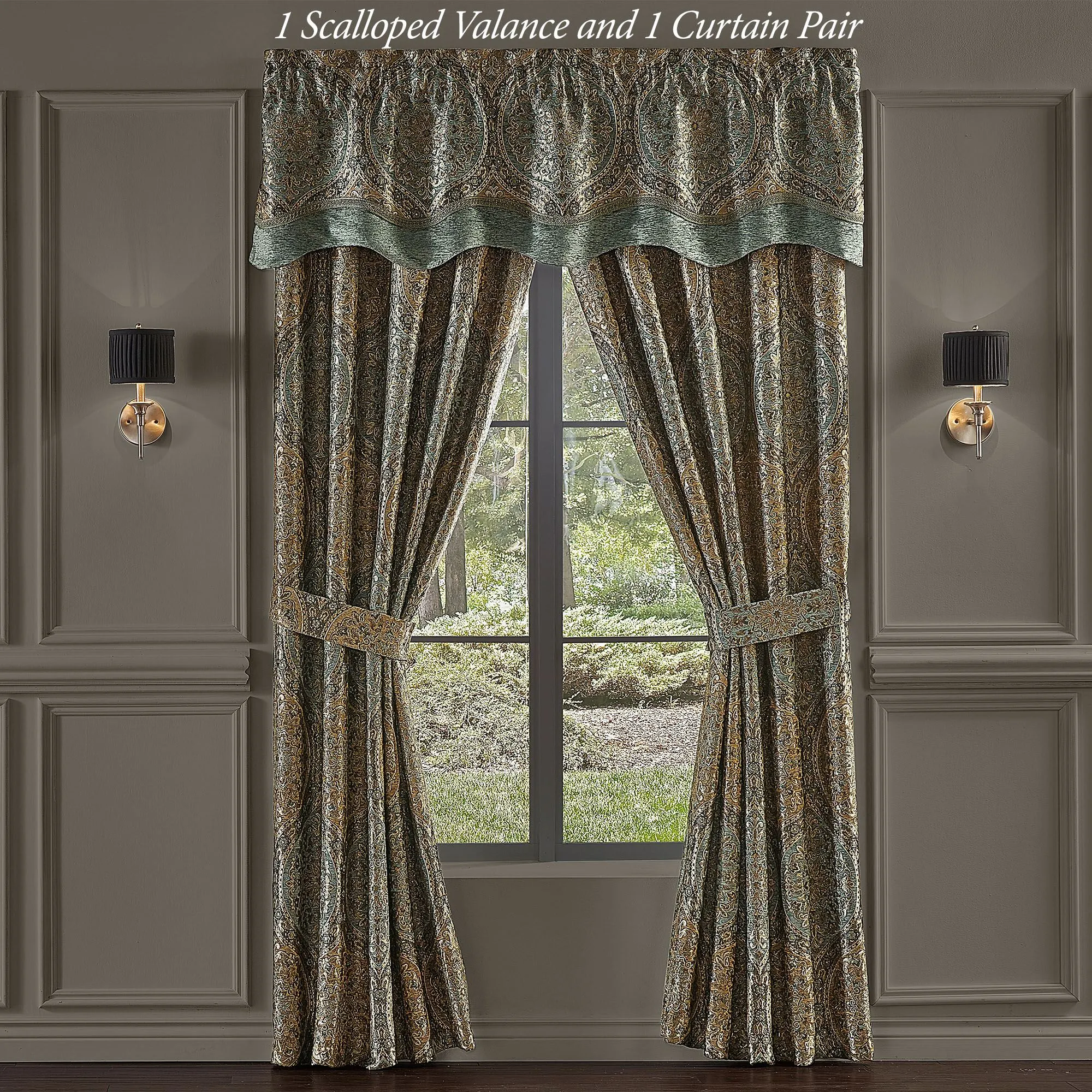 Window Treatments have ogee medallions and 3" rod pockets. The lined Wide Curtain Pair has tailored edges and includes tiebacks. Scalloped Valance is pieced at the bottom with gimp trim and soft teal chenille.