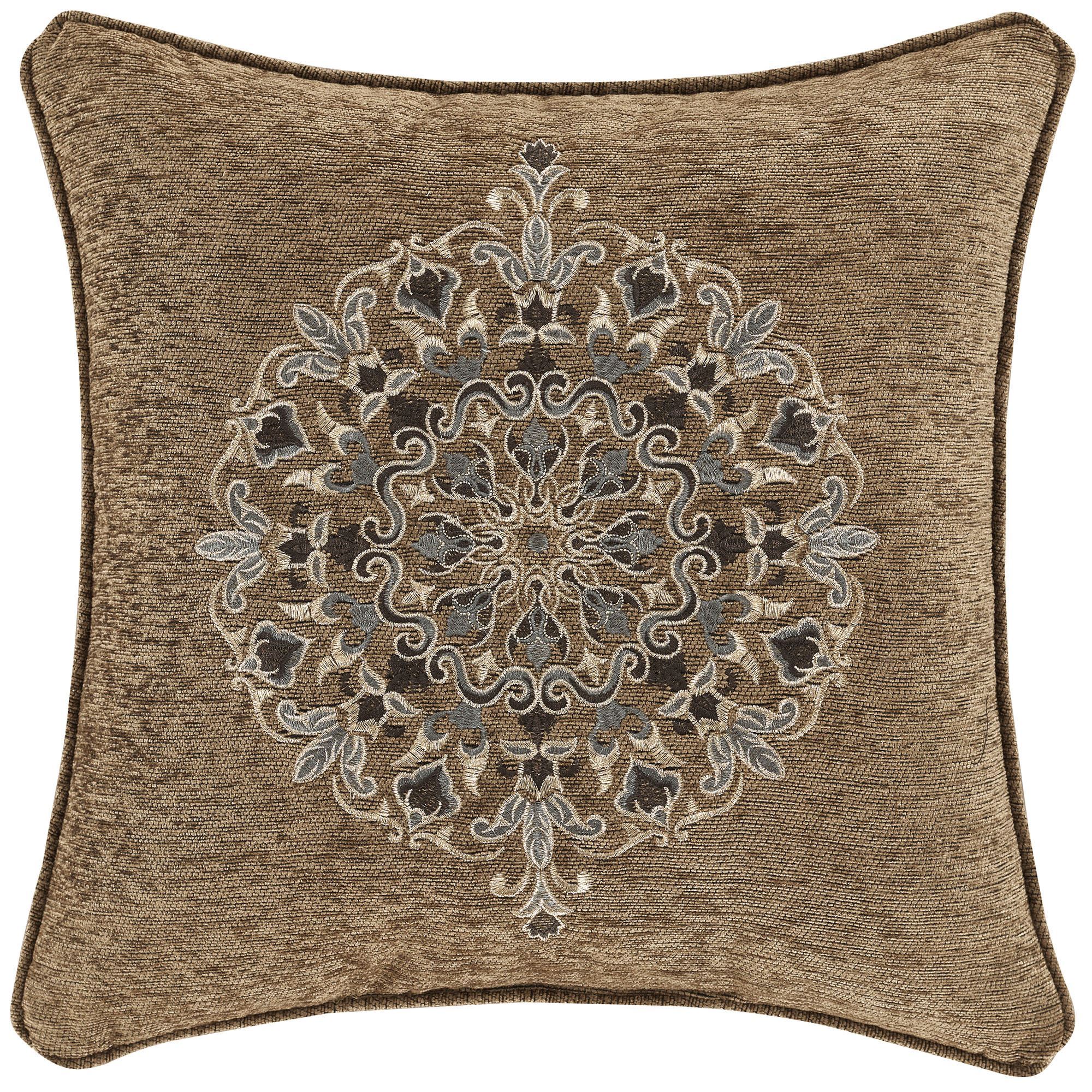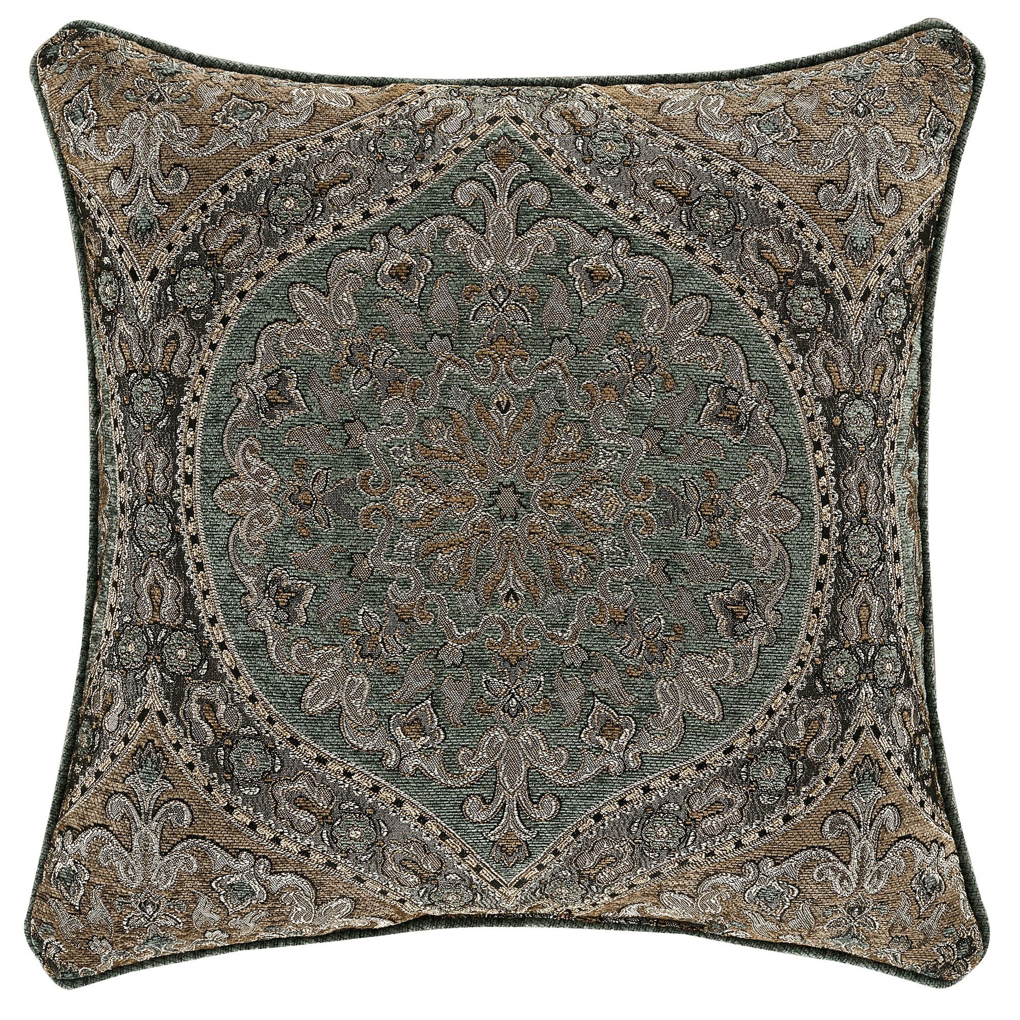 Pillows: Spot clean. The piped Jacquard 20" Square has an ogee medallion design. The piped Embroidered 18" Square is almond chenille with a coordinating embroidered medallion. Tailored Rectangle is soft teal chenille embroidered with an almond medallion band and finished with gimp trim and beaded tassel ends. Reversible handmade Round is pleated almond chenille with a center button tuft and a 3" side gusset.