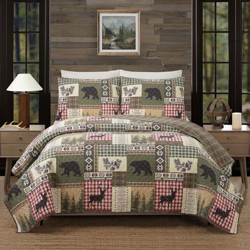Stay at the Dorset Lodge for an unforgettable wilderness adventure. This rustic cotton bedding, from Modern Heirloom, features printed designs including bears, deer, pine cones, pine trees, plaid, and abstract motifs. Colors include shades of sage, light cream, dark beige, black, and burgundy. The Mini Quilt Set includes a quilt and sham(s). Quilt has diamond quilting and bound ends; reverses to a plaid print with diamond quilting. Fill is polyester. Machine washable. Imported.