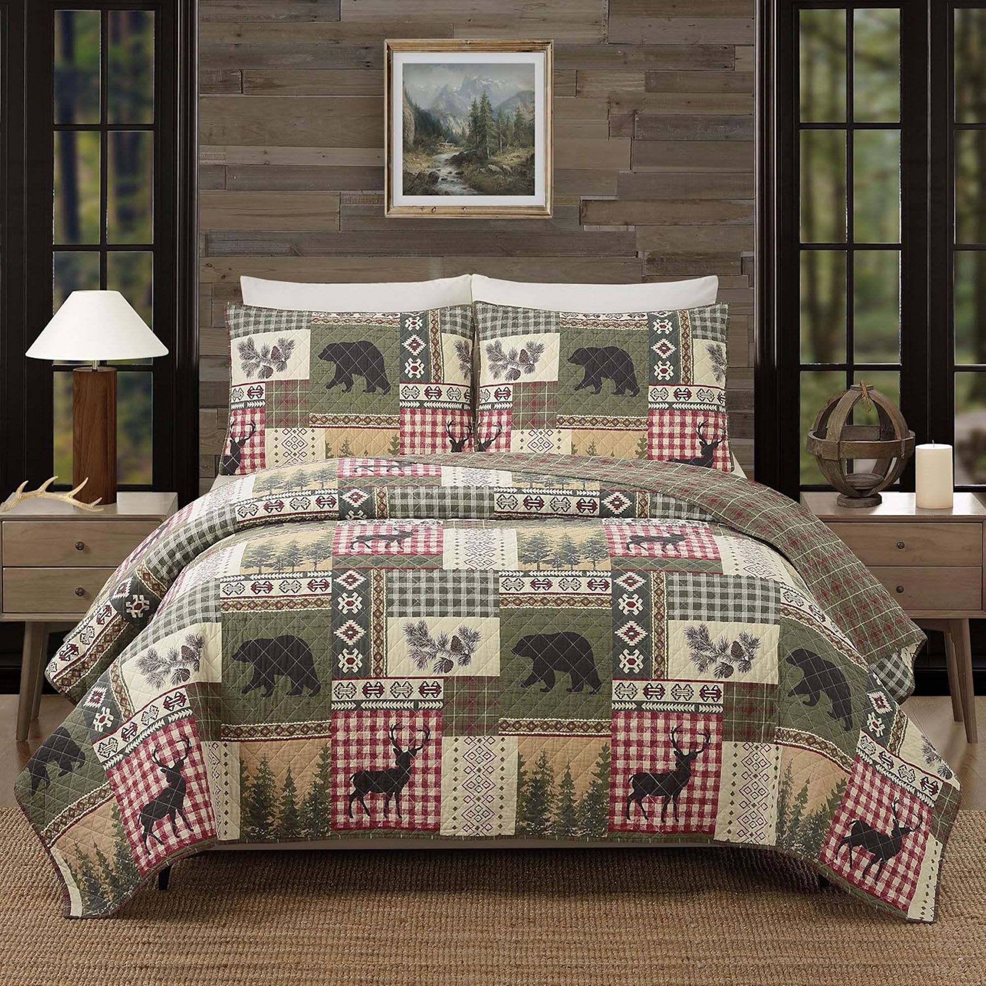 • Rustic bedding features plaid, wildlife, pine cones, and trees