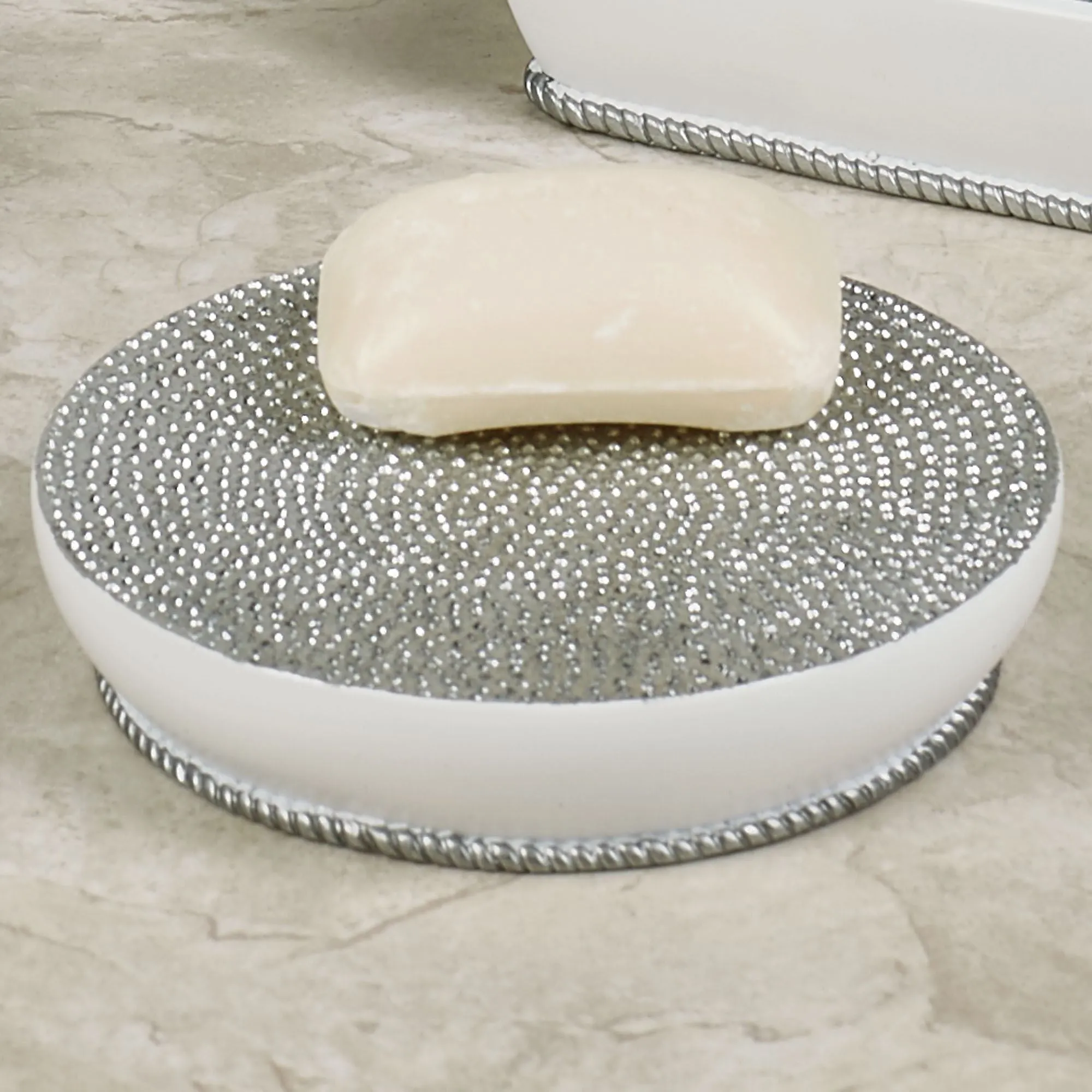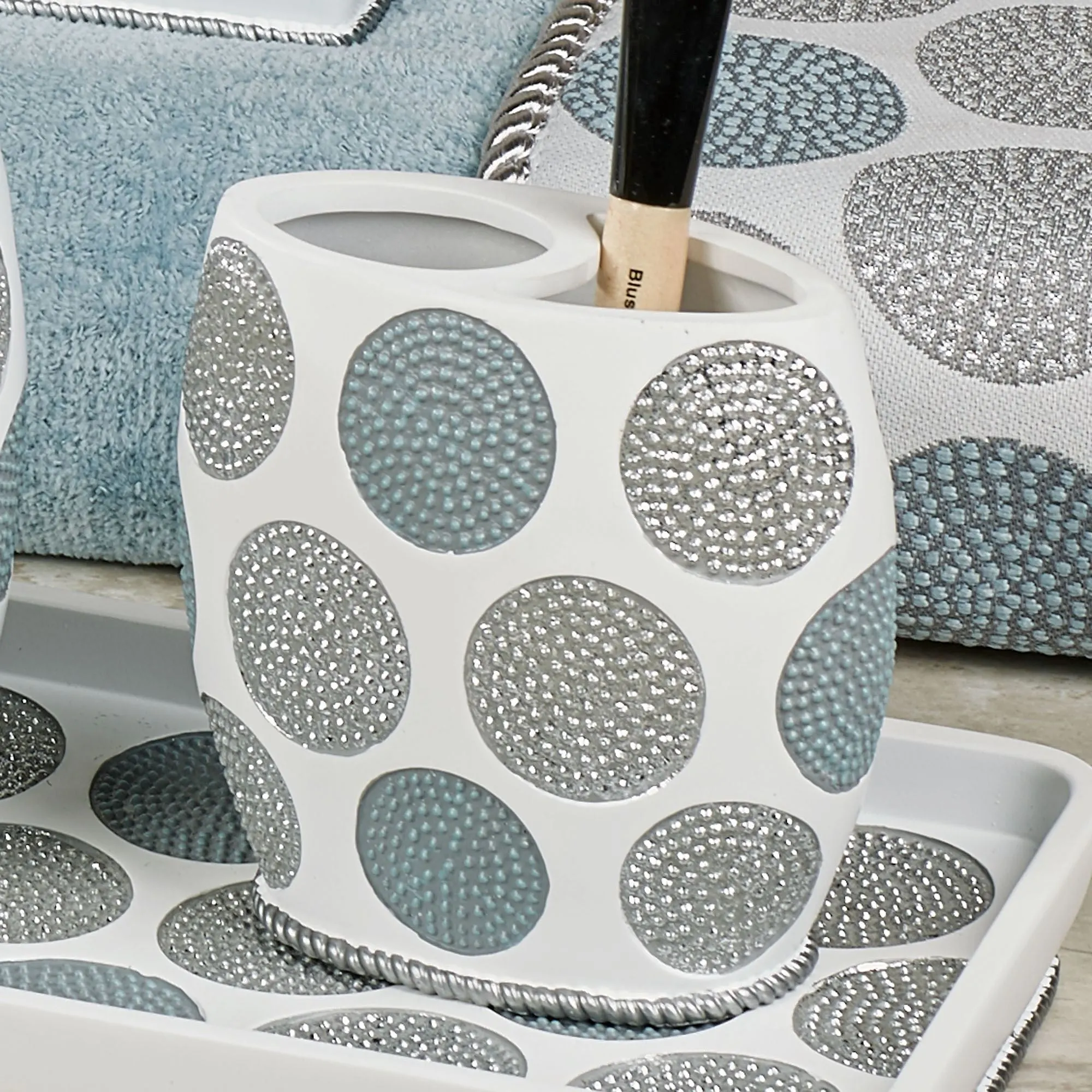 Polished with texture and sparkle, the Dotted Circles Bath Accessories radiate a contemporary sweetness with a lavish glimmer. Each off-white resin accent, trimmed in twisted edges, features handpainted large dots in hues of dark gray, glacier, and silver glitter; except the Soap Dish, which resembles a large silver and gray dot. The toothbrush holder can be used to hold your toothbrushes or makeup brushes. Specify Wastebasket, Covered Jar, Soap Dish, Brush Holder, or Tray; sorry, the rest of the accessories are no longer available.