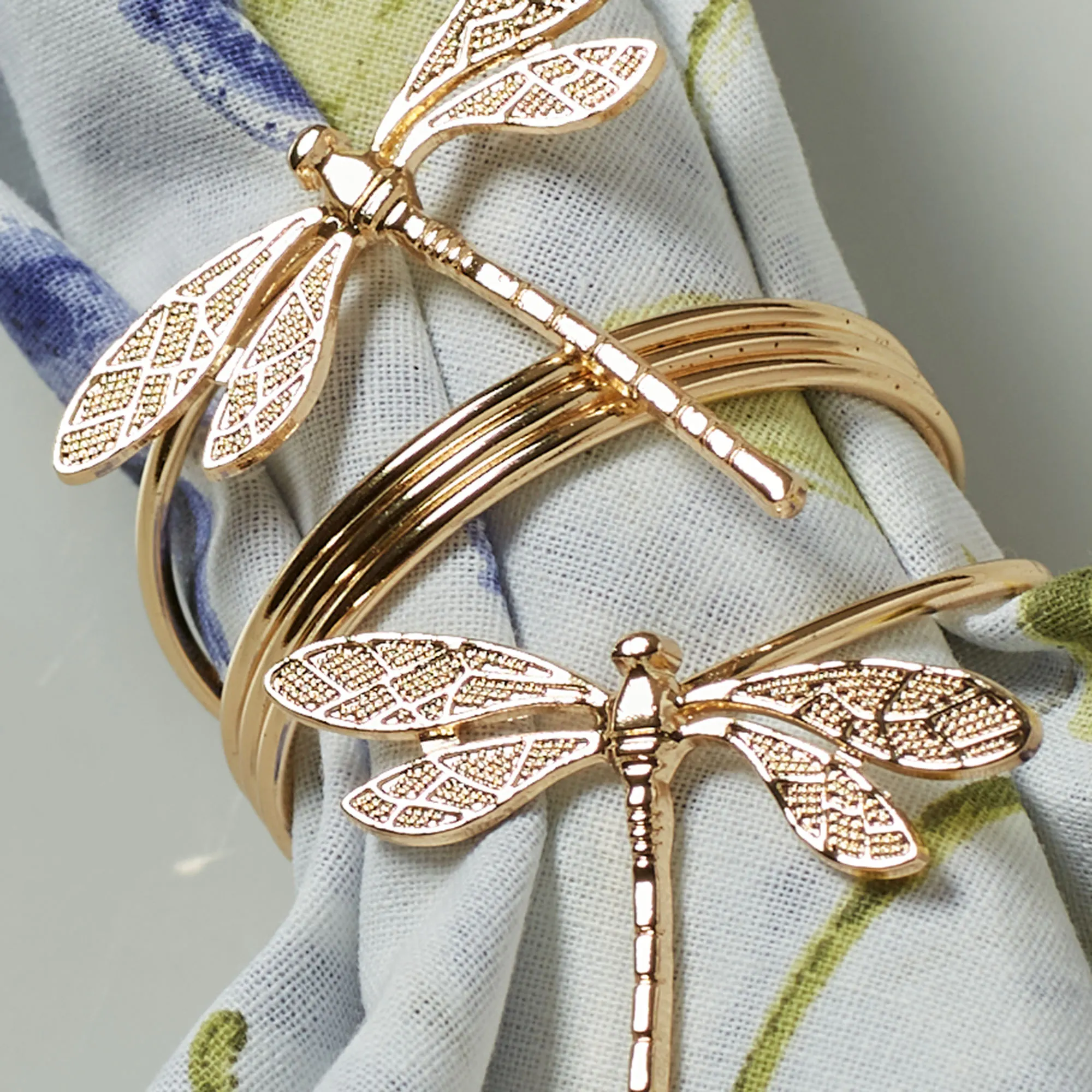 Even Dragonflies request a seat at your lovely dining table spread. Crafted from metal, each gold-finished napkin ring in this set features two dimensional dragonflies with detailed wings and bodies. The nature-inspired table accessories add a whimsical charm and have a 1.5" dia. ribbed center ring. Each measures 2"Wx1.5"Dx3"H.